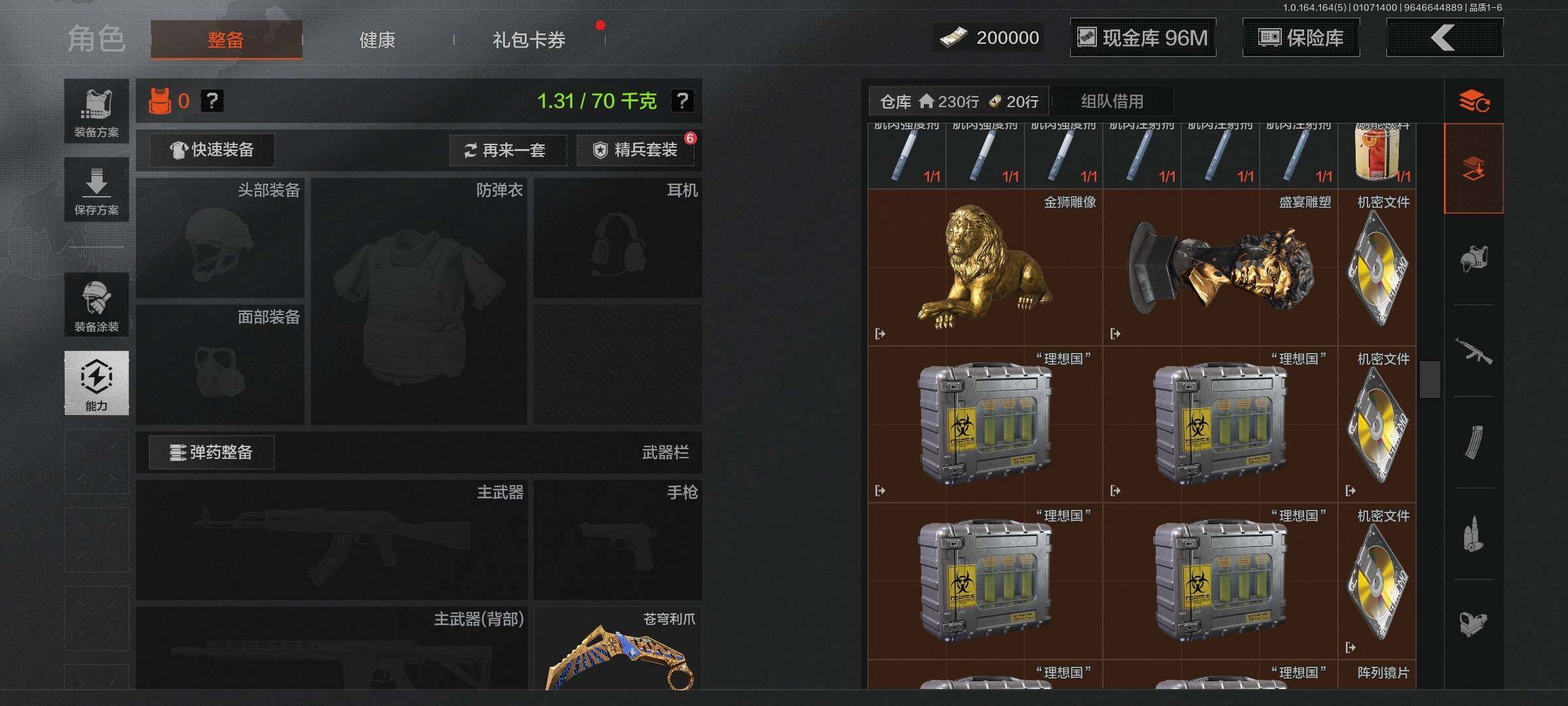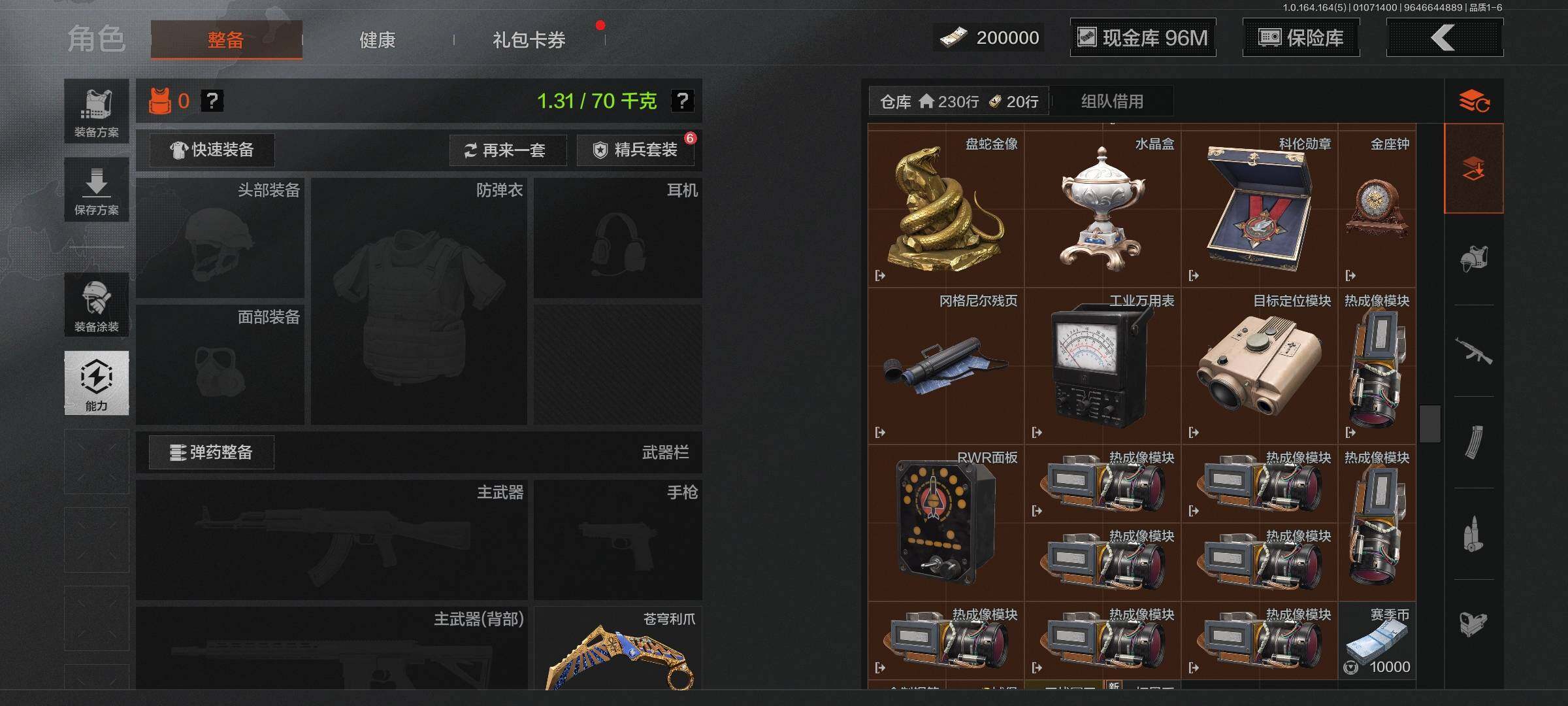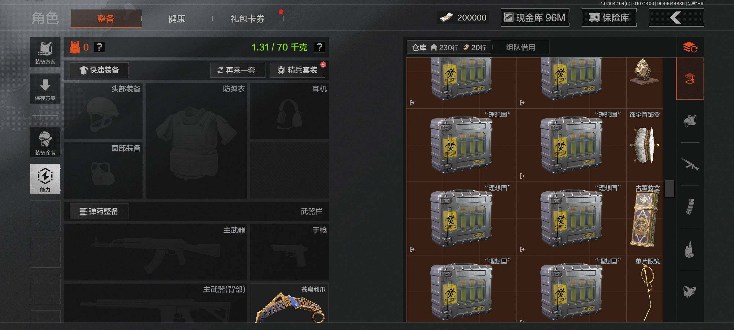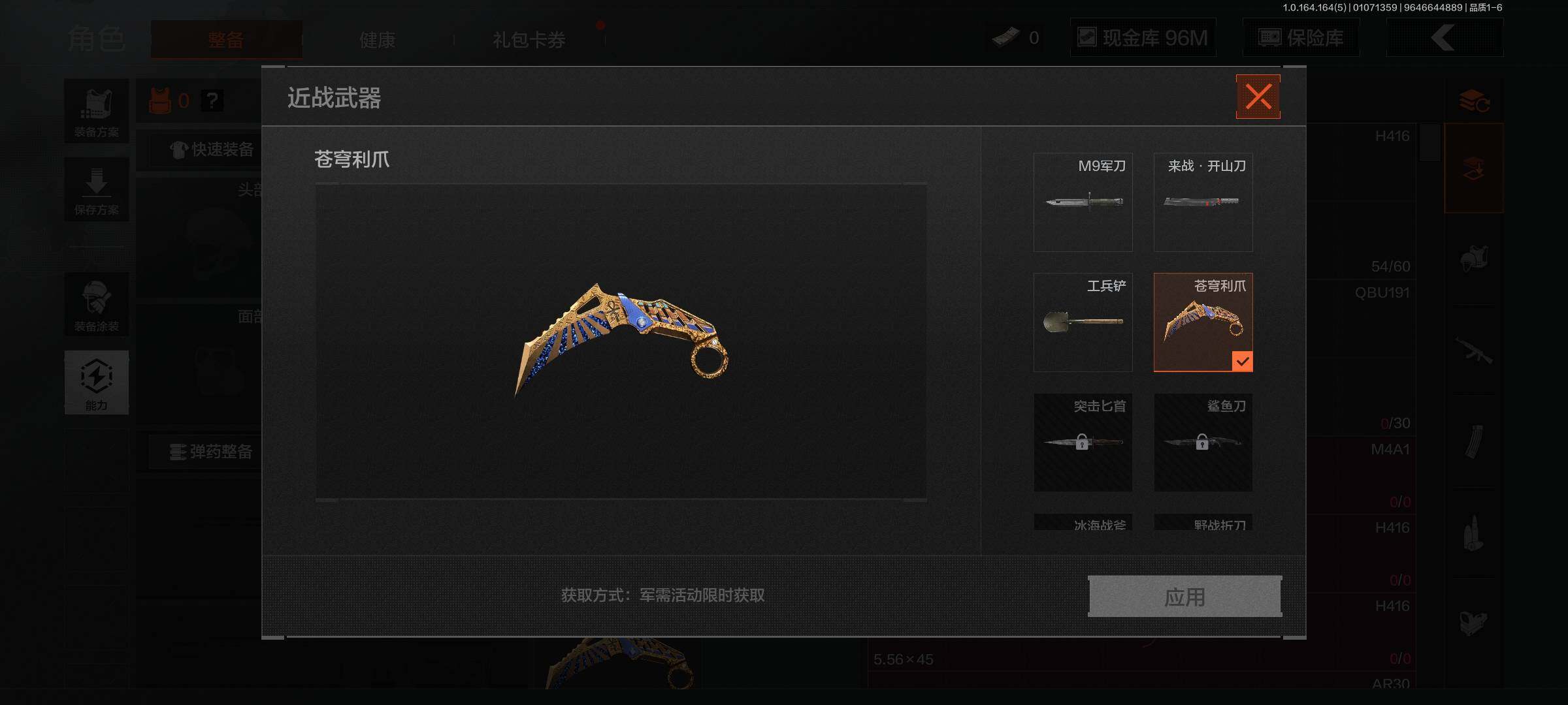 仓库价值(百万):164/柯恩币:96378908/苍穹利爪/来战开山刀/工兵铲