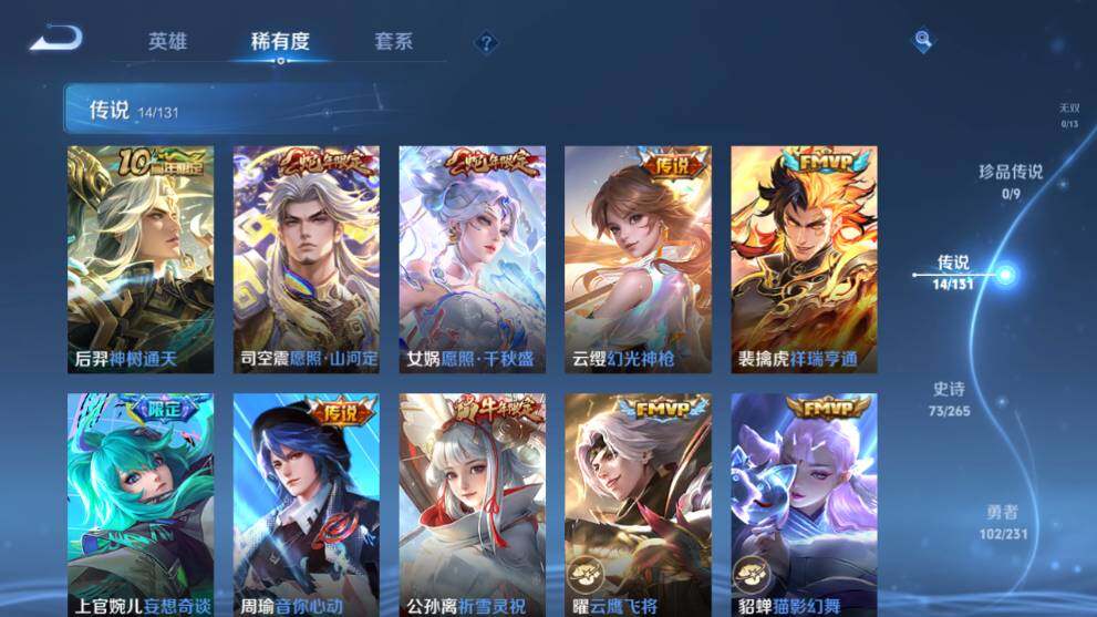 【传说】后羿神树通天,司空震愿照山河定,女娲愿照千秋盛,云缨幻光神枪,裴擒虎祥瑞亨通,上官婉儿妄想奇谈,周瑜音你心动,公孙离祈雪灵祝,曜云鹰飞将,貂蝉猫影幻舞,干将莫邪久胜战神,达摩黄金狮子座,孙尚香末日机甲,宫本武藏地狱之眼