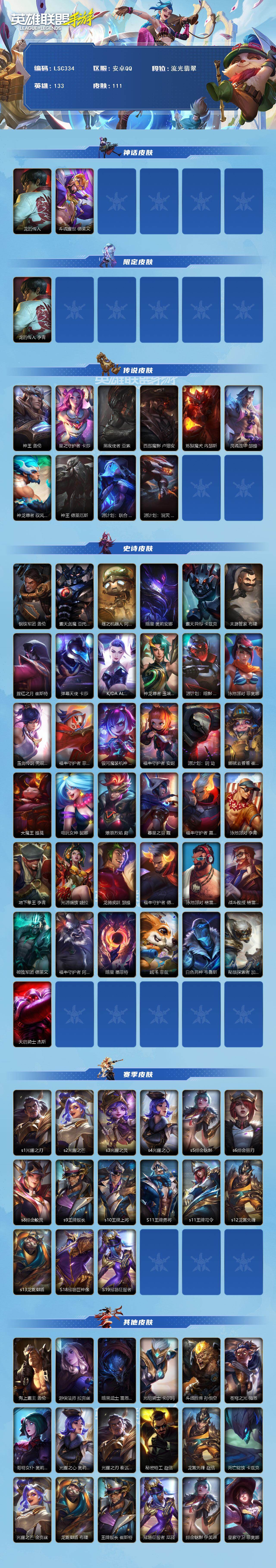 【LSC334】133英雄/111皮肤/2神话/10传说/37史诗/流光翡翠/龙的传人 李青/斗魂耀世 德莱文/神王 盖伦/星之守护者 卡莎/黑夜使者 亚索/西部魔影 卢锡安/炼狱魔犬 内瑟斯/灵魂莲华 瑟提/神龙尊者 驭风啸龙 易/神王 德莱厄斯/源计划:联合 艾希/源计划:泯灭 雷克顿/钢铁军团 盖伦/霸天剑魔 亚托克斯/殇之机器人 阿木木/暗星 奥莉安娜/霸天异形 卡兹克/末路管家 布隆/腥红之月 崔斯特/弹幕天使 卡莎/K/DA ALL OUT 卡莎/神龙尊者 玉境灵龙 卡莎/源计划:暗