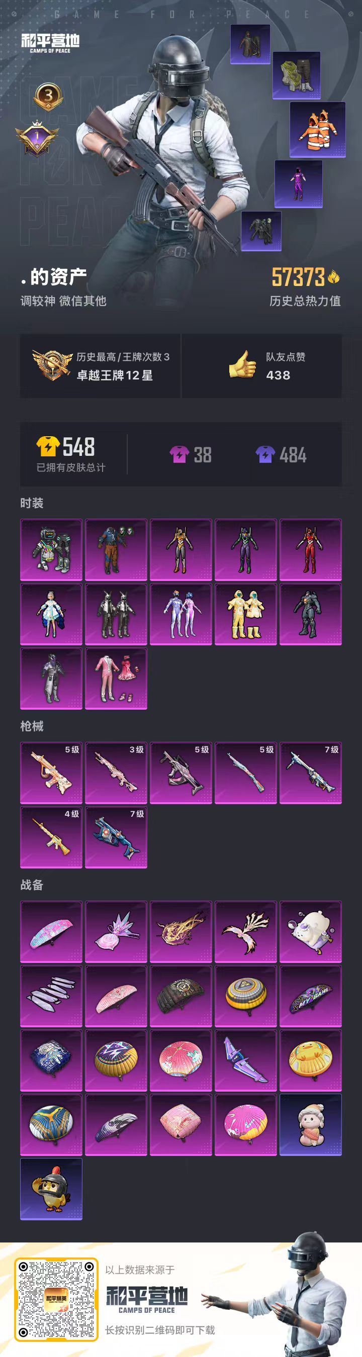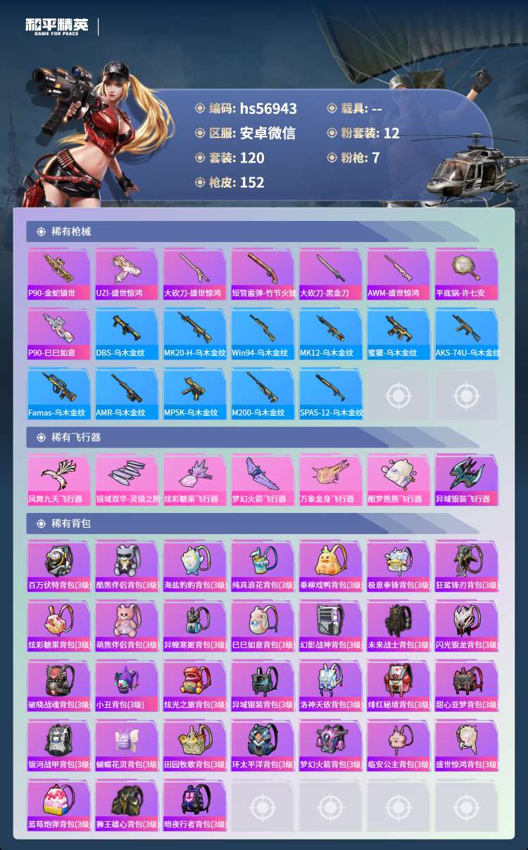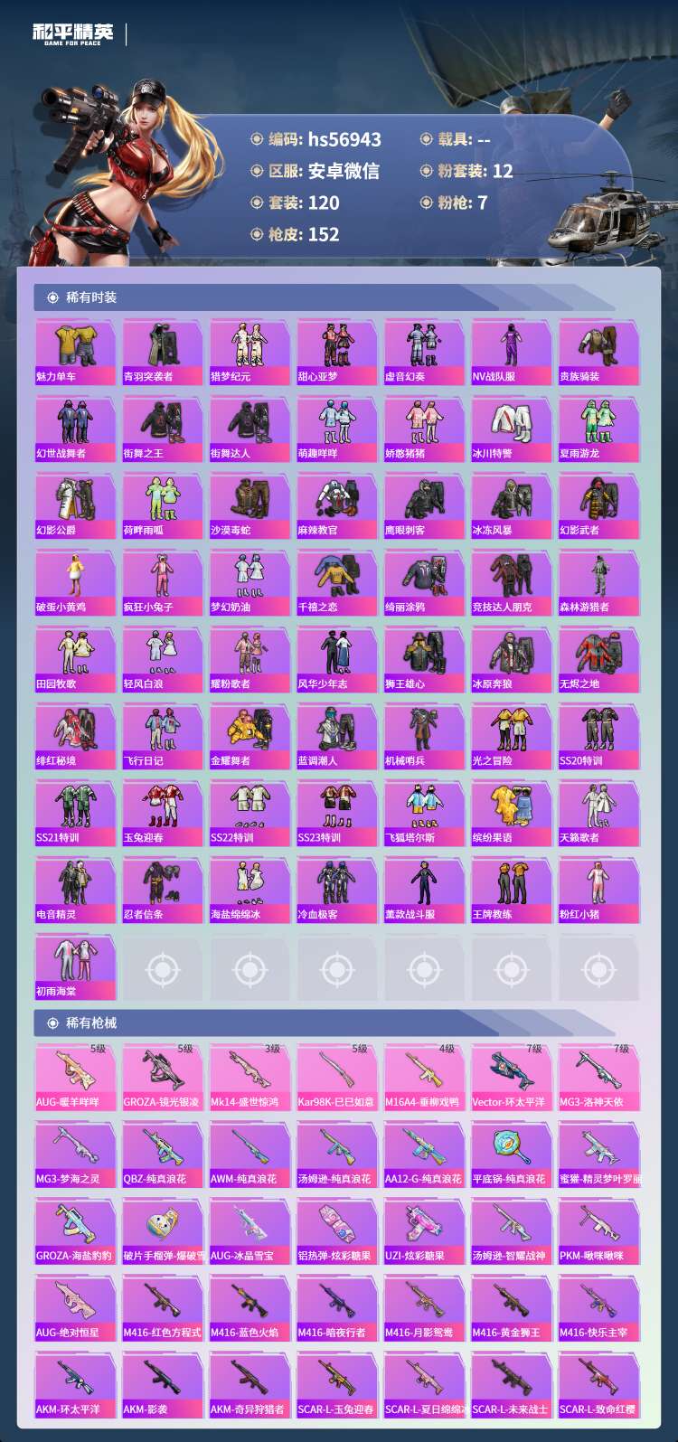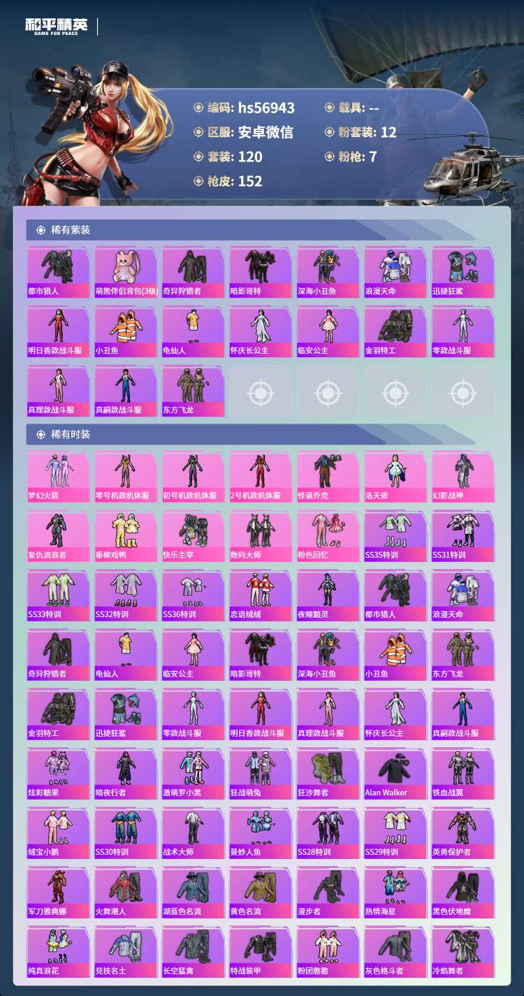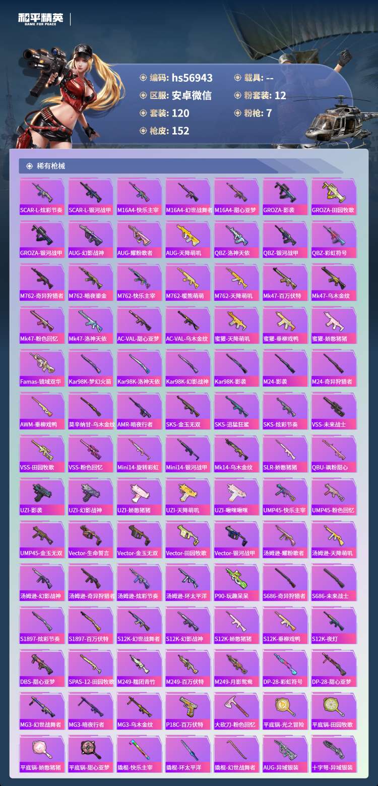 hs56943 安卓微-3王牌印记-12粉装-7特效枪-57373热力值-120套装-152枪皮-