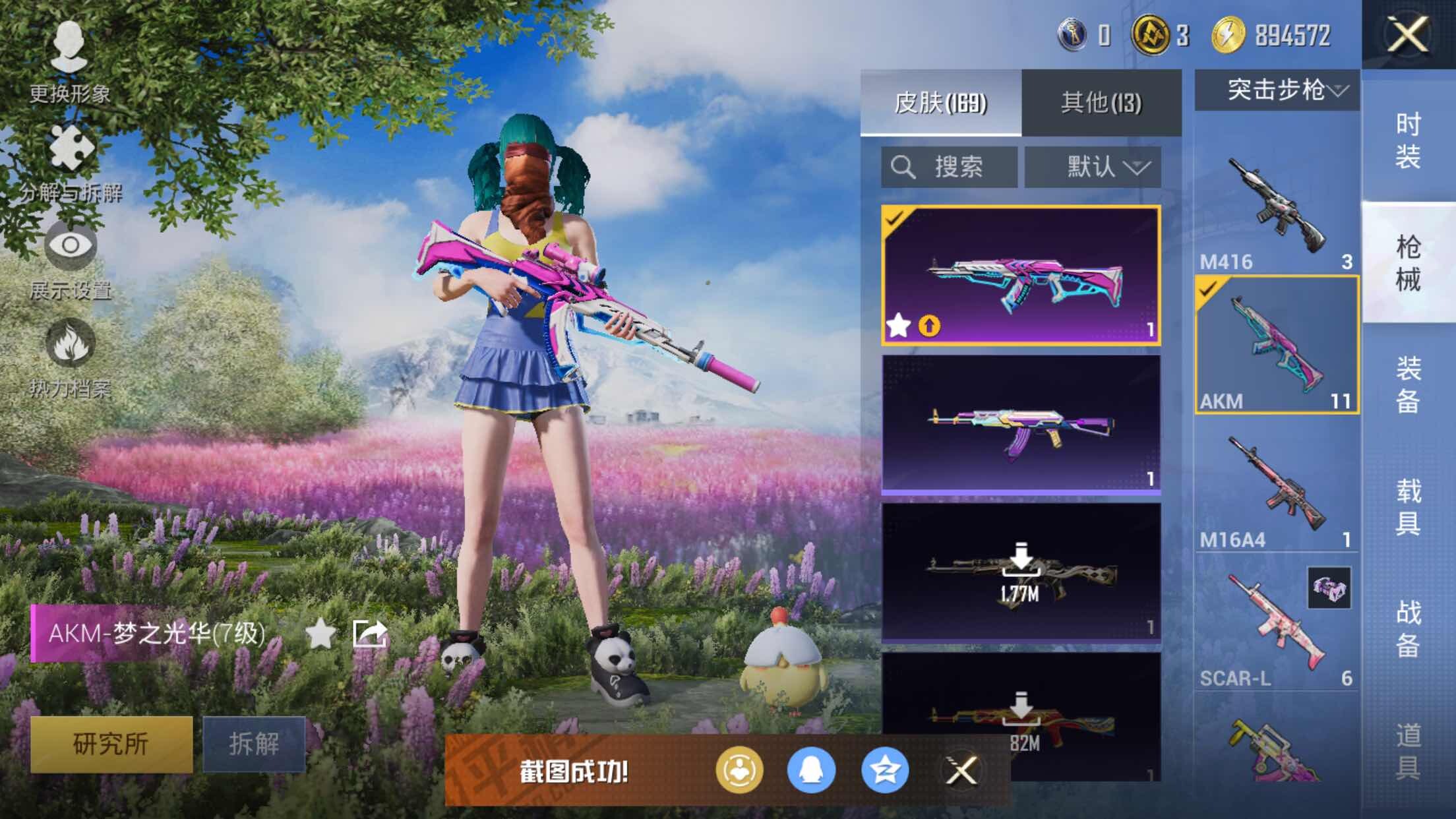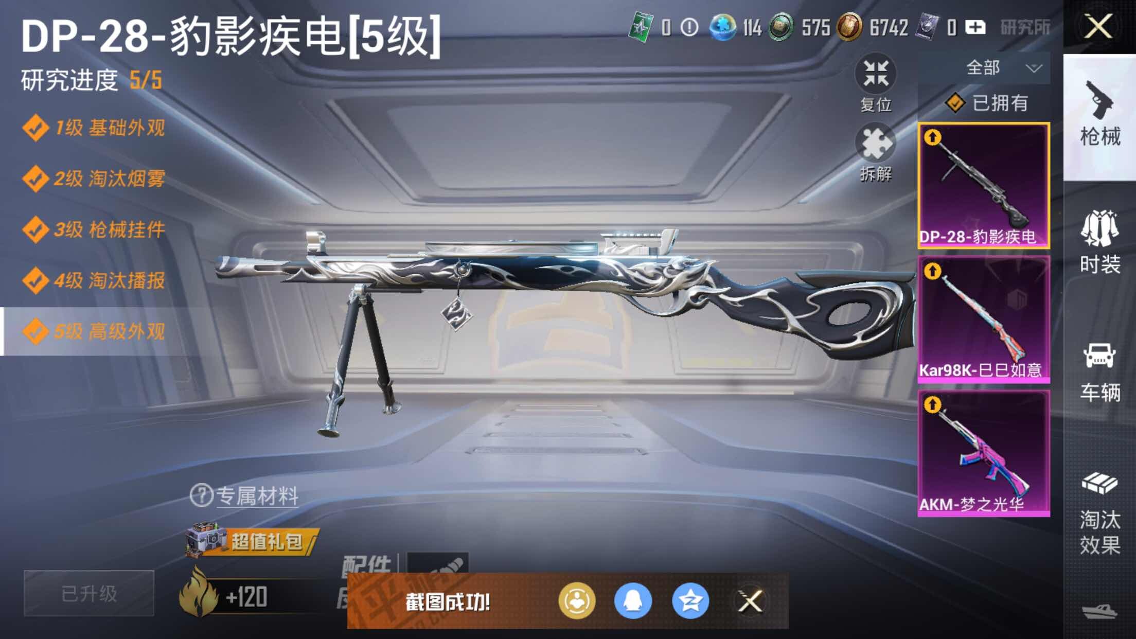 【粉色枪皮等级】:AKM-梦之光华(七级),Kar98K-巳巳如意(五级),DP-28-豹影疾电(五级)