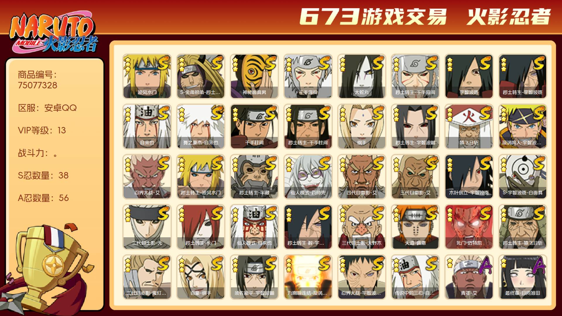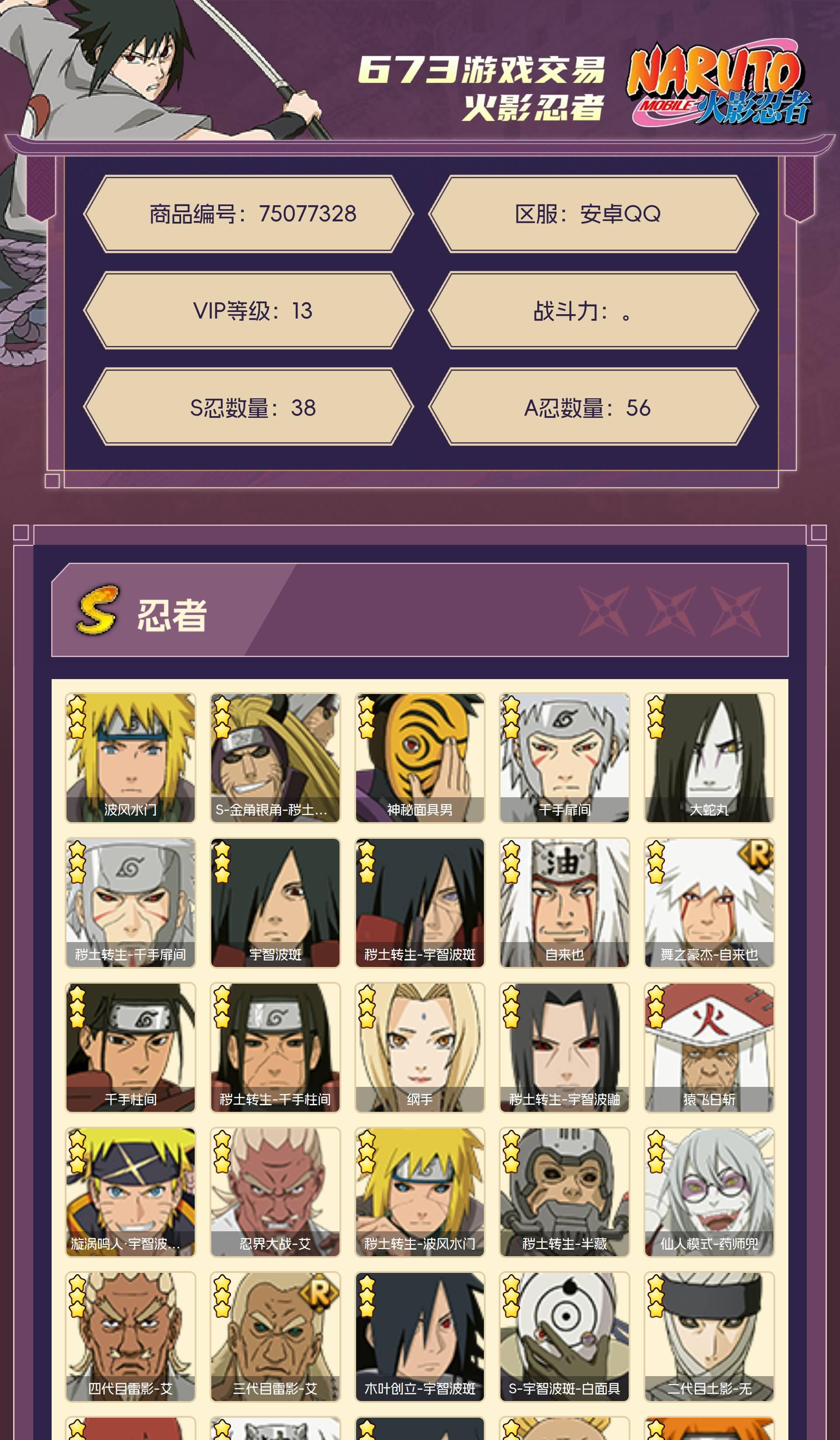 角色等级155 战斗力。 S忍38 A忍56 13 段位上忍