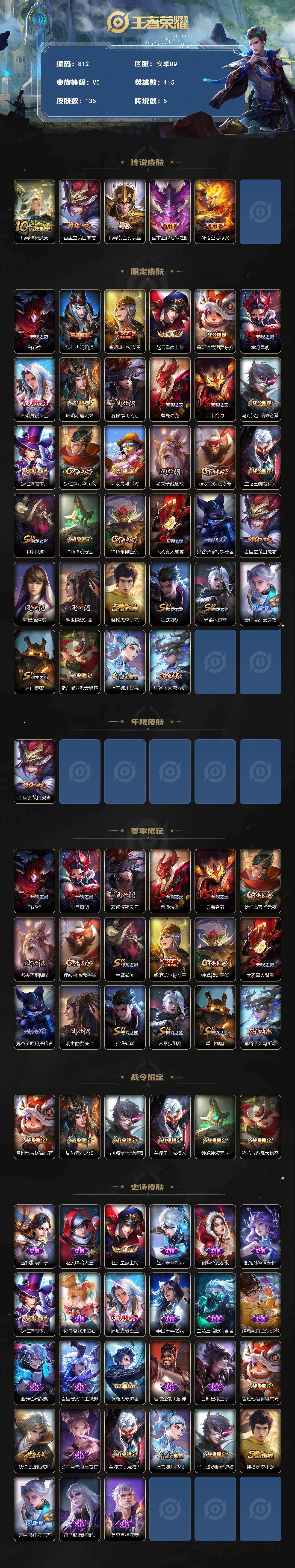 1946609 王者荣耀账号 安卓Q-V7-尊贵铂金I段位-115英雄-135皮肤-5传说-27史诗