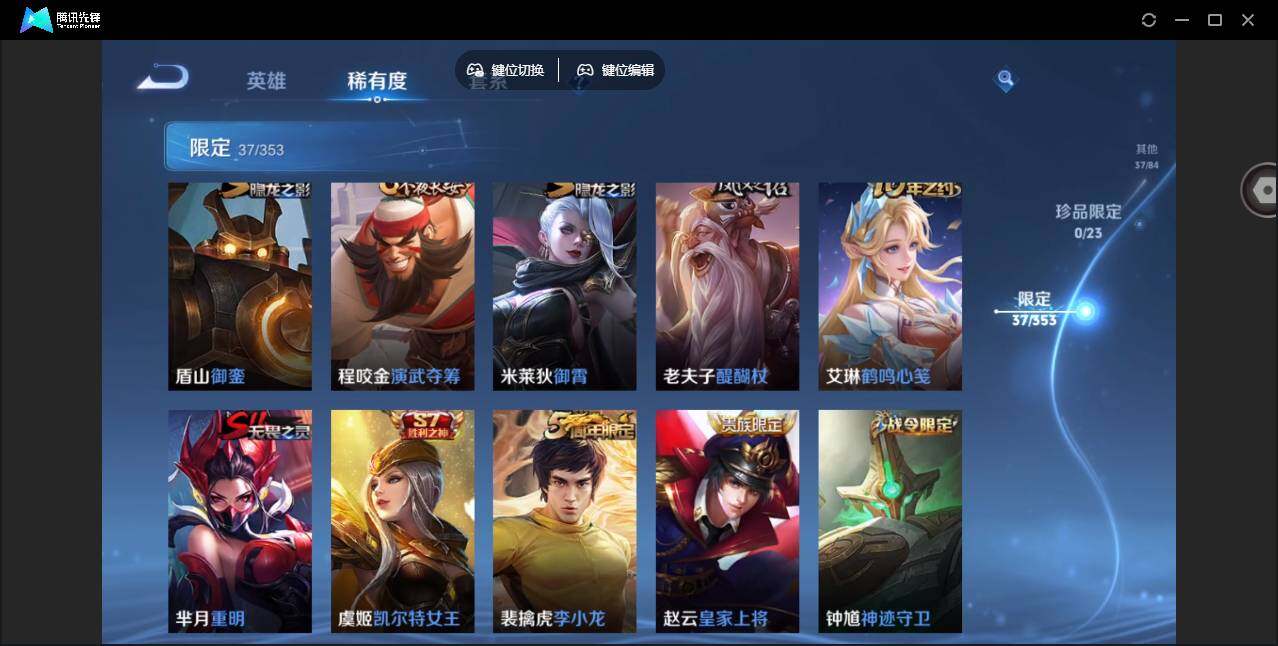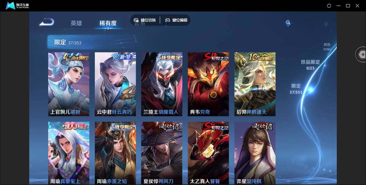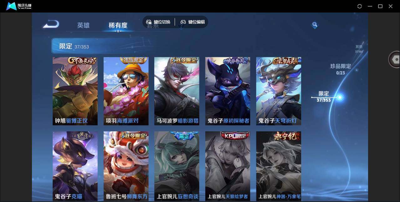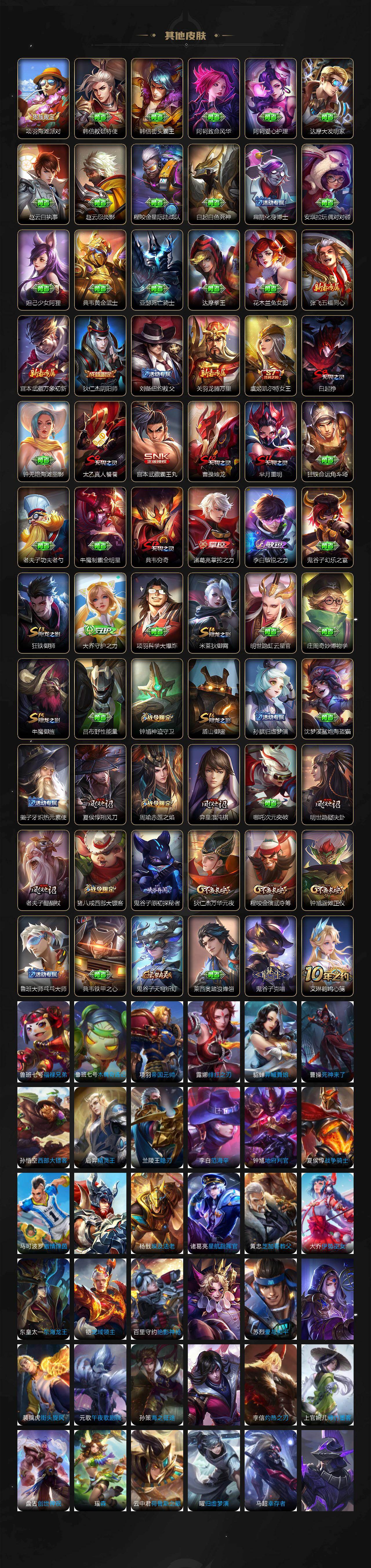 【限定皮肤】:白起狰,狄仁杰阴阳师,虞姬凯尔特女王,赵云皇家上将,鲁班七号狮舞东方,芈月重明,周瑜真爱至上,周瑜赤莲之焰,夏侯惇朔风刀,曹操烛龙,典韦穷奇,马可波罗暗影游猎,