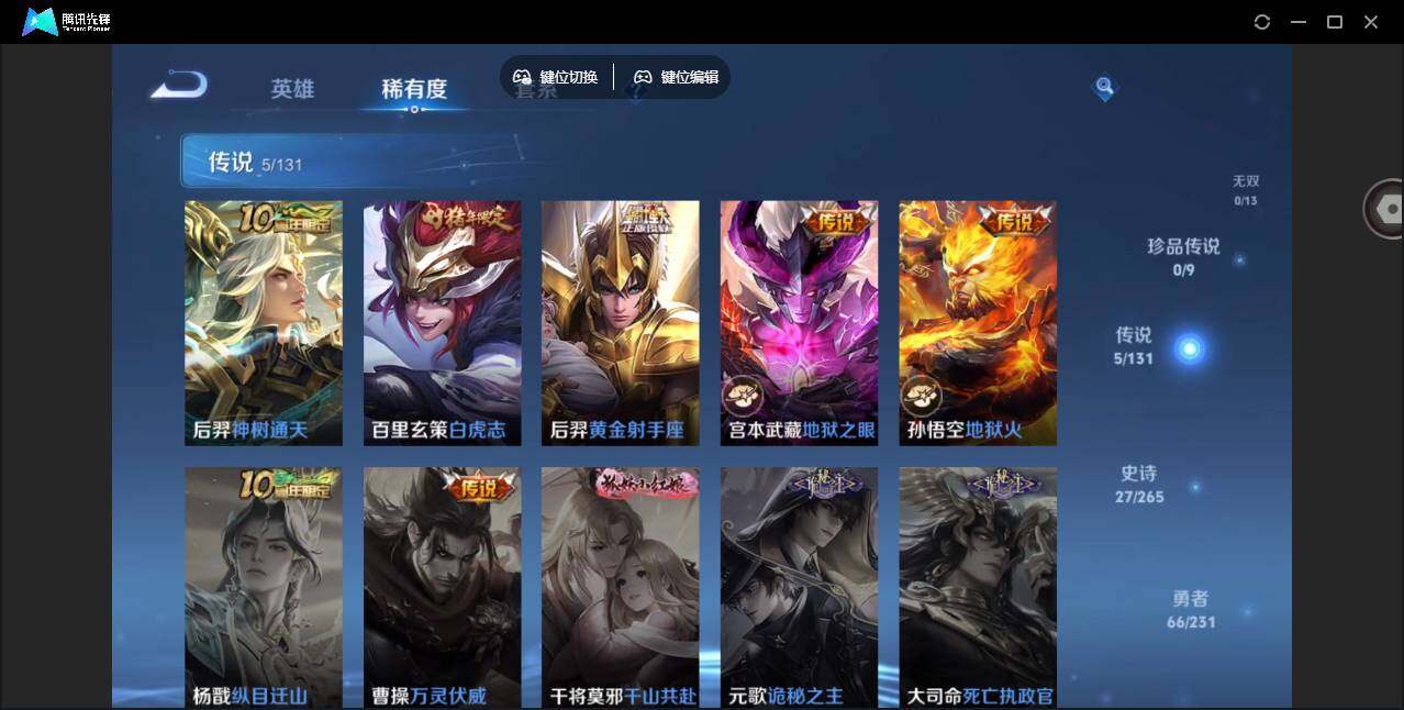 【传说皮肤】:后羿神树通天,百里玄策白虎志,后羿黄金射手座,宫本武藏地狱之眼,孙悟空地狱火