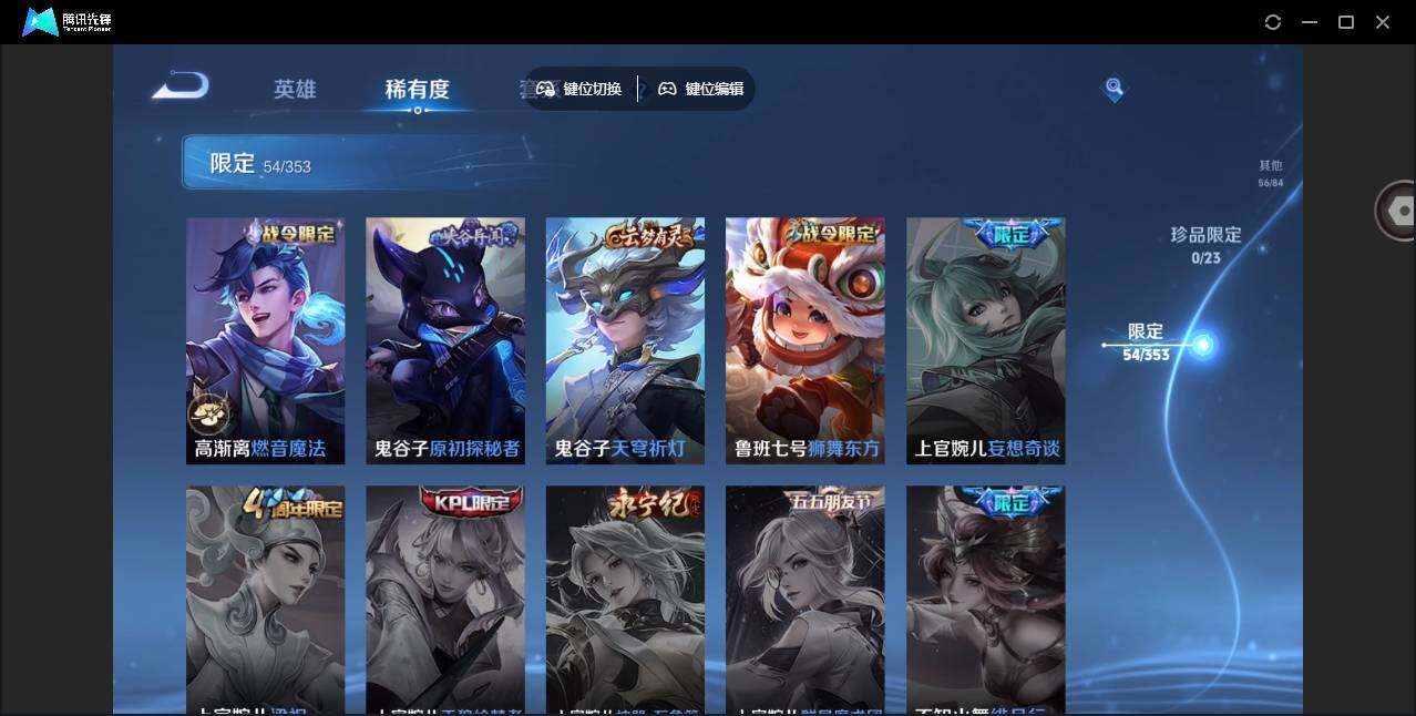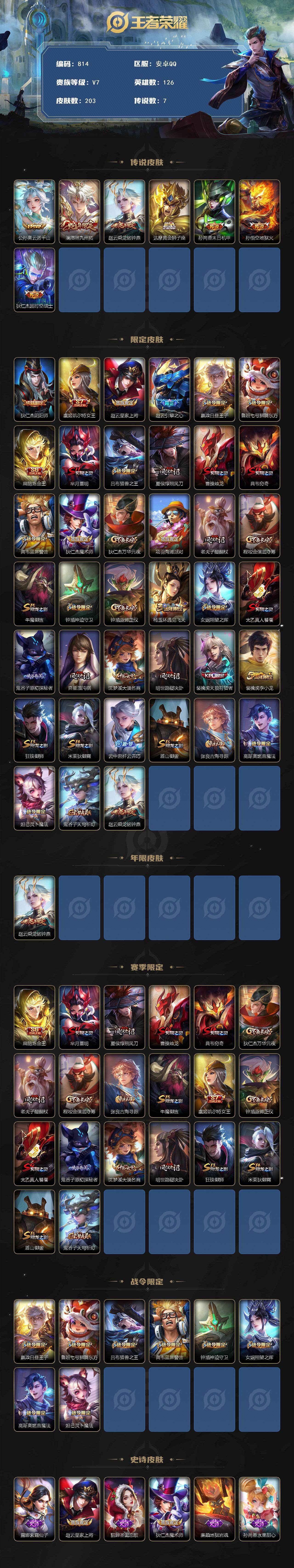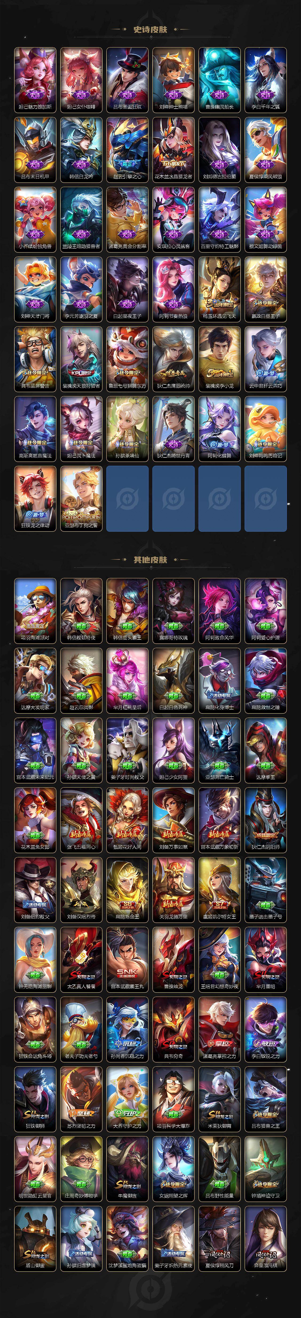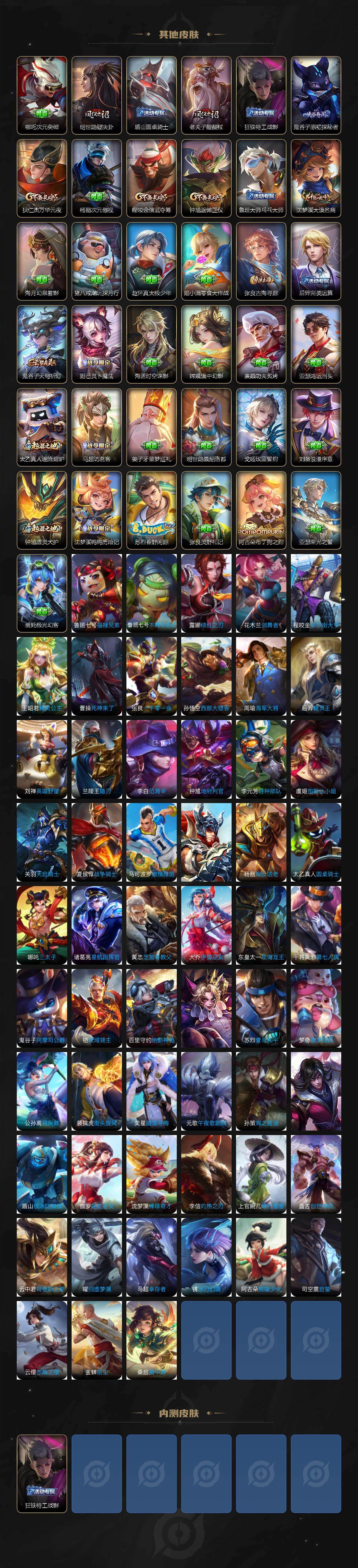 【限定皮肤】:狄仁杰阴阳师,虞姬凯尔特女王,赵云皇家上将,赵云引擎之心,嬴政白昼王子,鲁班七号狮舞东方,扁鹊炼金王,芈