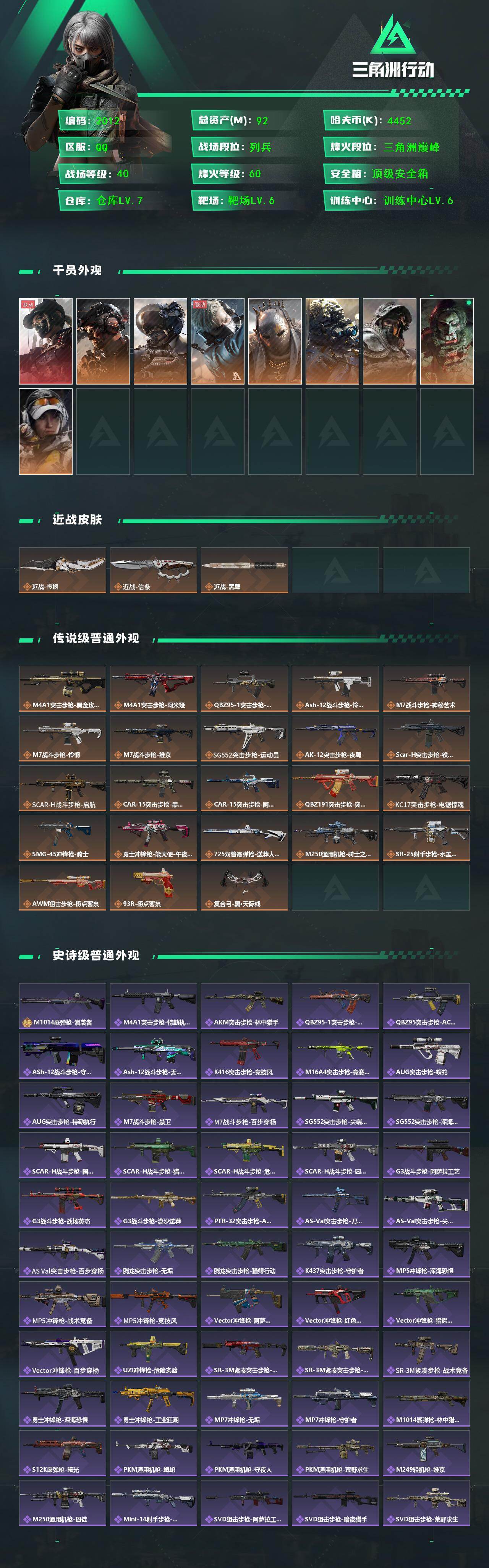 总资产(M):92M/哈夫币(K):4452K/哈夫币(K):4452K/传说枪皮数:23/全面战场