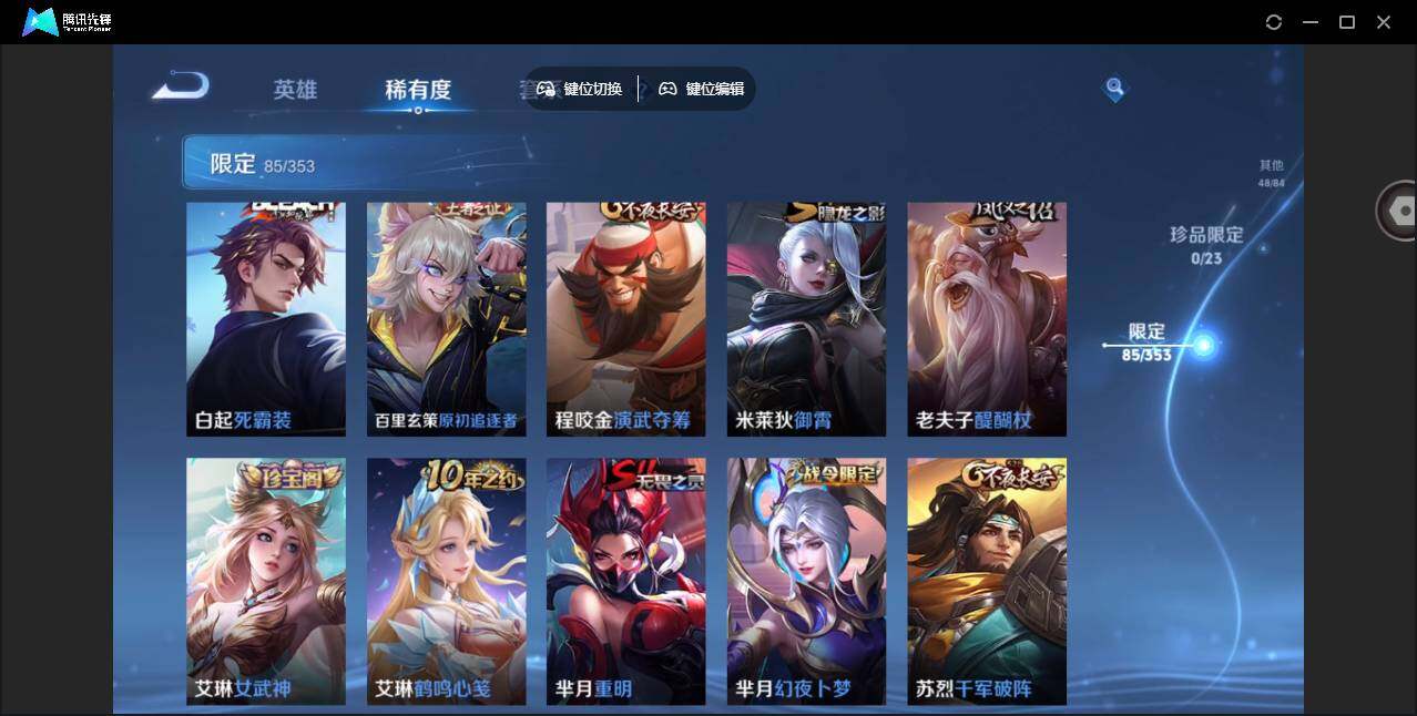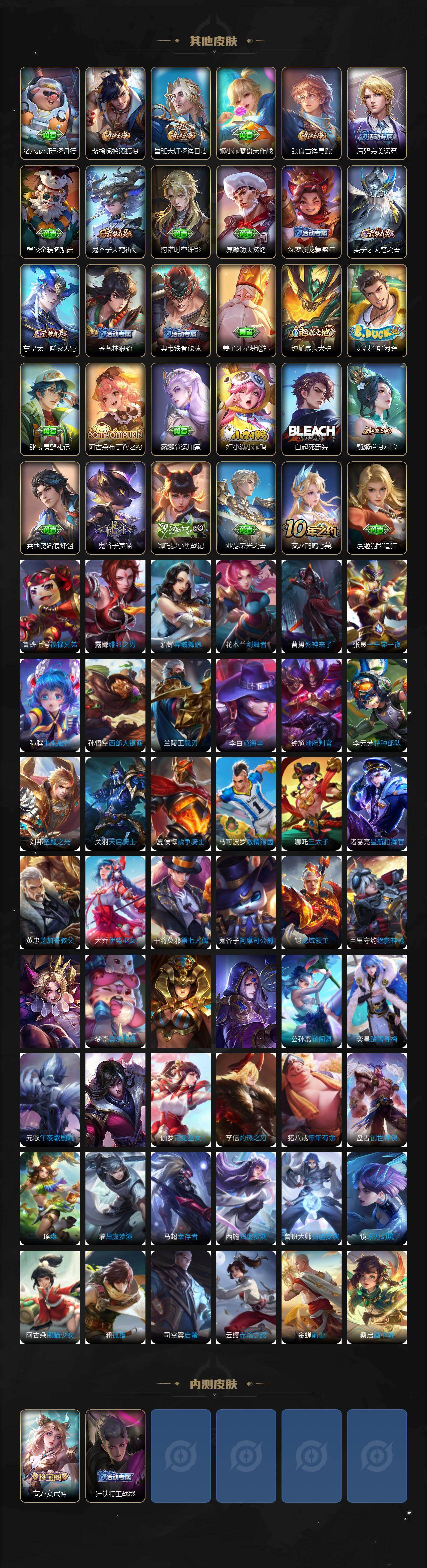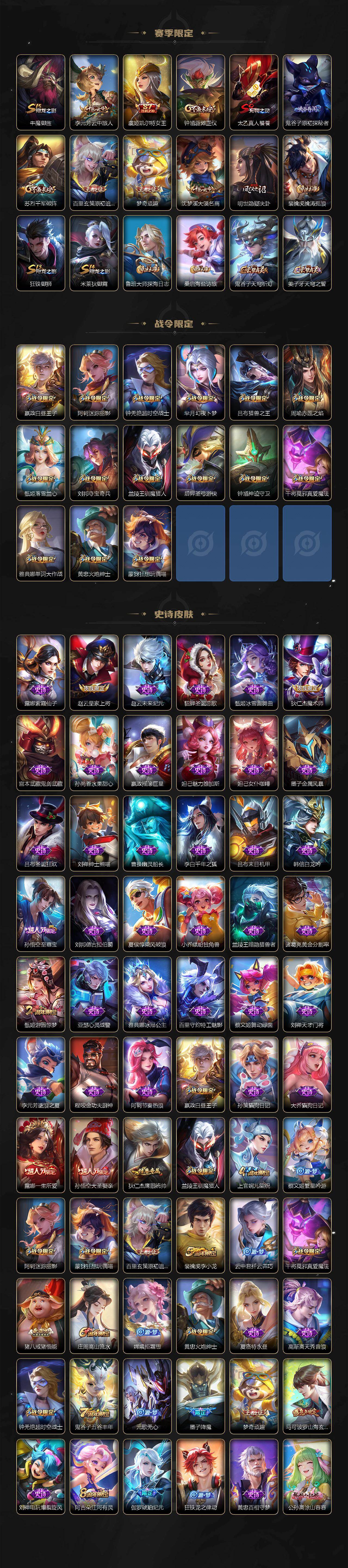 【限定皮肤】:白起狰,姜子牙天穹之誓,狄仁杰阴阳师,虞姬凯尔特女王,赵云皇家上将,墨子降魔,嬴政白昼王子,孙尚香异界灵契,庄周