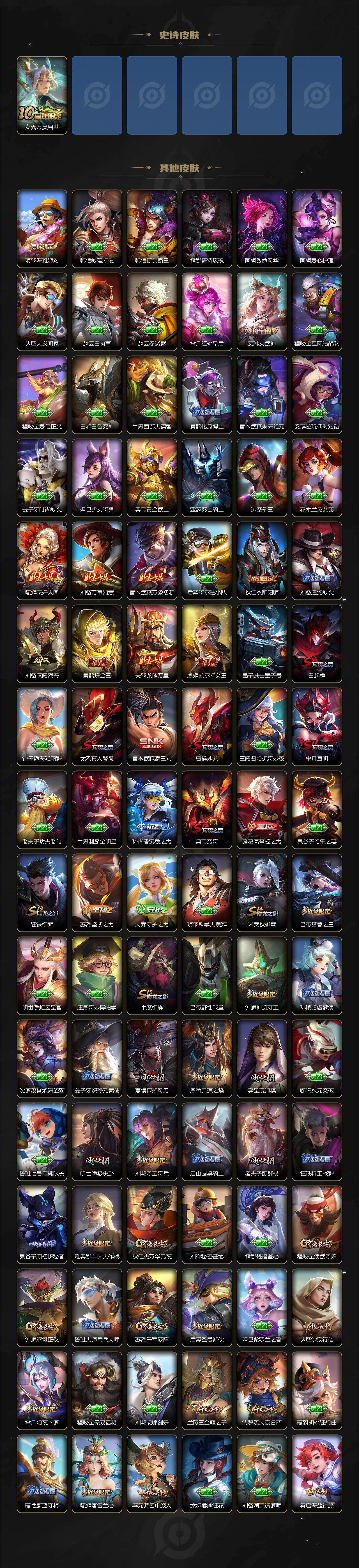 【传说皮肤】:吕布遇见神鼓,宫本武藏惊梅引,公孙离记忆之芯,百里守约碎云,孙尚香异界灵契,干将莫邪久胜战神,宫本武藏地狱之眼,孙悟空地狱火