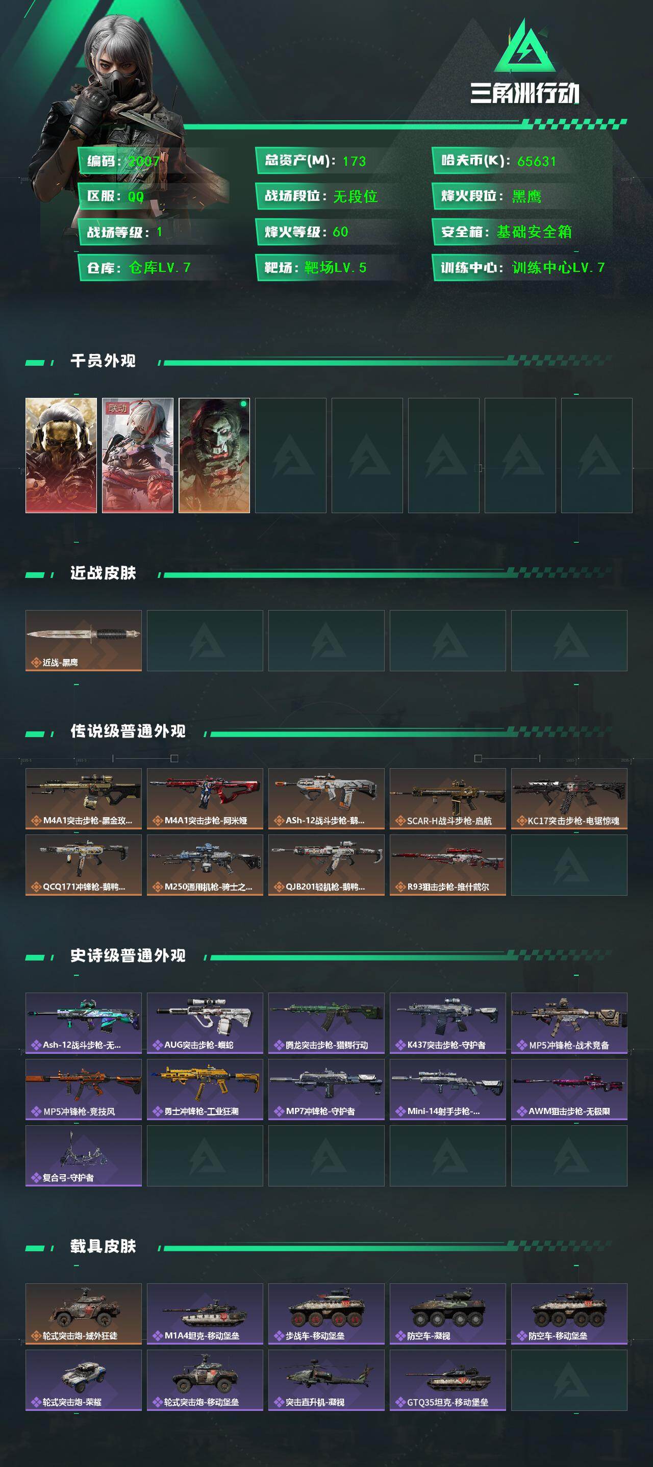 总资产(M):173M/哈夫币(K):65631K/哈夫币(K):65631K/传说枪皮数:9/全面