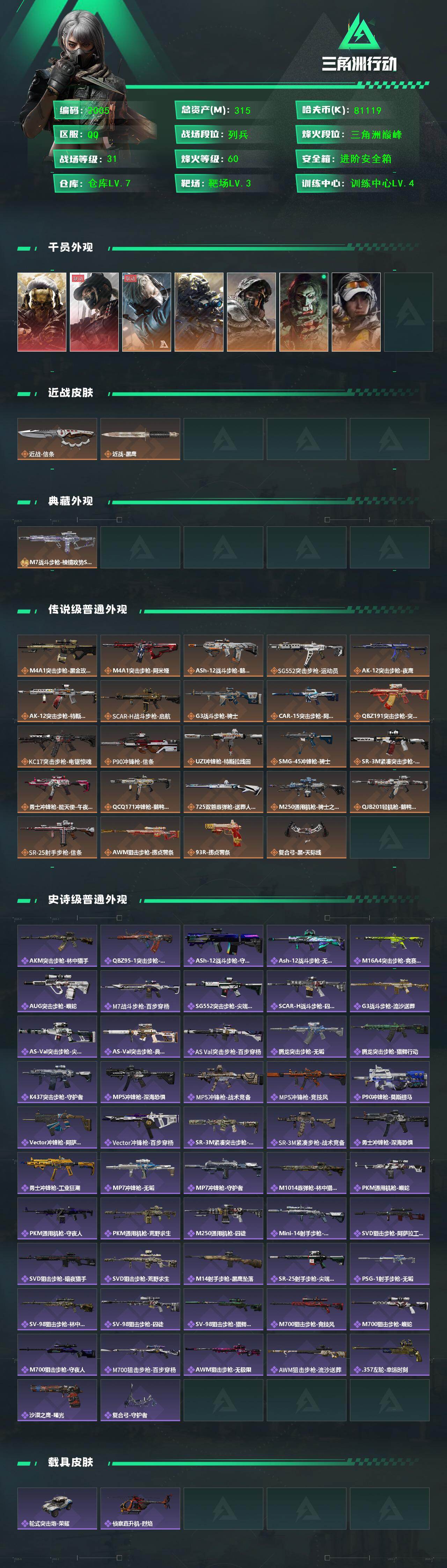 总资产(M):315M/哈夫币(K):81119K/哈夫币(K):81119K/传说枪皮数:25/全