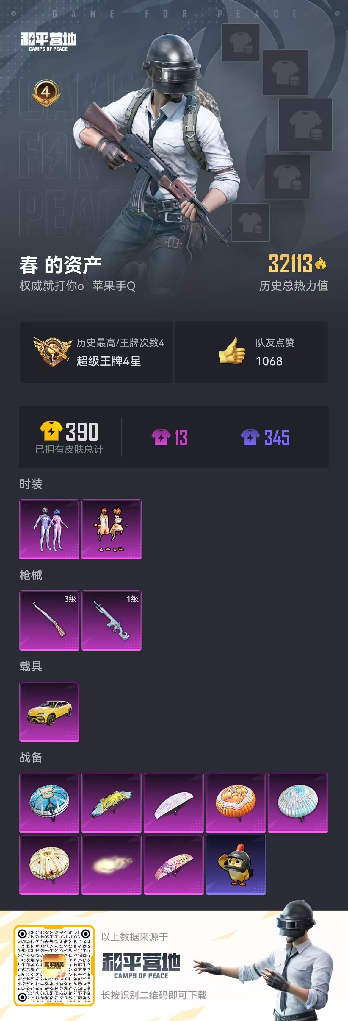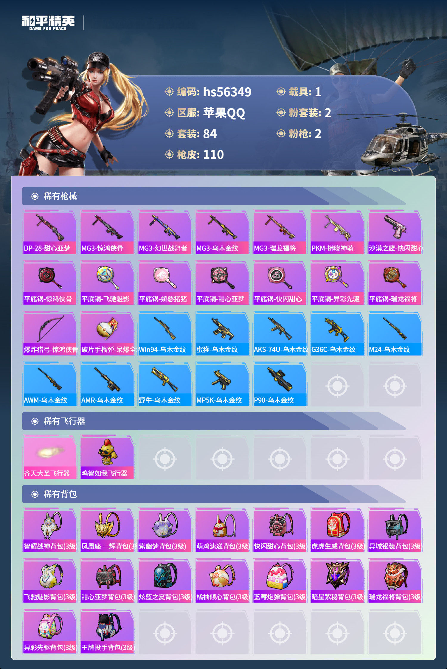 hs56349 苹果手Q-4王牌印记-2粉装-2特效枪-1载具-32138热力值-84套装-110枪