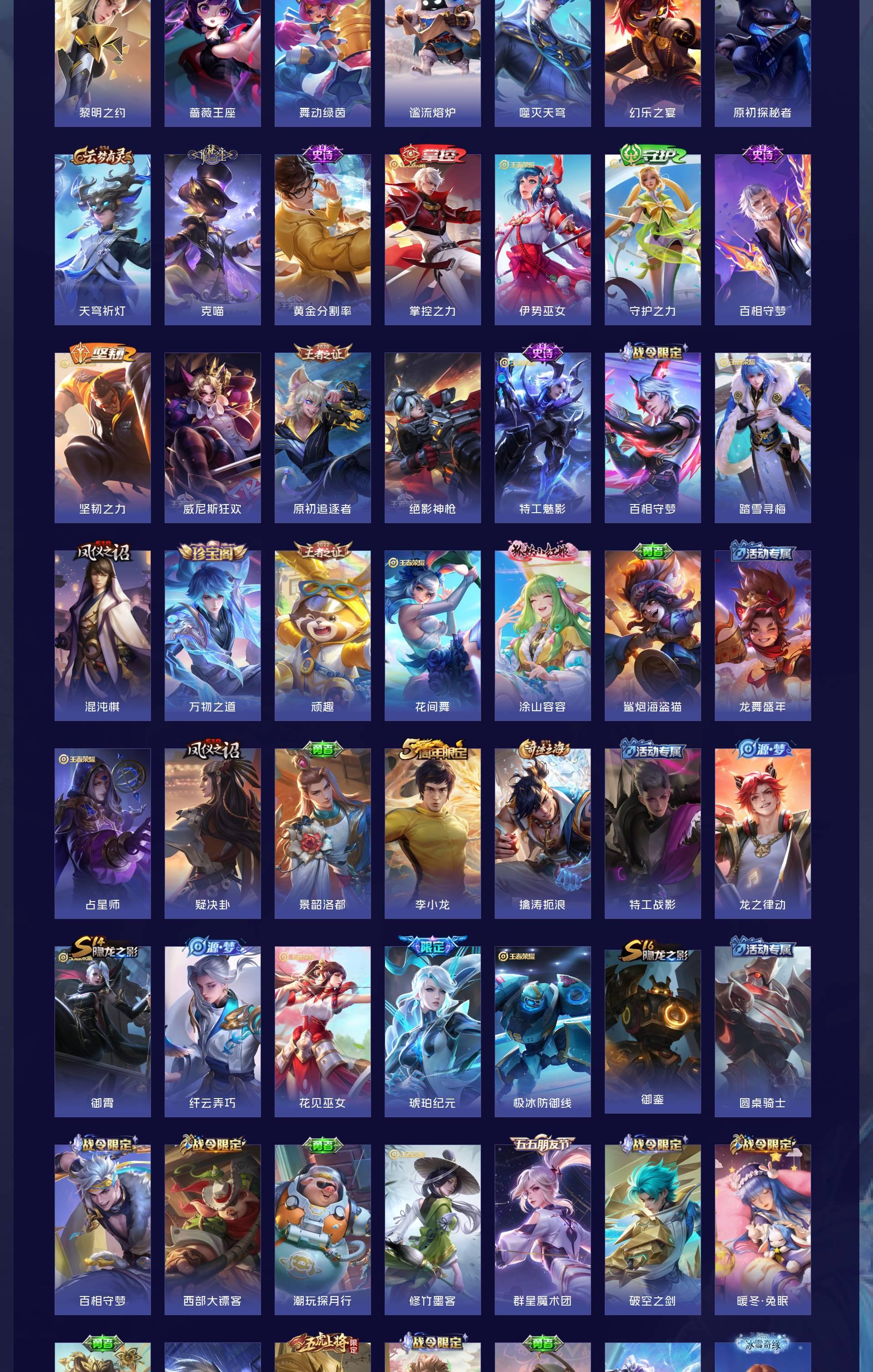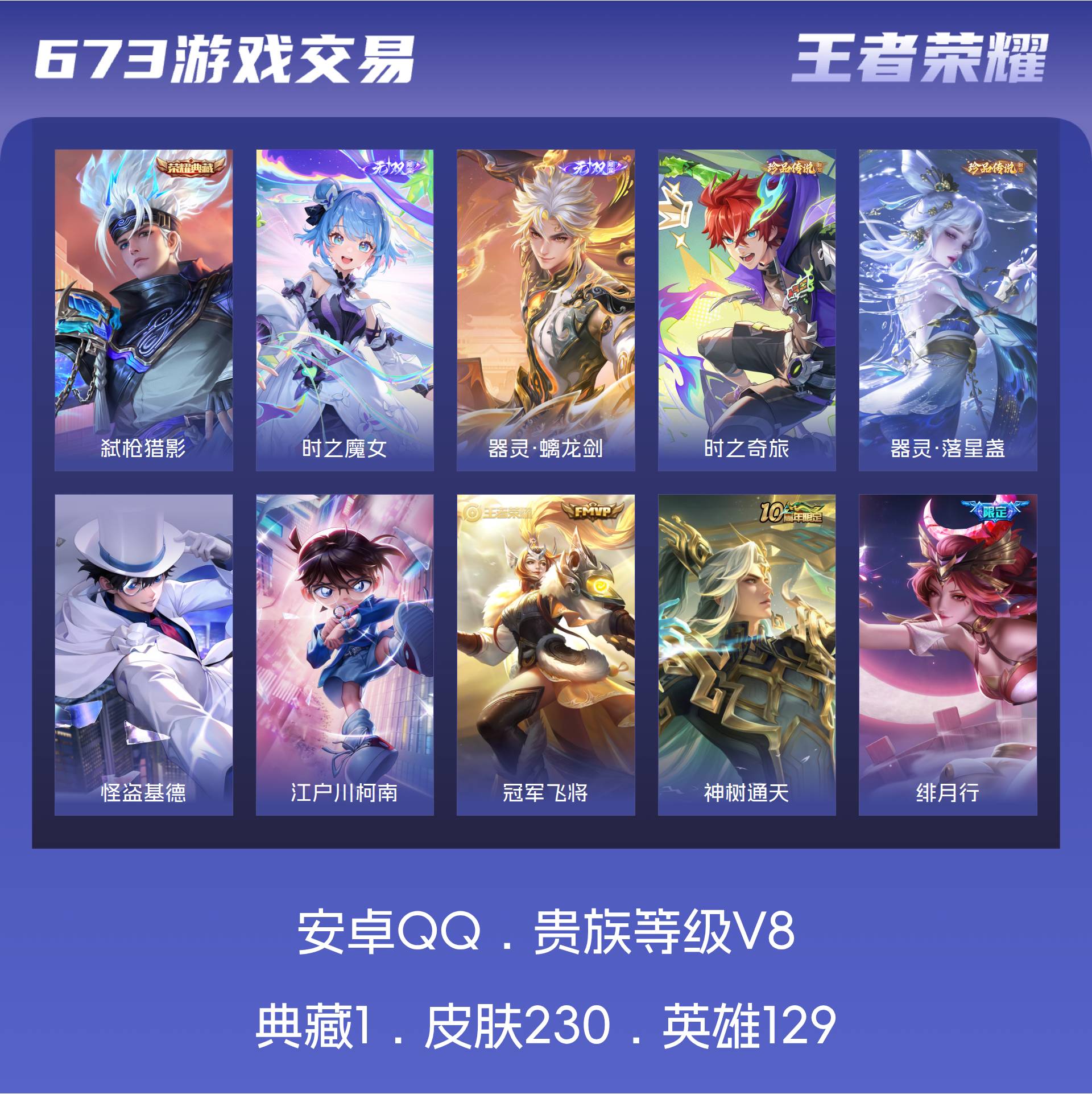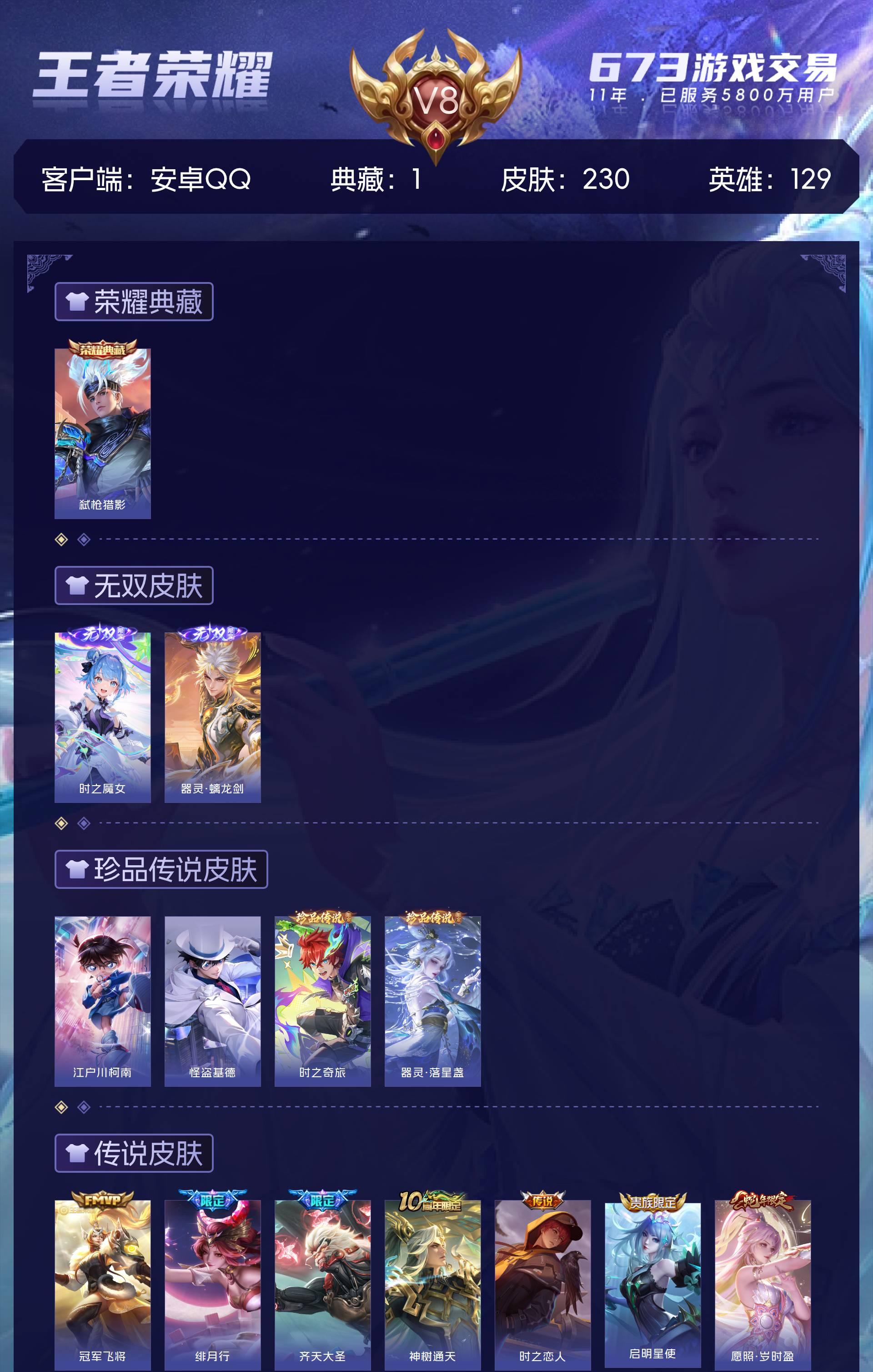 V8 皮肤230 英雄129 非凡王者 荣耀典藏1 无双皮肤2 珍品传说4 传说18 其他皮肤211