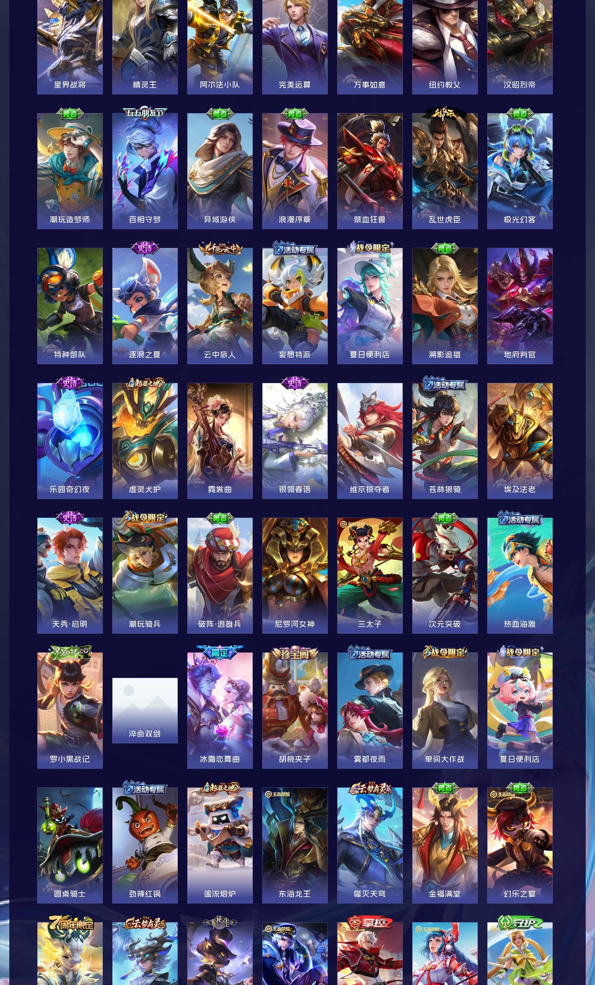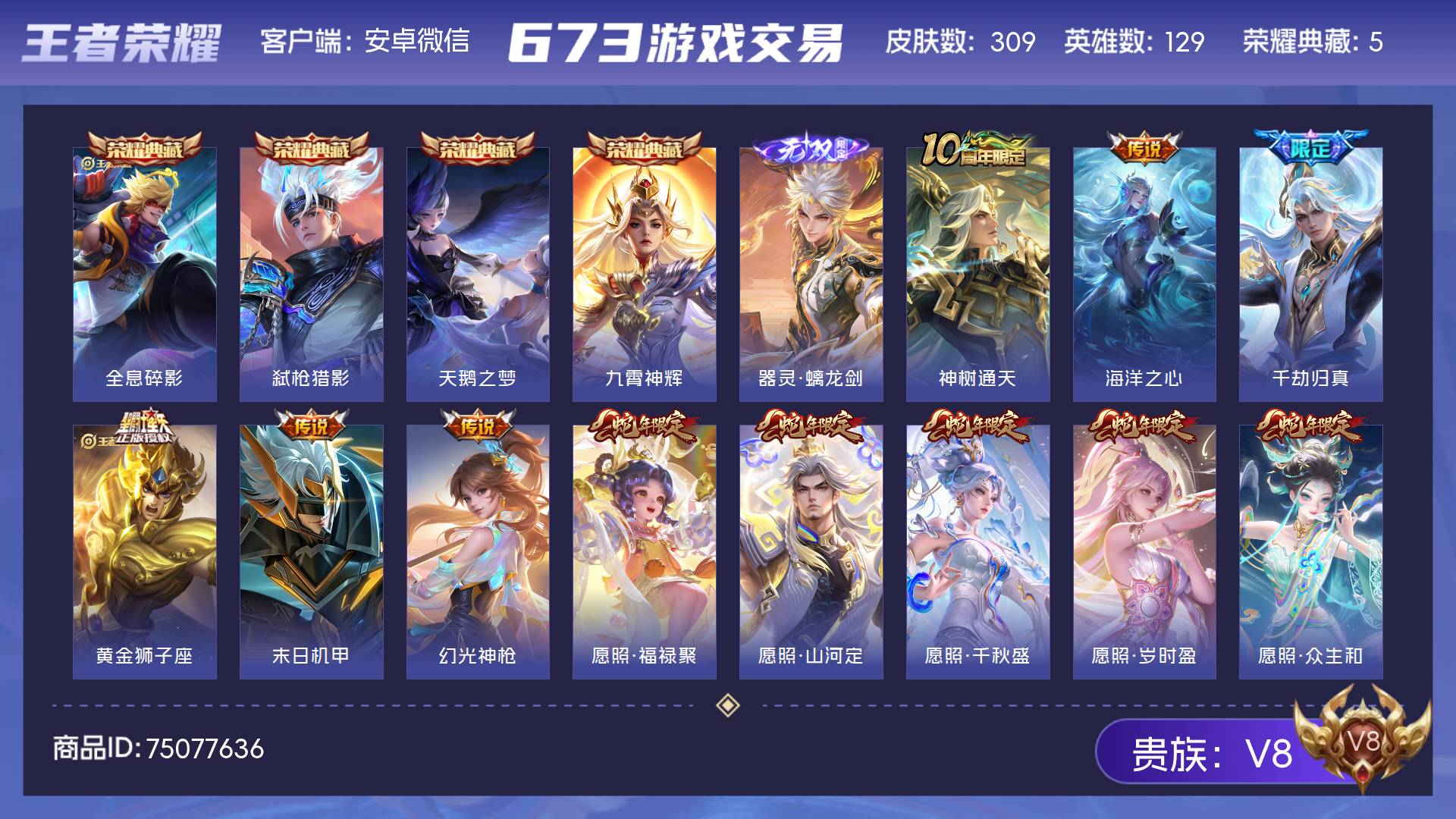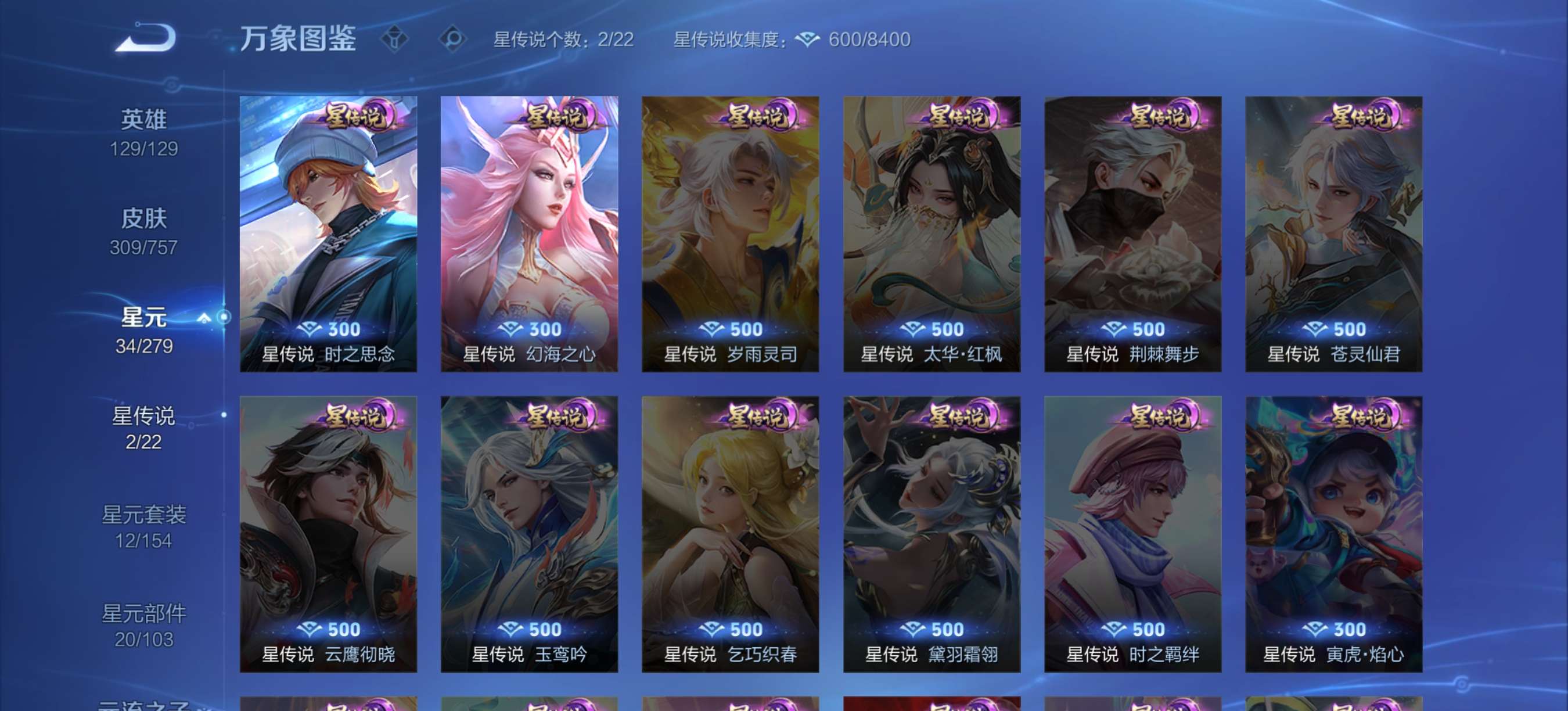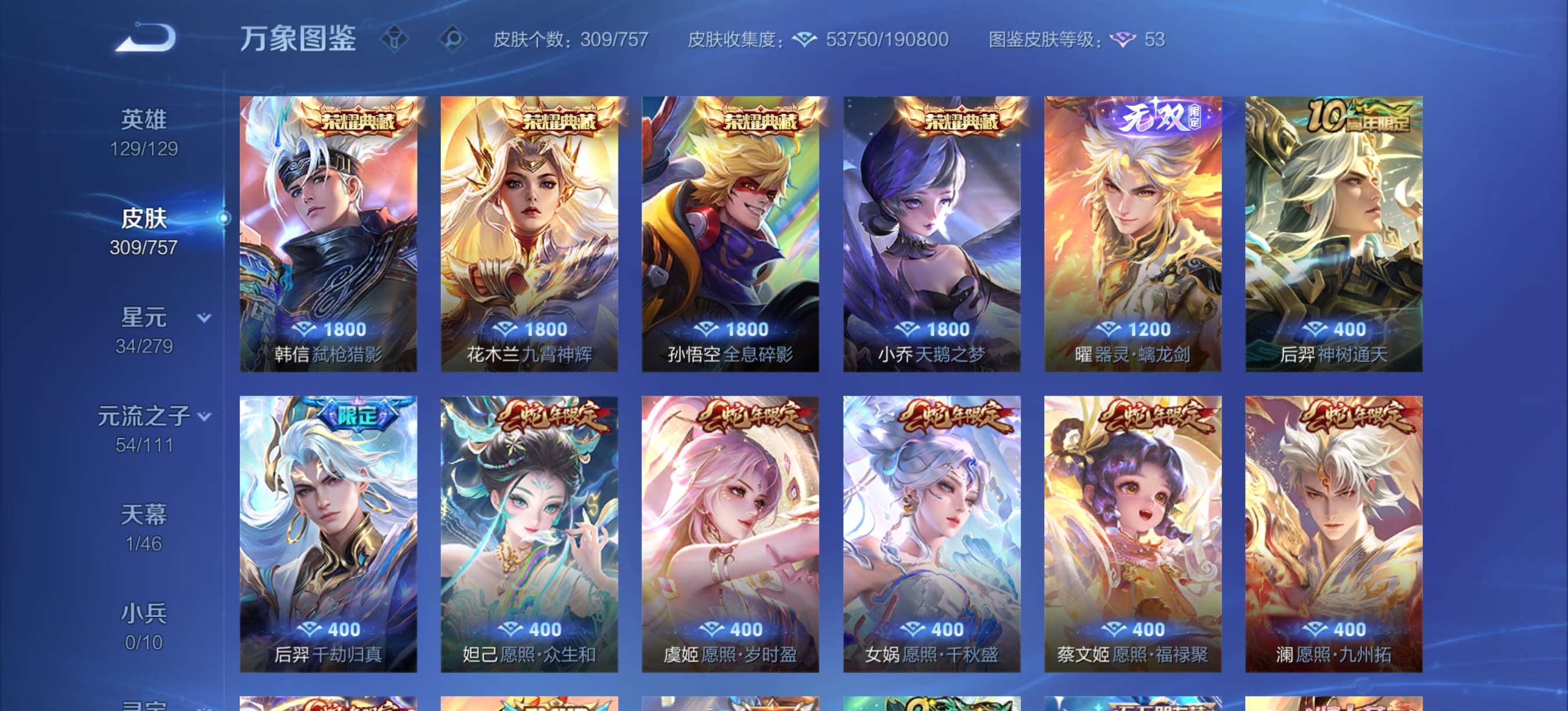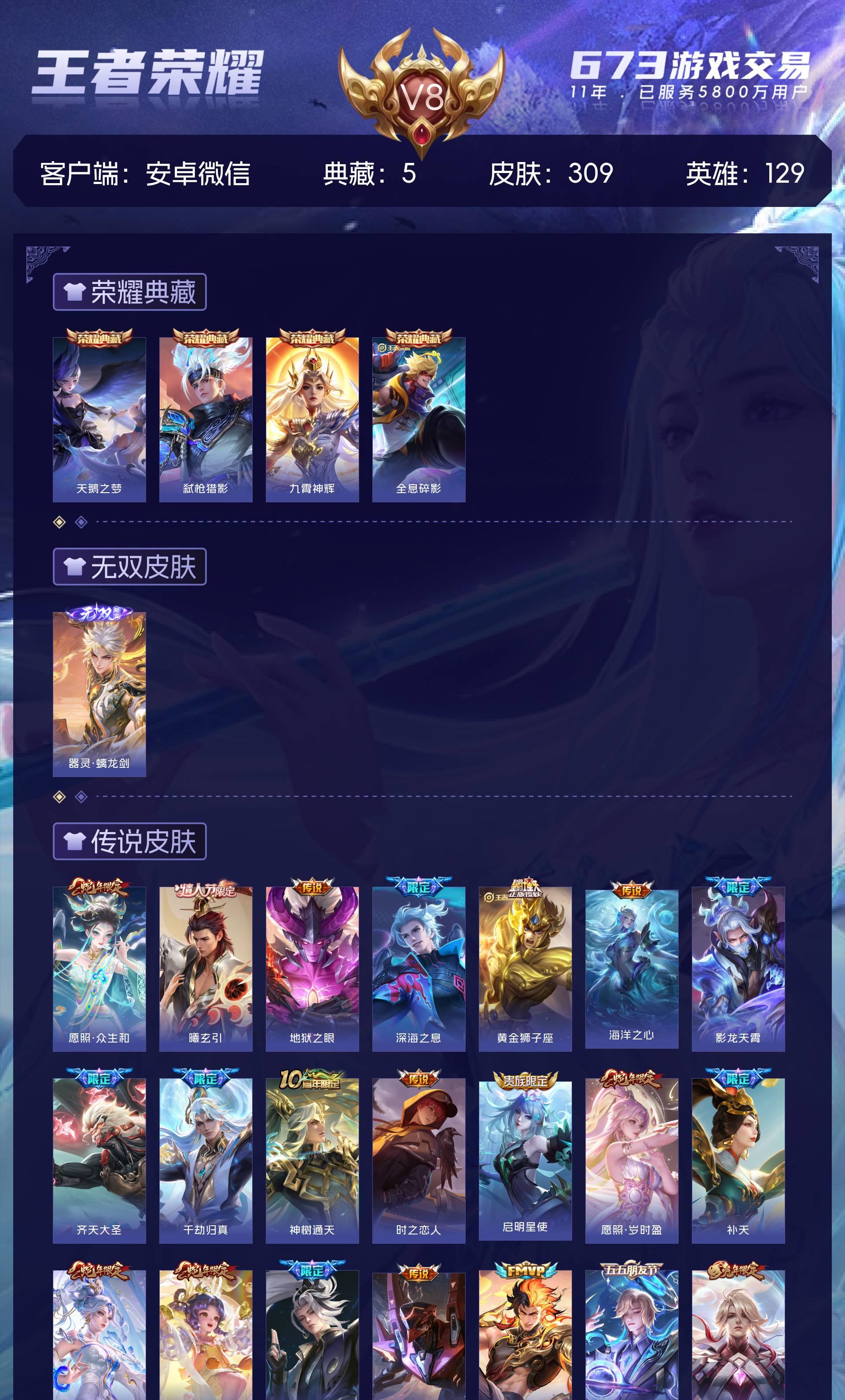 V8 皮肤309 英雄129 至尊星耀 荣耀典藏5 无双皮肤1 星传说2 传说30 其他皮肤279