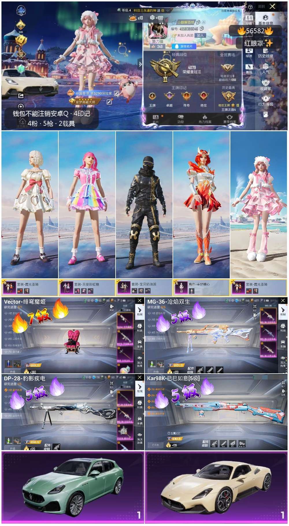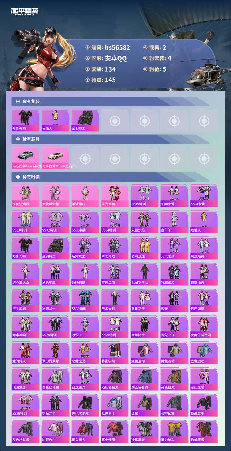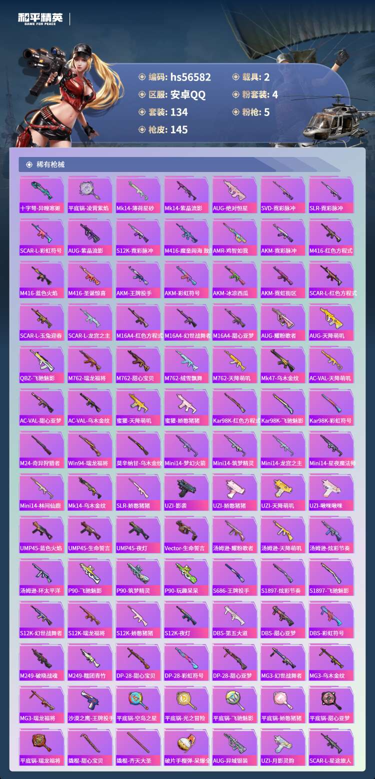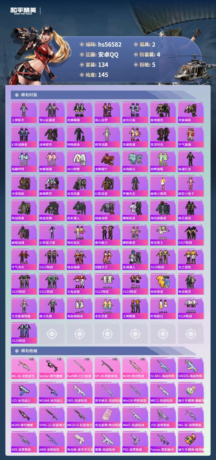 hs56582 安卓手Q-4王牌印记-4粉装-5特效枪-2载具-50040热力值-134套装-145