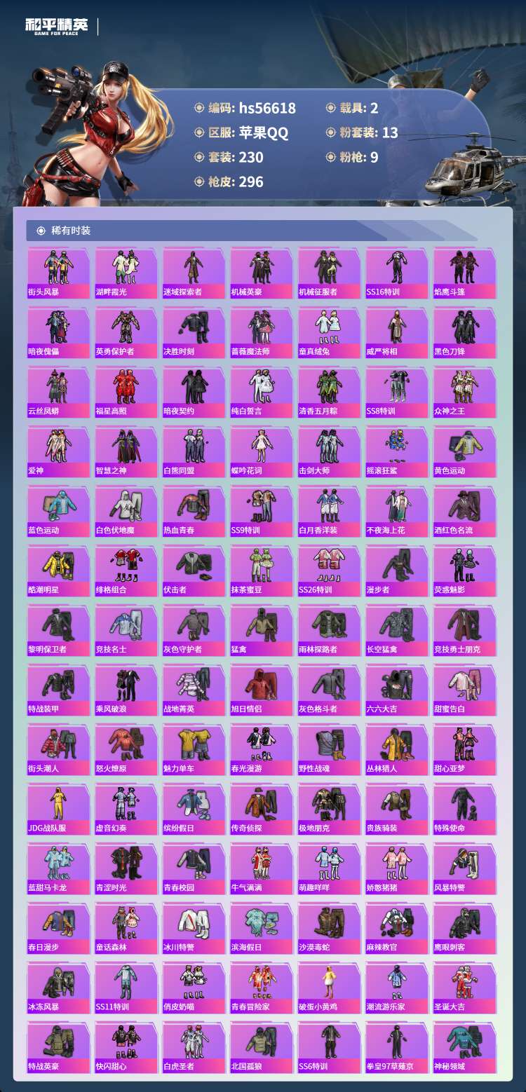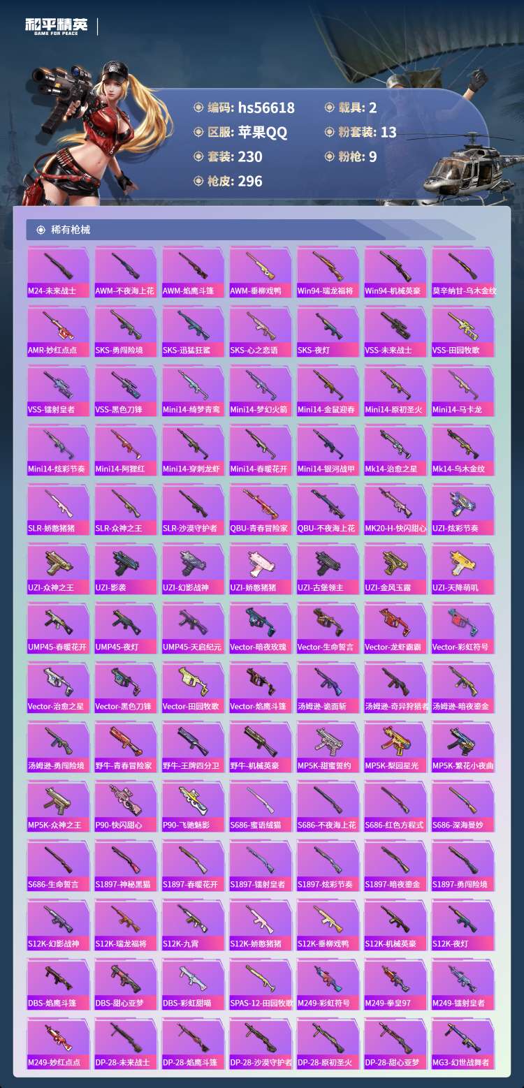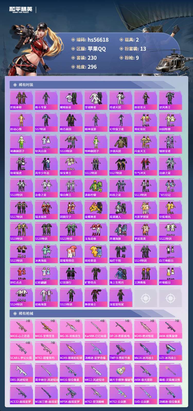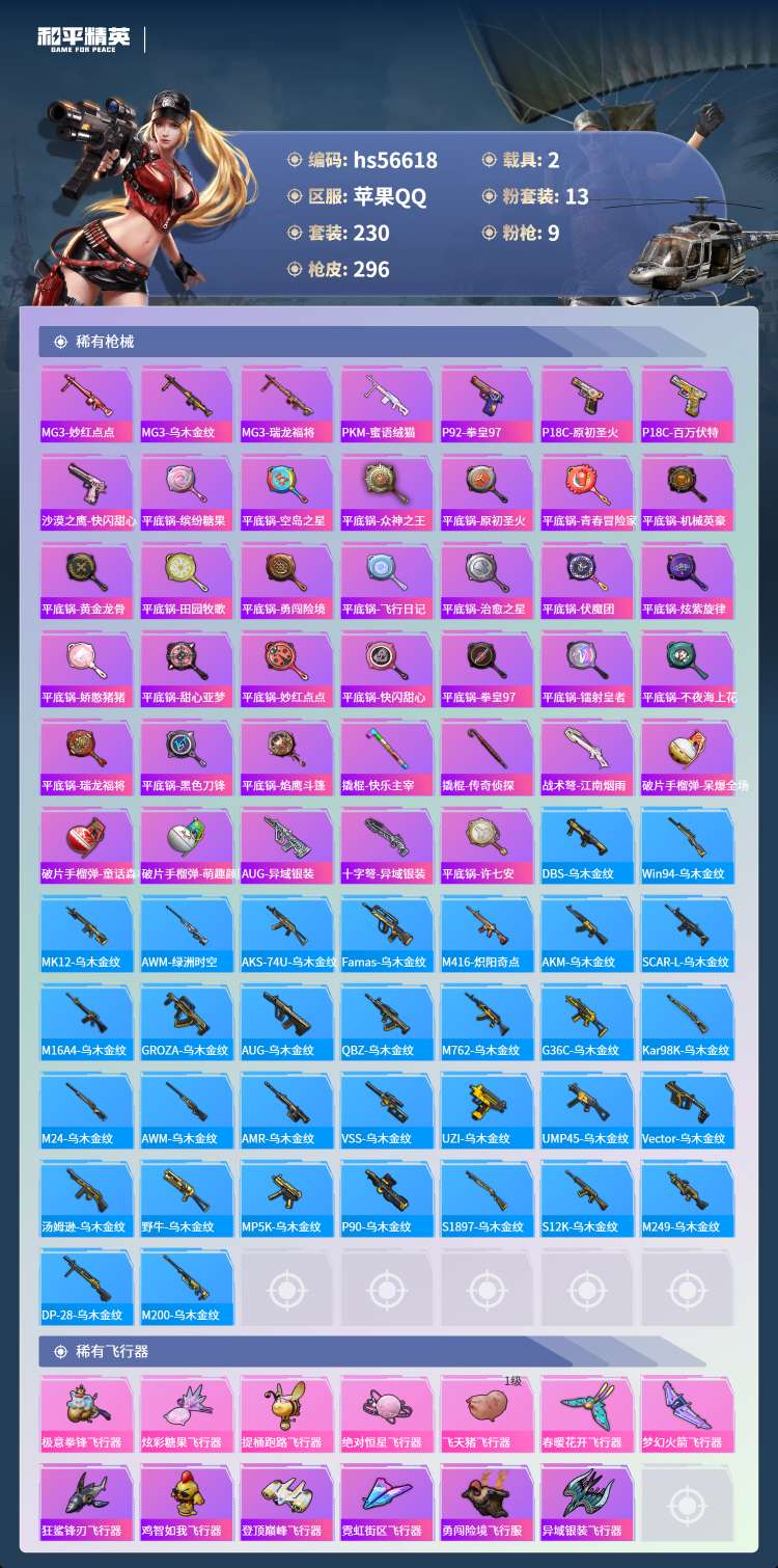 hs56618 苹果手Q-26王牌印记-13粉装-9特效枪-2载具-105476热力值-230套装-