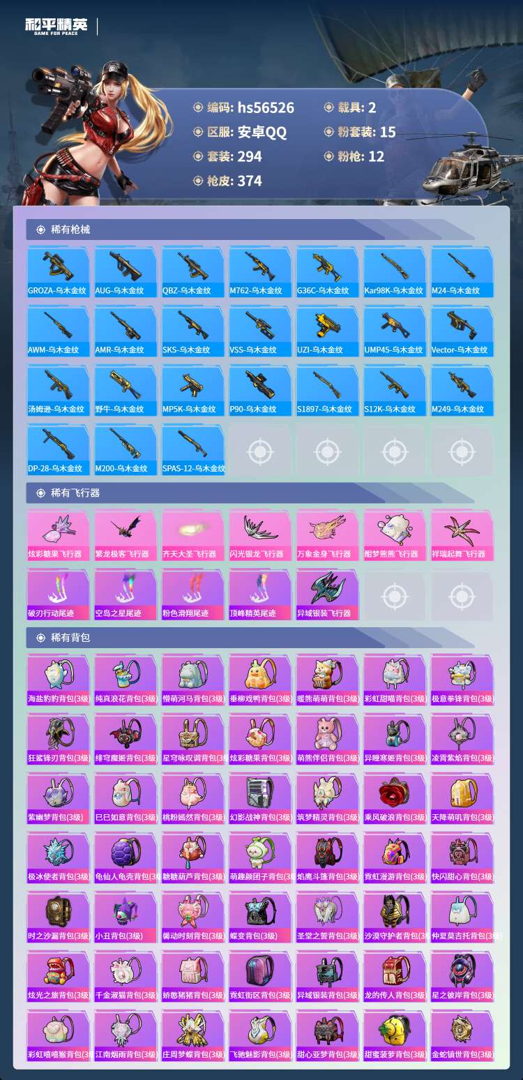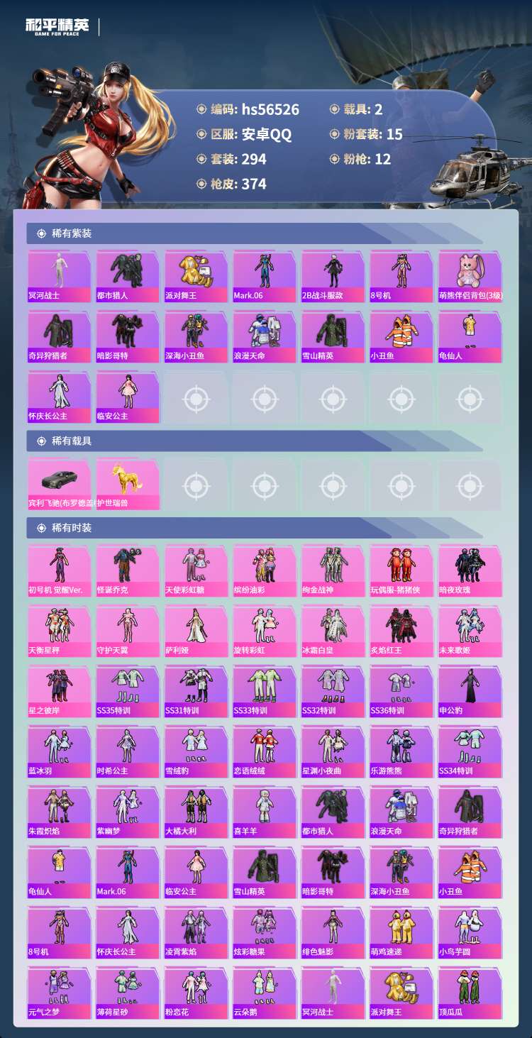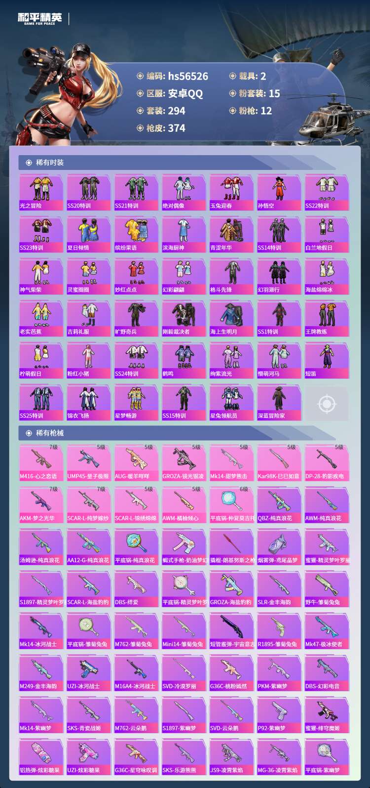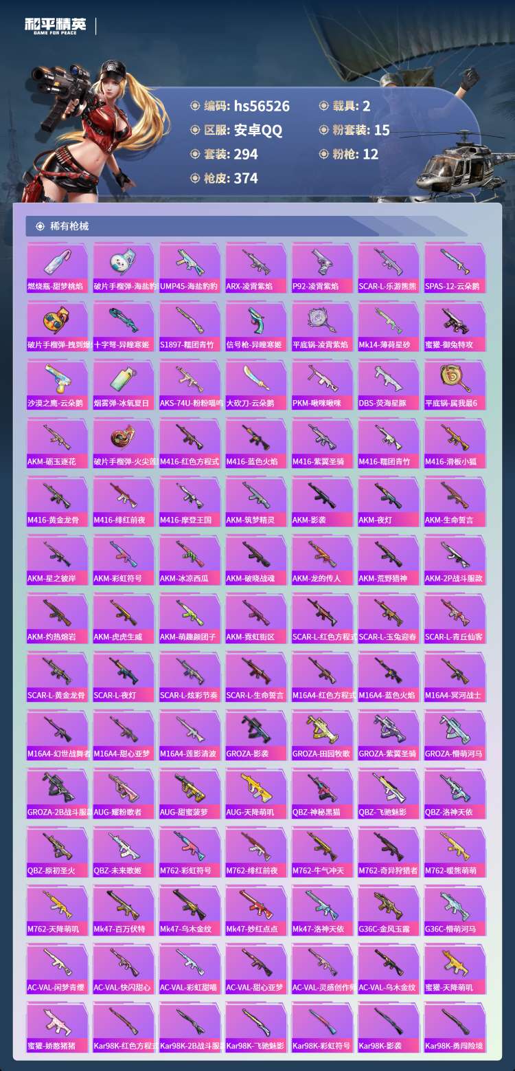 hs56526 安卓手Q-23王牌印记-有战神框-15粉装-12特效枪-2载具-121381热力值-