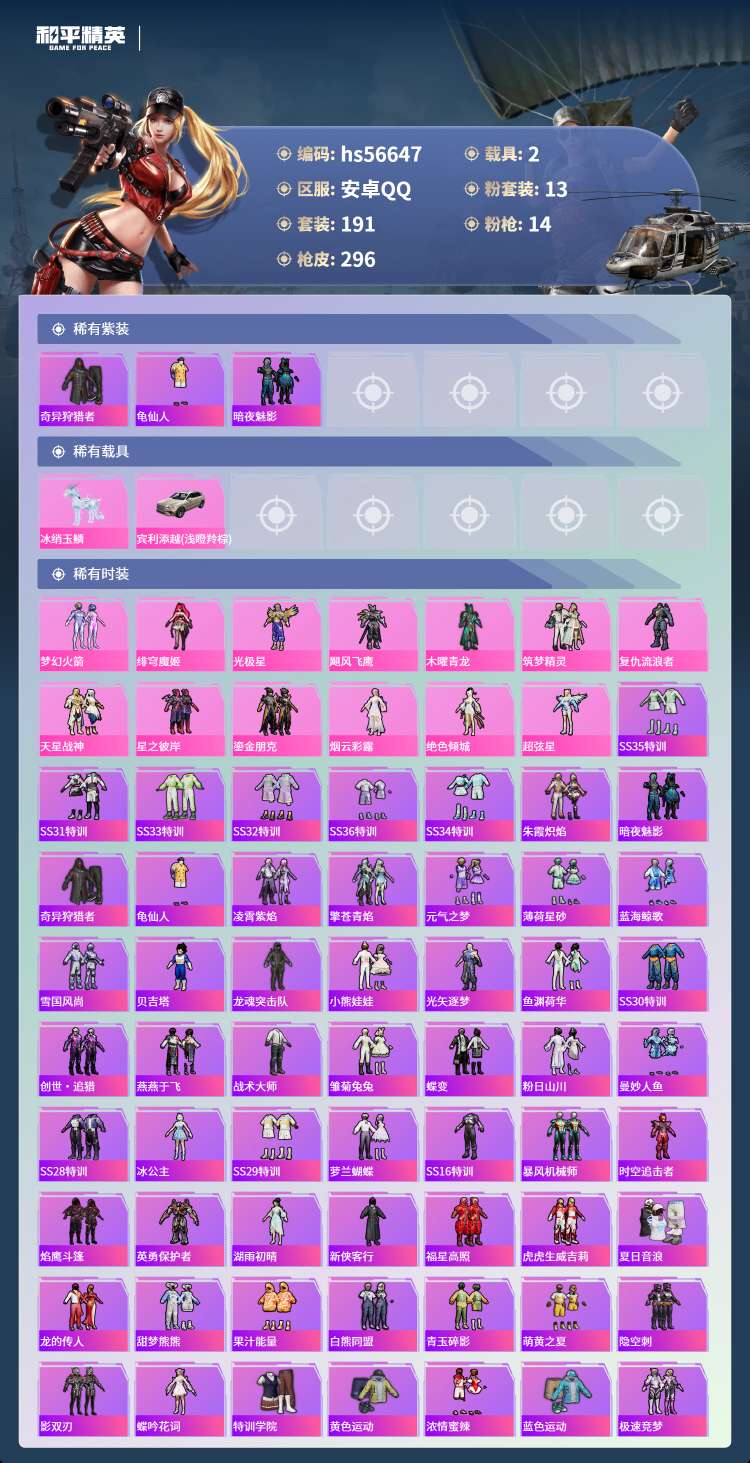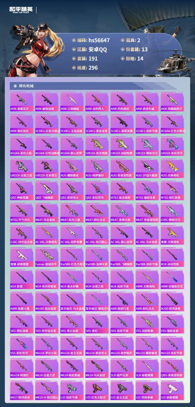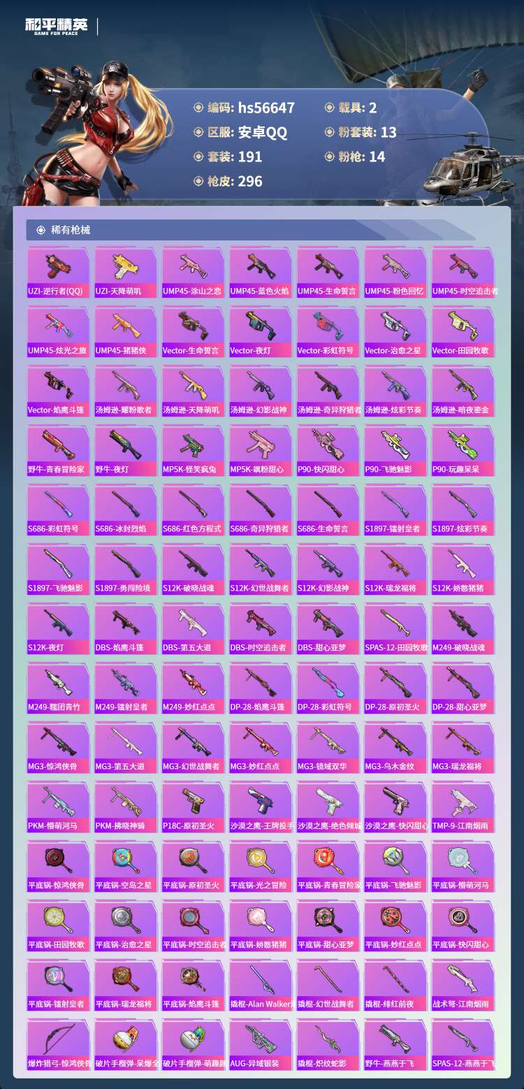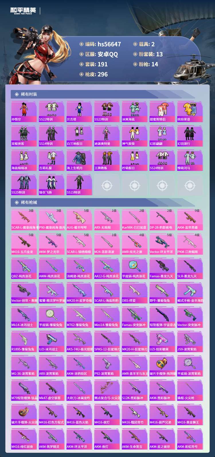 hs56647 安卓手Q-22王牌印记-13粉装-14特效枪-2载具-94322热力值-191套装-
