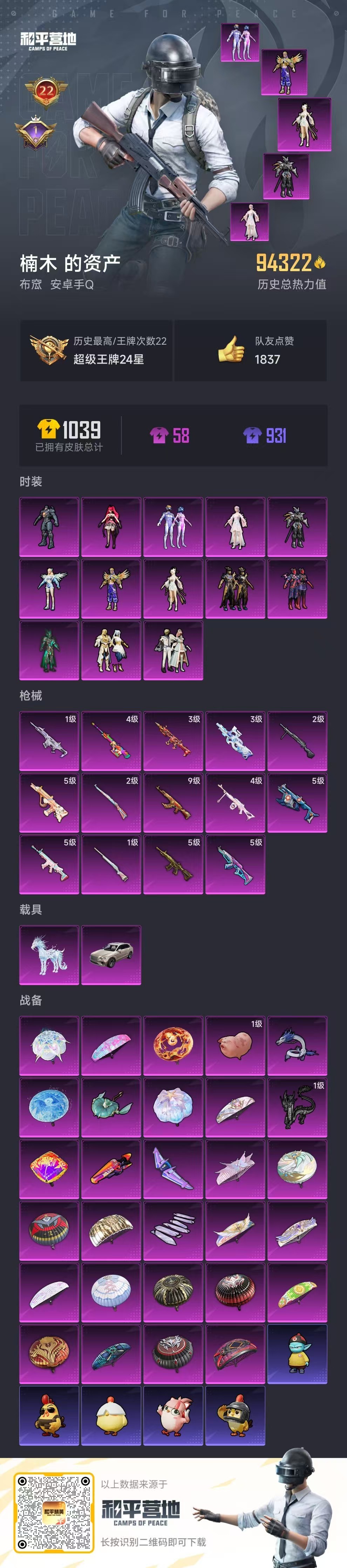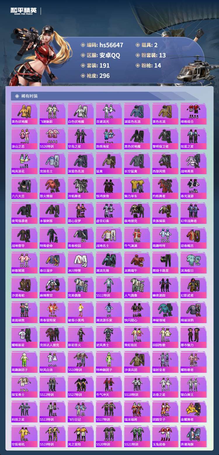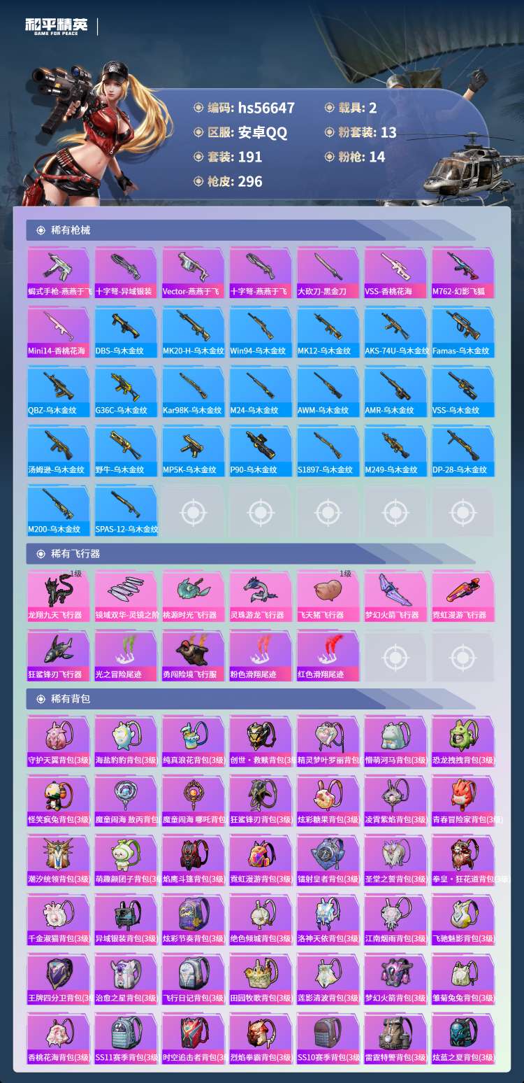 hs56647 安卓手Q-22王牌印记-13粉装-14特效枪-2载具-94322热力值-191套装-