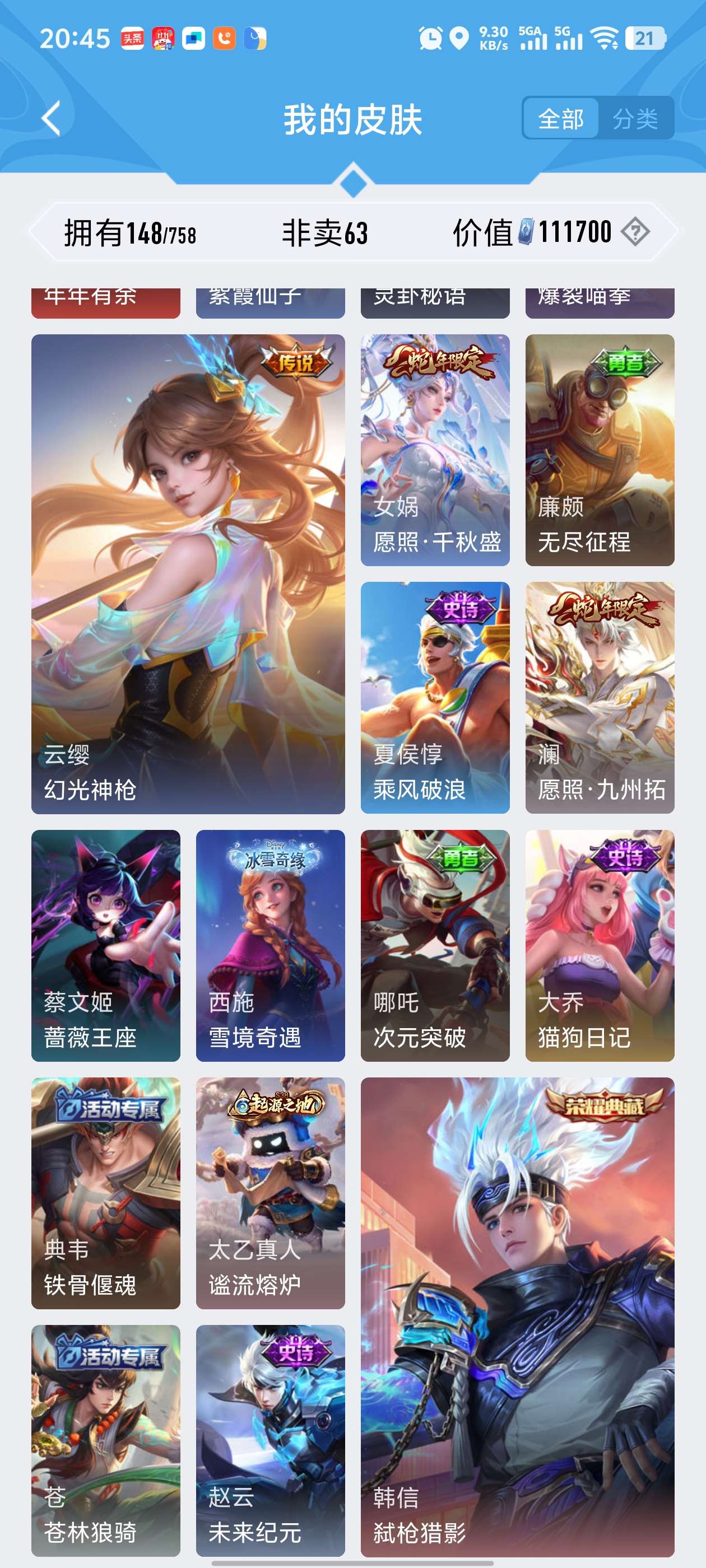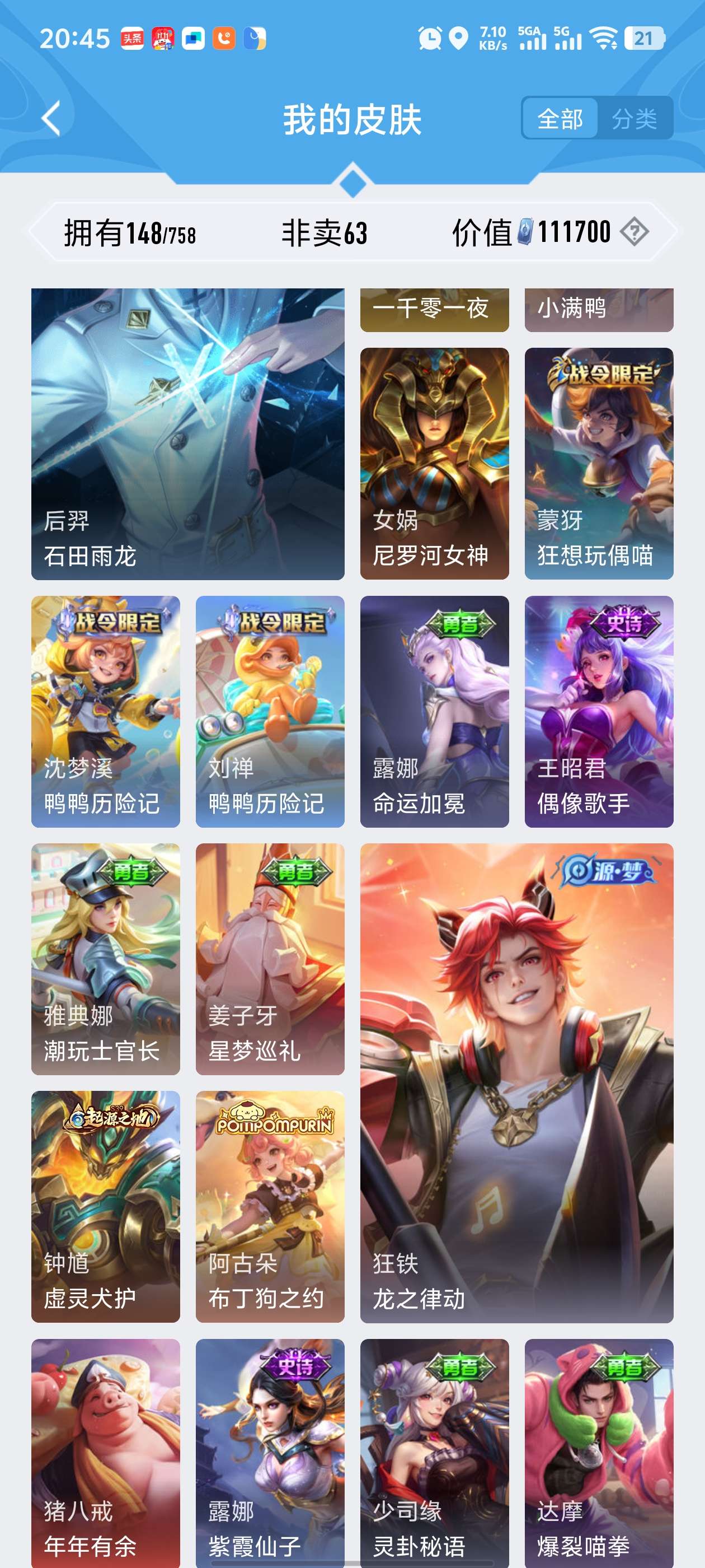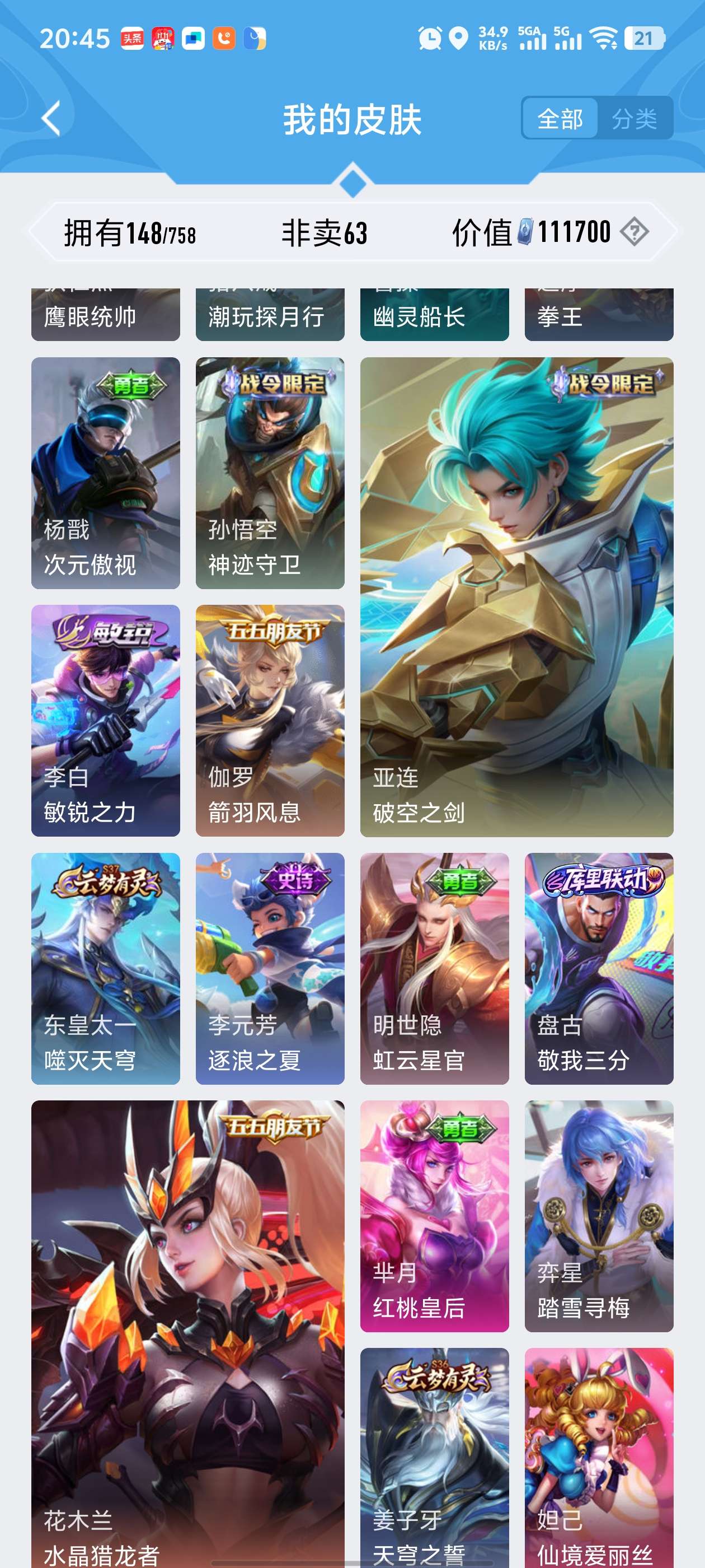 148皮肤126英雄1典藏6传说苍雷引女娲澜年限无双飞将齐天大圣等等,快v7,有本赛季战令