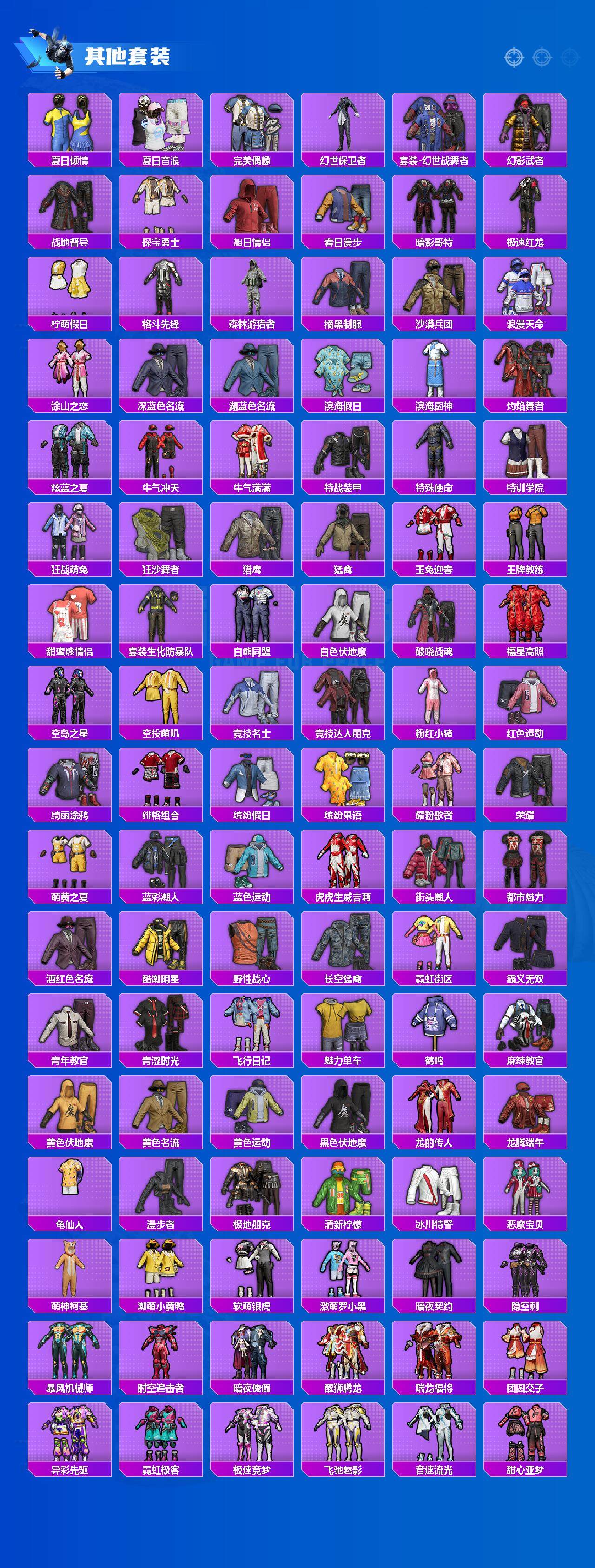 【粉色套装】:粉装-极限特训,粉装-缤纷油彩,粉装-寒光使者,粉装-未来领航者,角色-绯穹魔姬