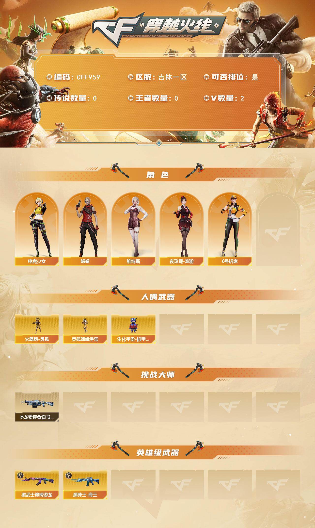 【CFF959】2V/54级/校官/电竞少女/娟娟/0号玩家/维纳斯/夜玫瑰-宠粉/火麒麟-灵狐/生化手雷-机甲核心/灵狐娃娃手雷/冰龙粉碎者-白马银枪/黑武士-锦绣游龙/黑骑士-海王/CFS限定背包/超级背包/绿色巨人/灵魂忍者/生化弹匣/夺命之镰/防化服/枪王排位28赛季金色流光/枪王排位29赛季金色流光/EP战队名片/EP战队喷图/EP战队击杀图标/防弹头盔/防弹衣/C4工具钳/手雷包