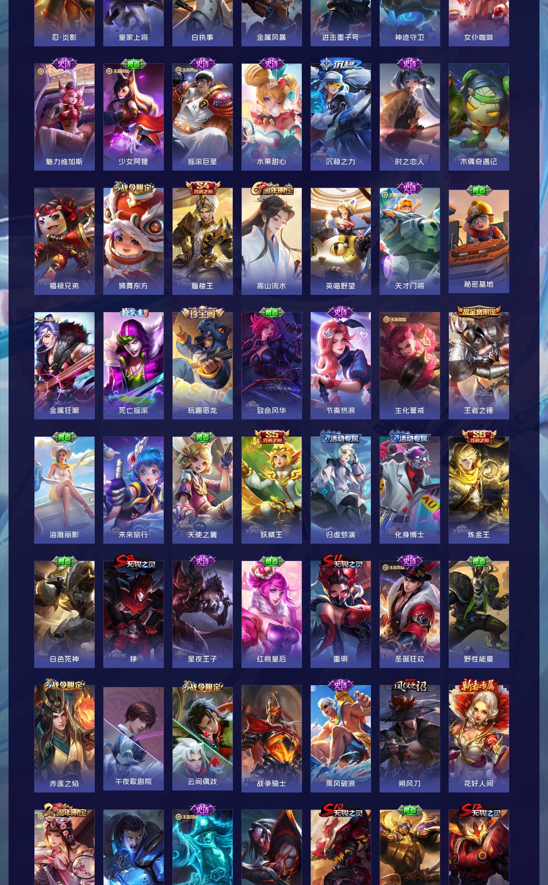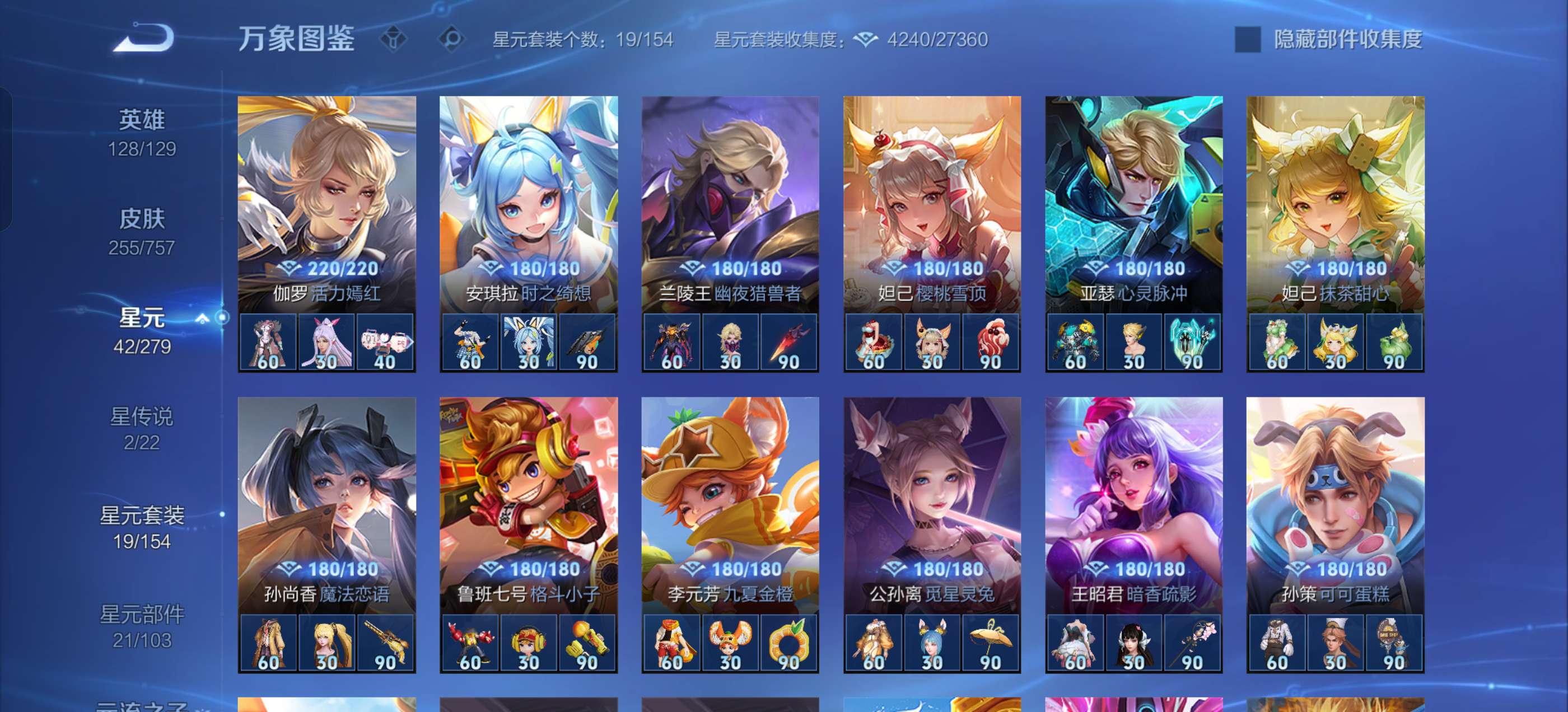 皮肤255 英雄129 尊贵铂金 荣耀典藏4 传说11 其他皮肤248
