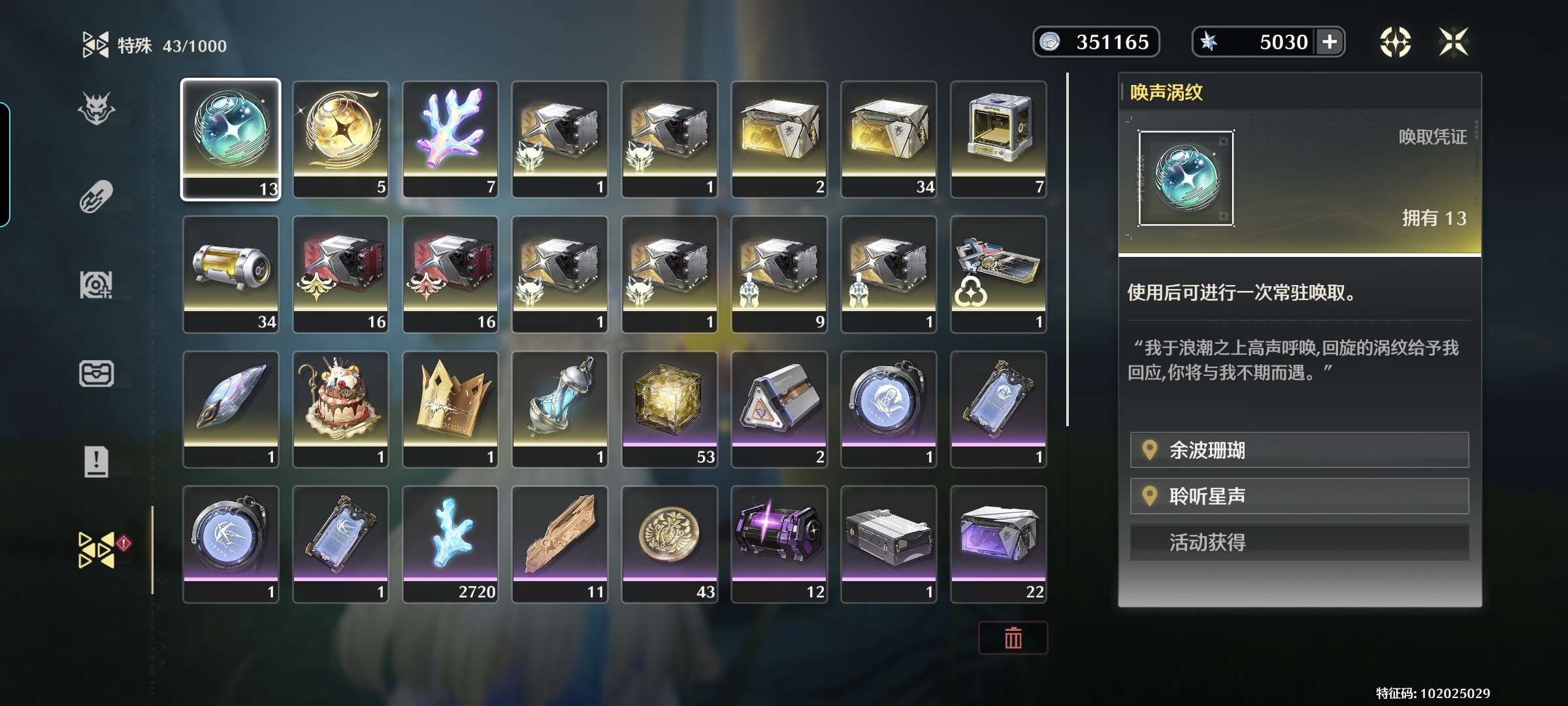 卡夏千,弗坎卜,赞菲,柯折,长离也可以留着配3.1粉毛,月卡还有45天,角色有垫了20抽,武器5抽