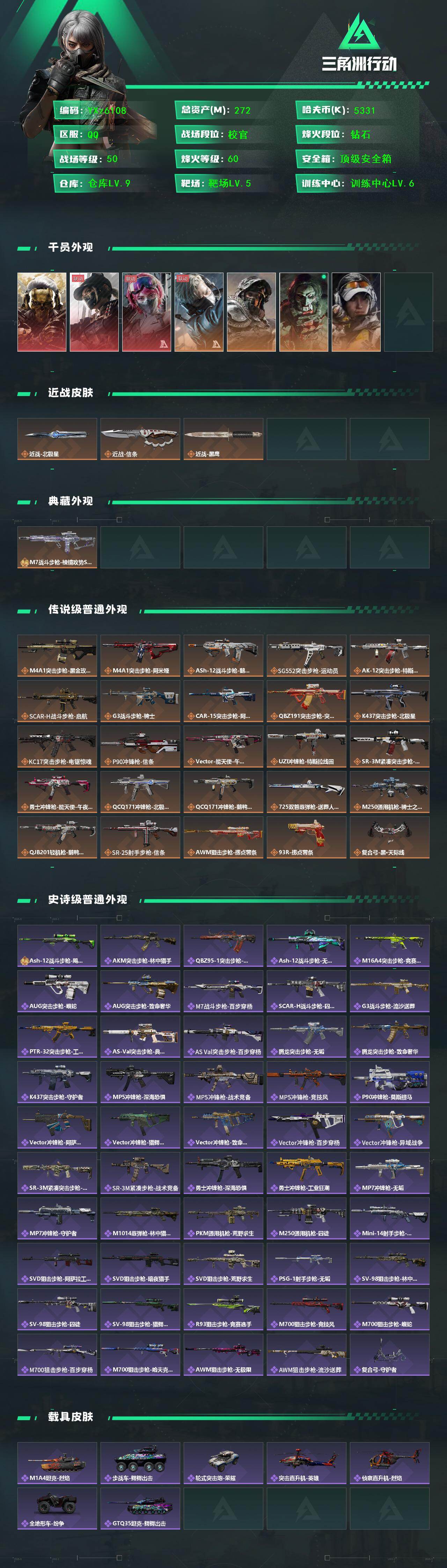 【多热门红皮号+热门北极星信条号+高额资产272M-四红皮+双刀皮+一典藏枪】【蚀金玫瑰+黑天际线+能天使午夜邮差+北极星+信条】【典藏外观】:M7战斗步枪-棱镜攻势S2(优品B)【Q区三端互通】【无二次】YXz6108-特勤处:仓库9级/靶场5级/训练中心6级-总资产272.2m-哈夫币533w-烽火等级:60级