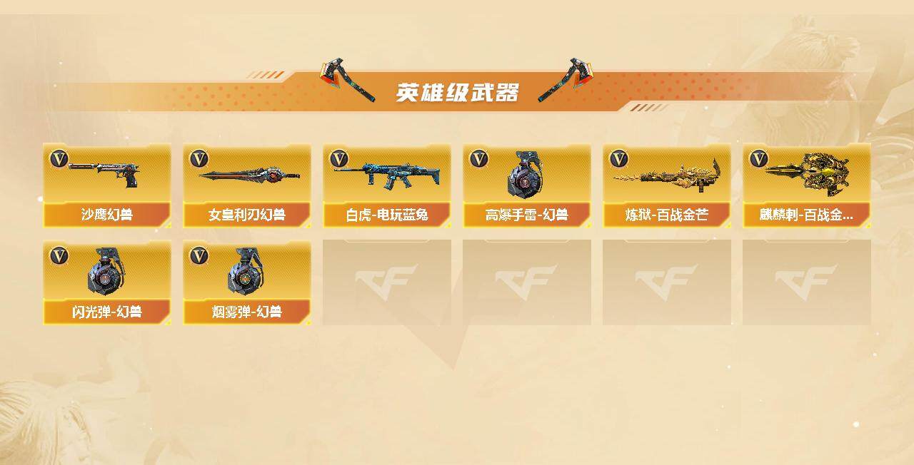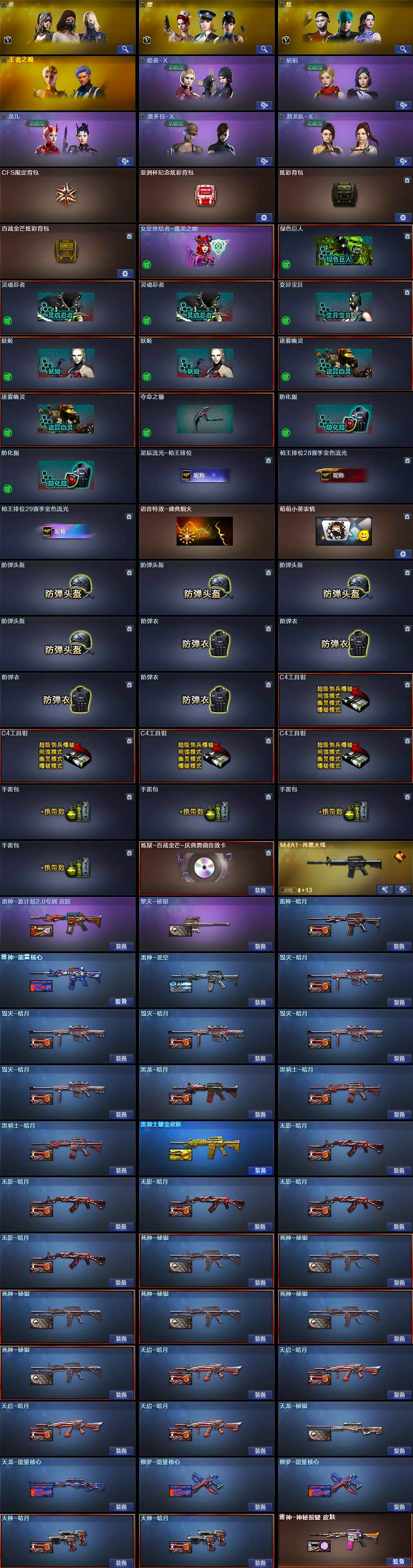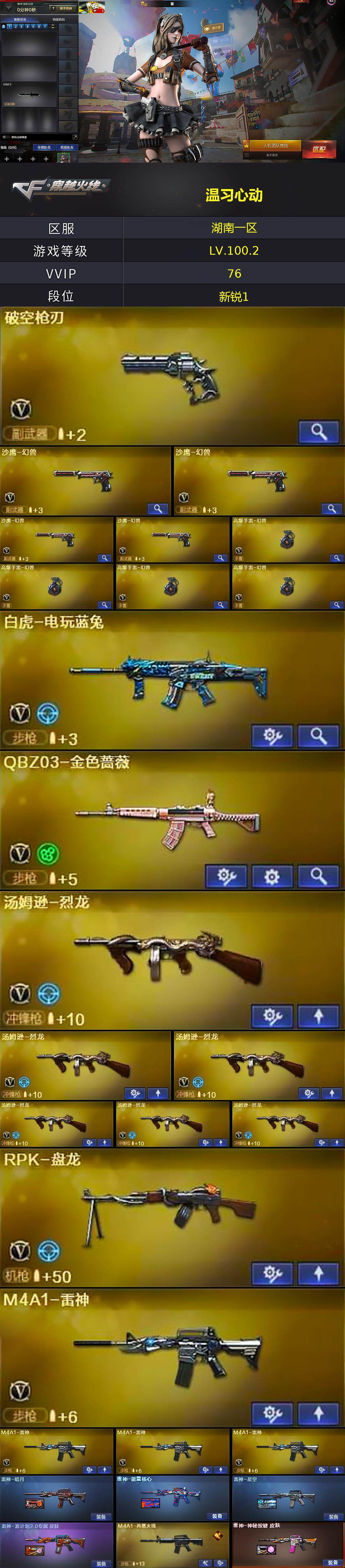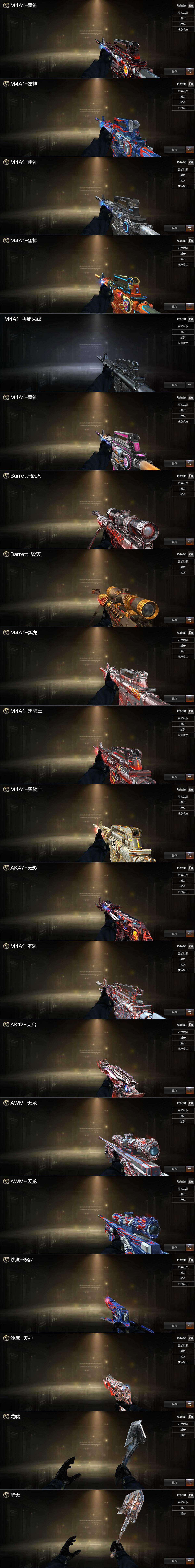 【热门武器】:QBZ03-金色蔷薇,死亡之眼*3,白虎-电玩蓝兔,C.A.T,M4A1-黑骑士*5,汤姆逊-烈龙*6,RPK-盘龙,加特林-炼狱,沙鹰-修罗*6,高爆手雷-幻兽*4