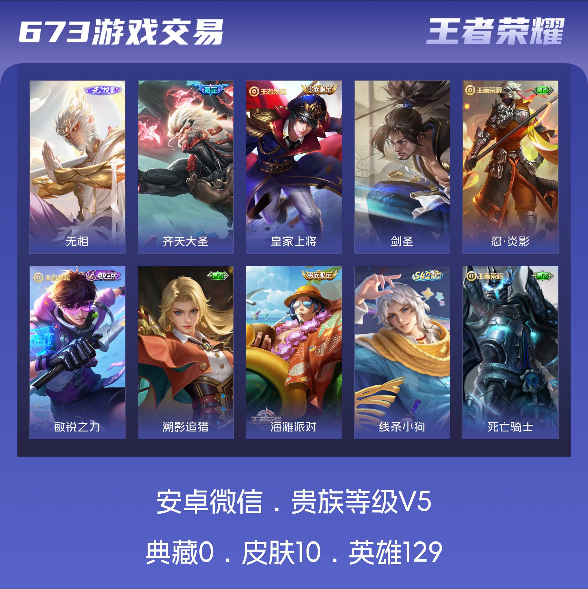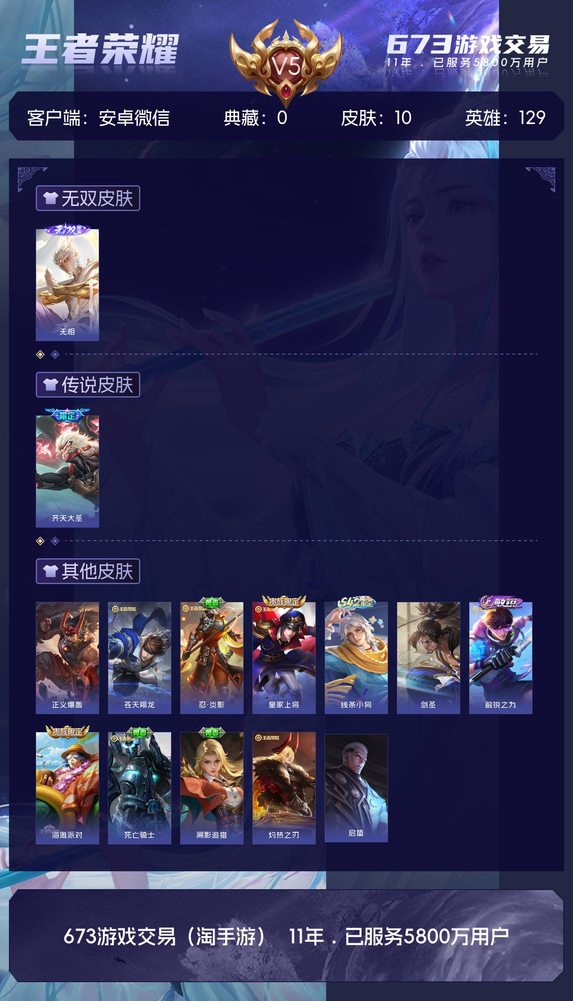 V5 皮肤10 英雄129 最强王者 无双皮肤1 传说1 其他皮肤12