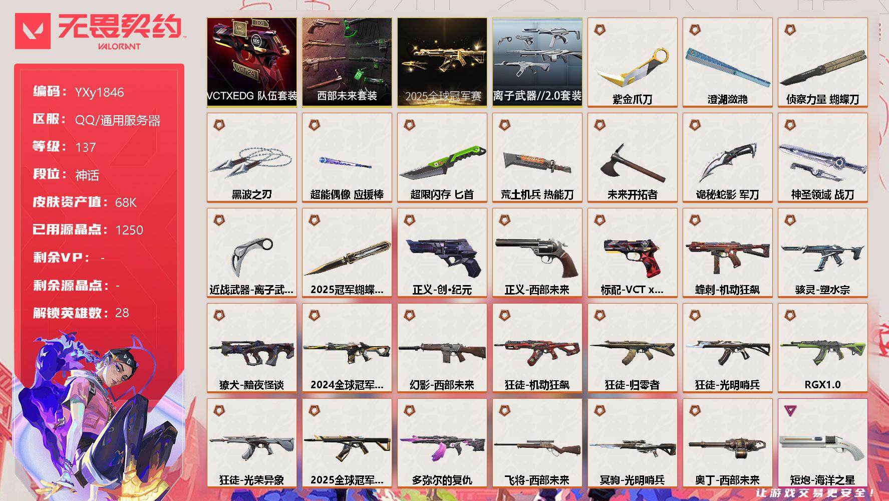 MWW495【价值60710 22冠军套 24冠军套 25冠军套 紫金爪刀 天玄刀威龙之刃】【游戏等级】Lv240 【段位】 铂金I 【R点】1,450 【皮肤总价值】60,710 【英雄数量】28 【皮肤数量】128 【挂饰数量】126 【卡面数量】199 【喷漆数量】159 【鬼魅】鬼魅-幻心猎手 鬼魅-诡秘蛇影 鬼魅-星云暗涌 鬼魅-模拟赫兹 鬼魅-采蜜小蜂队 鬼魅-流星兵团 鬼魅-光导纤维 鬼魅-耀鳞威龙 【戍卫】戍卫-天界神兵 戍卫-折光棱晶 戍卫-逆冲蛮牛 戍卫-浮光跃金 戍卫-超