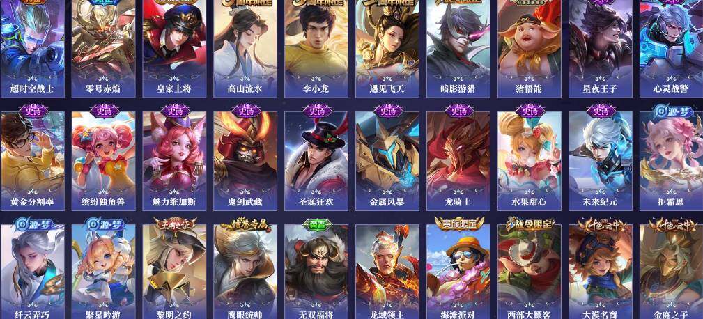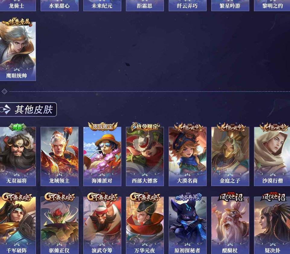 【限定皮肤】:白起狰,狄仁杰阴阳师,赵云皇家上将,庄周高山流水,芈月重明,夏侯惇朔风刀,典韦穷奇,马可波罗暗影游猎,狄仁杰万华元夜,达摩沙漠行僧,项羽海滩派对,老夫子醍醐杖,程咬金演武夺筹,兰陵王金庭之子,孙悟空零号赤焰,牛魔御旌,钟馗驱傩正仪