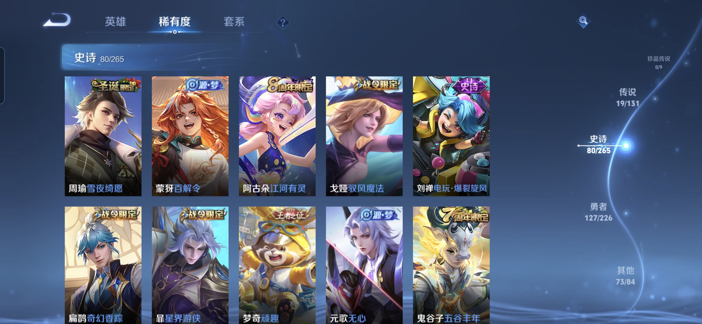 【史诗皮肤】 天狼征服者 岱宗 天狼溯光者 冰锋战神 飞衡 辉光之辰 默契交锋 御风骁将 逐梦之星 奔雷神使 天狼绘梦者 至尊宝 霸王别姬 霸王别姬 雪夜绮愿 聚星闪耀 江河