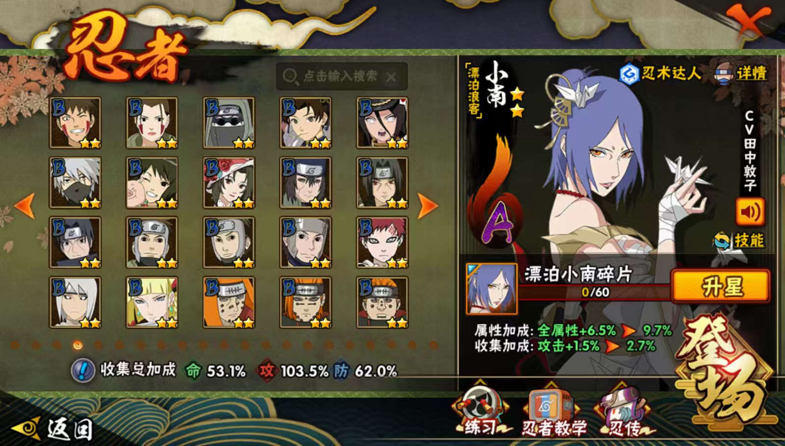 【S级】千手扉间「秽土转生」 千手柱间「木叶创立」 猿飞日斩「秽土转生」 神秘面具男「红夜之刃」 纲手 宇智波斑「五影会谈」 宇智波斑「白面具」 佩恩「天道」 大筒木桃式 自来也「舞之豪杰」 长门「秽土转生」 漩涡鸣人·宇智波佐助 波风水门 艾「忍界大战」 宇智波止水「须佐能乎」 宇智波佐助「永恒万花筒」 宇智波斑「秽土转生·解」