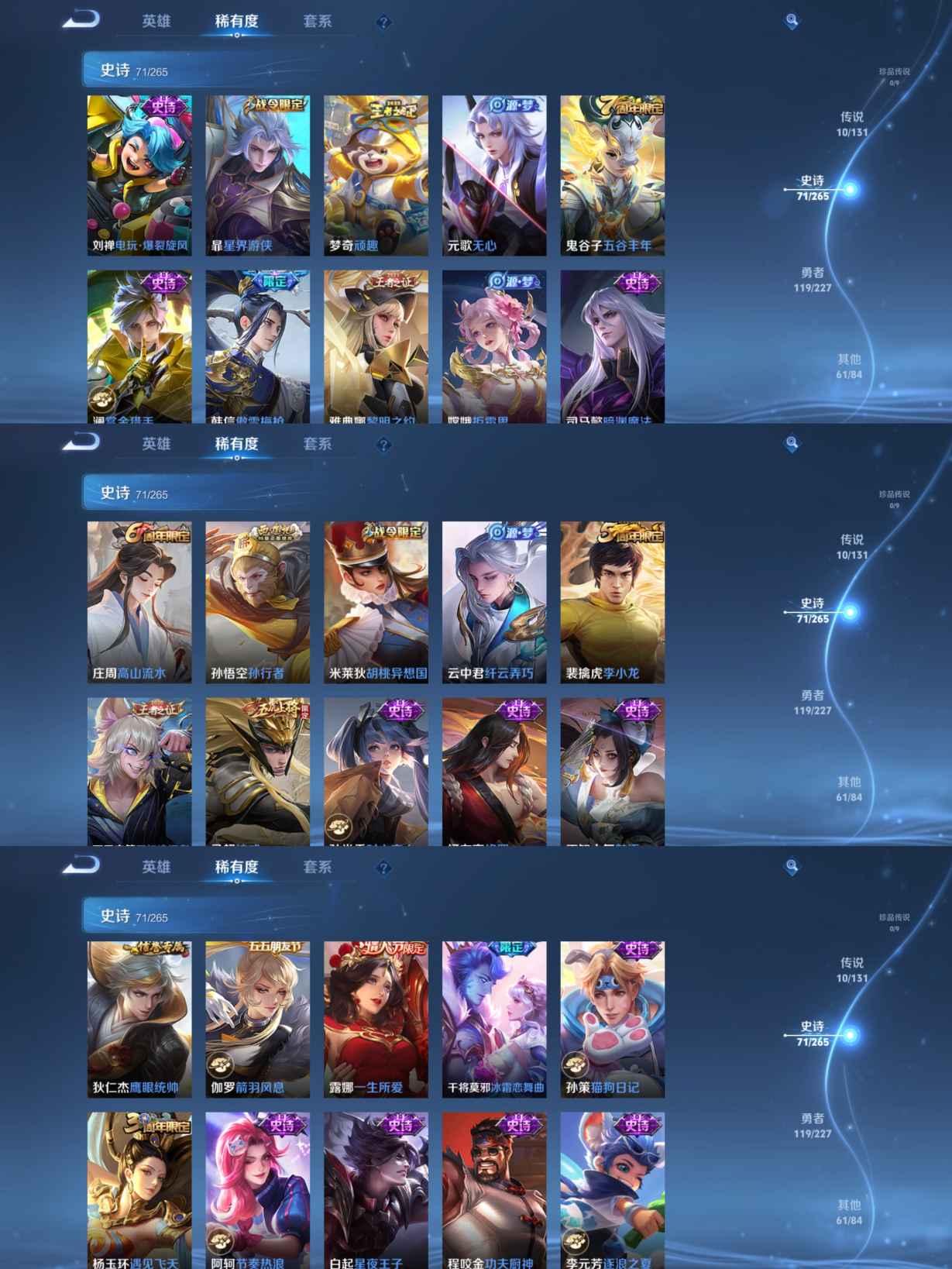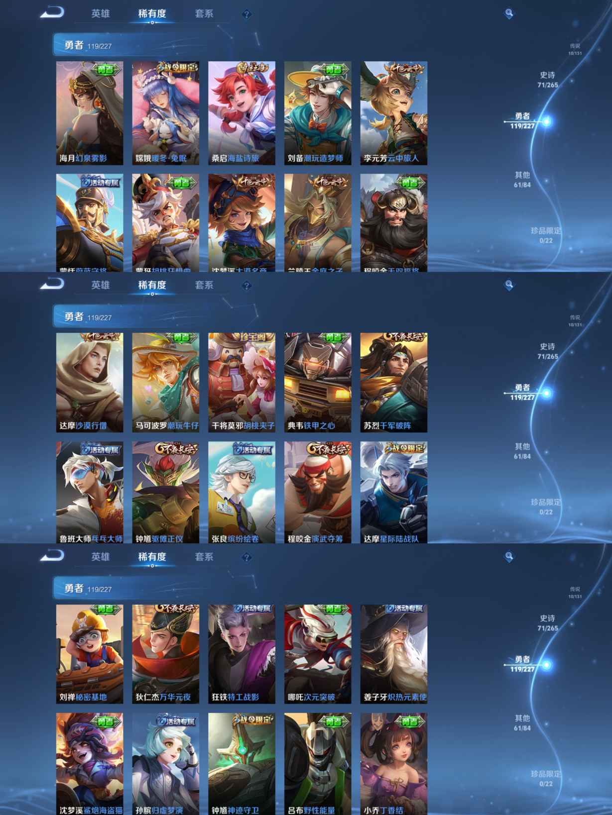 【史诗皮肤】 星界战将 冰霜恋舞曲 傲雪梅枪 布丁狗之约 谧流熔炉 一生所爱 神威 涂山容容 孙行者 龙之律动 青焰无极 踏浪烽翎 苍威无极 江河有灵 百解令 荣光圣徽 顽岩魄 死神来了 化蝶舞 星界游侠 顽趣 魅语