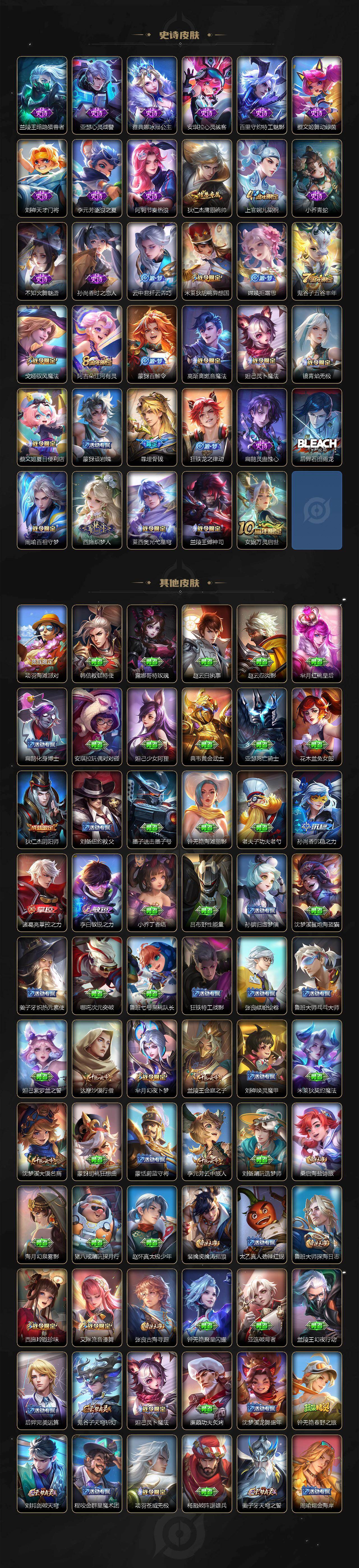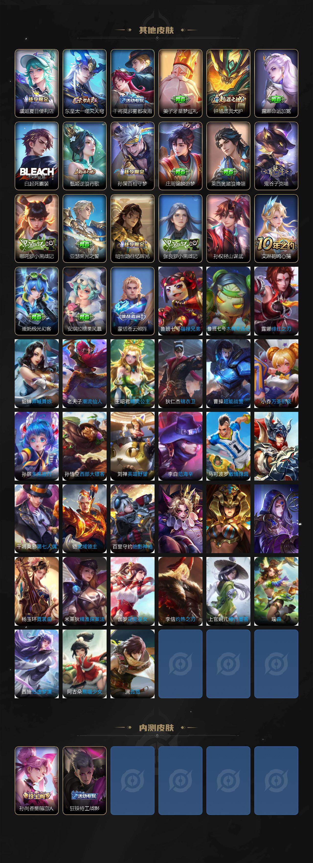 【限定皮肤】:暃埋骨钱,蒙犽顽岩魄,蔡文姬夏日便利店,虞姬夏日便利店,姜子牙天穹之誓,杨戬破阵退雄兵,狄仁杰阴阳师,赵云皇家上将,孙尚香蔷薇恋人,芈月幻夜卜梦,狄仁杰魔术师,达摩沙漠行僧,项羽海滩派对,安琪拉魔法小厨娘,兰陵王金庭之子,李元芳云中旅人,鬼谷子五谷