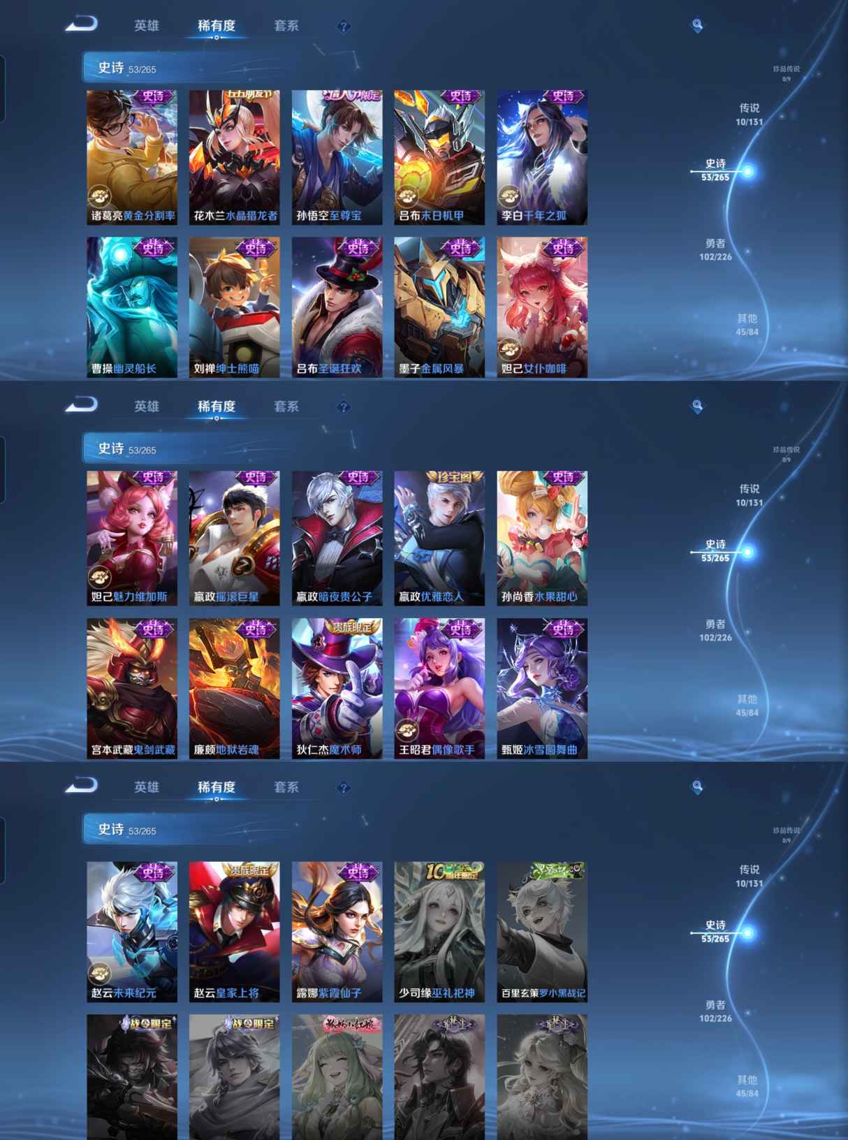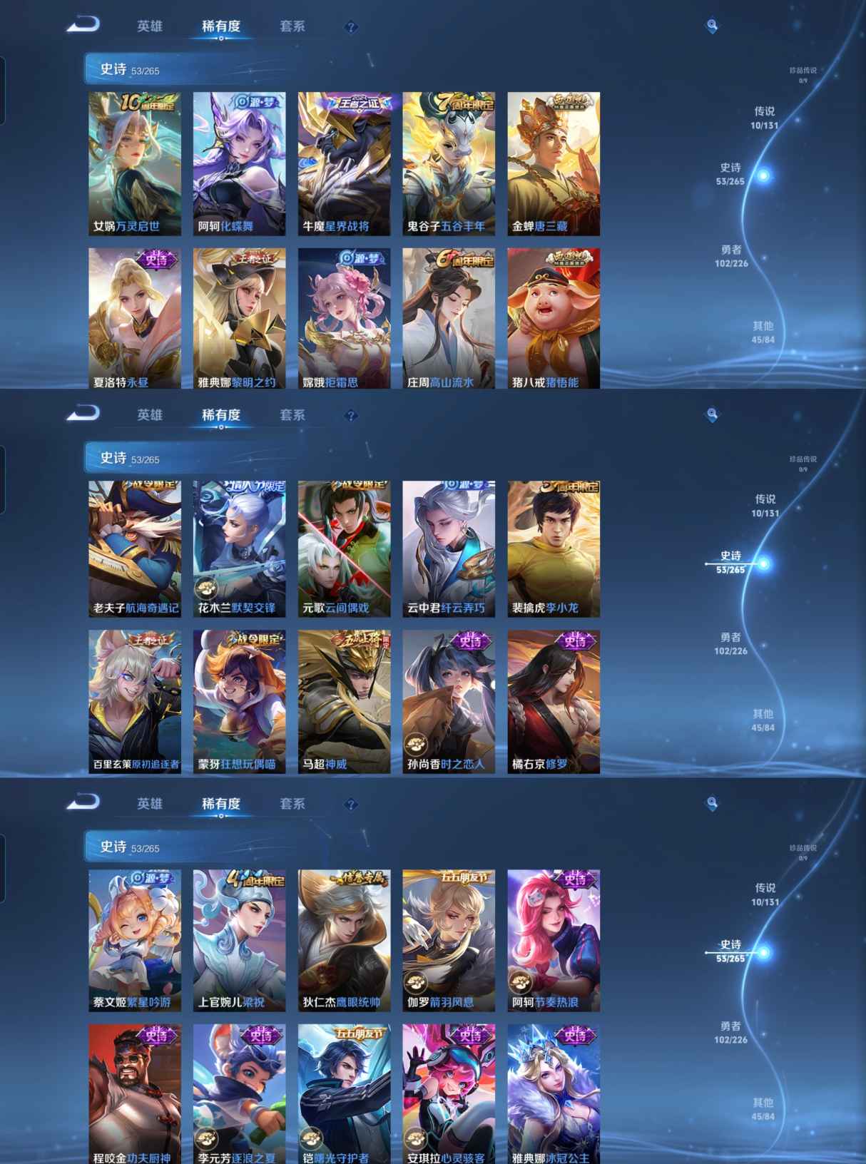 【史诗皮肤】 星界战将 默契交锋 布丁狗之约 谧流熔炉 神威 至尊宝 踏浪烽翎 万灵启世 化蝶舞 幽灵船长 繁星吟游 拒霜思 功夫厨神 女仆咖啡 魅力维加斯 魔术师 鹰眼统帅 箭羽风息 鬼剑武藏 水晶猎龙者 修罗 曙光守护者 航海奇遇记 千年之