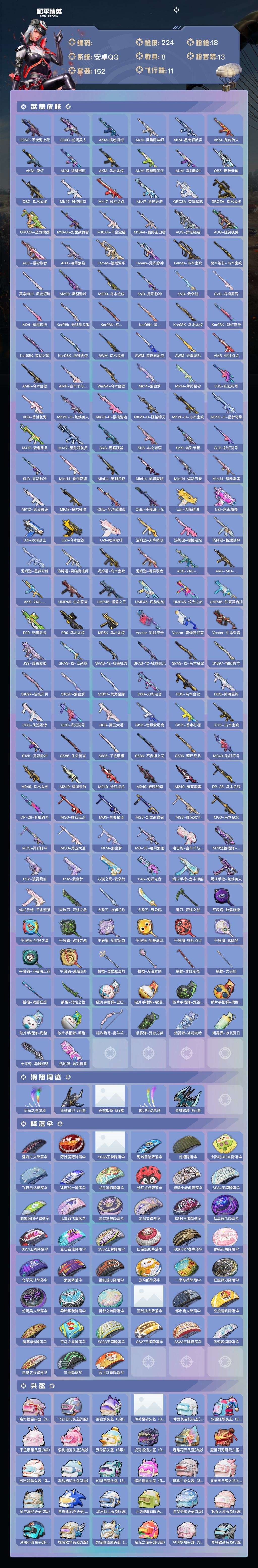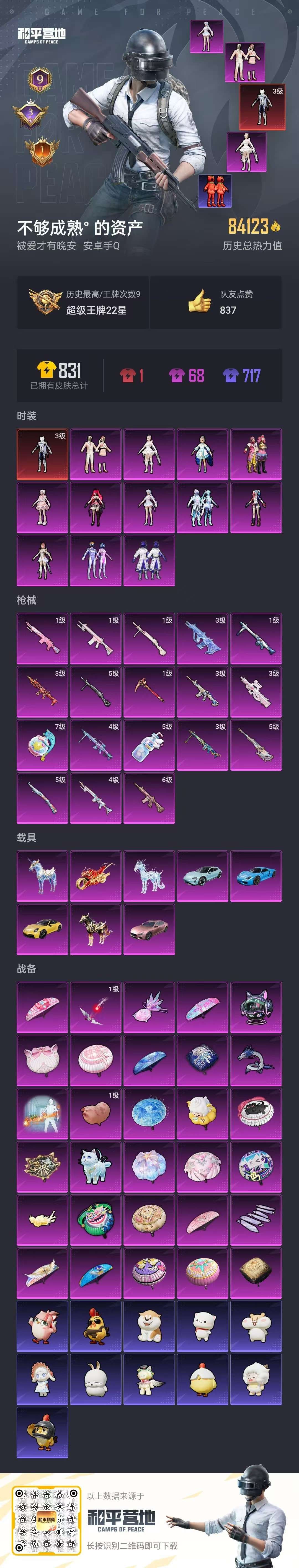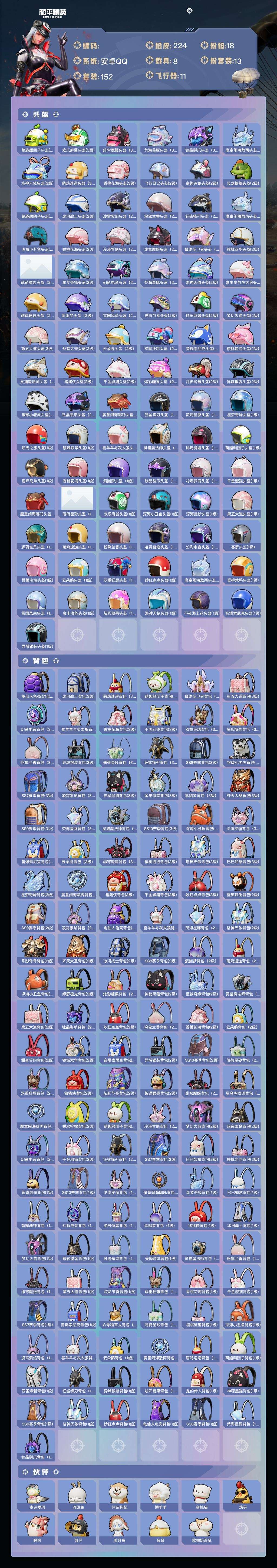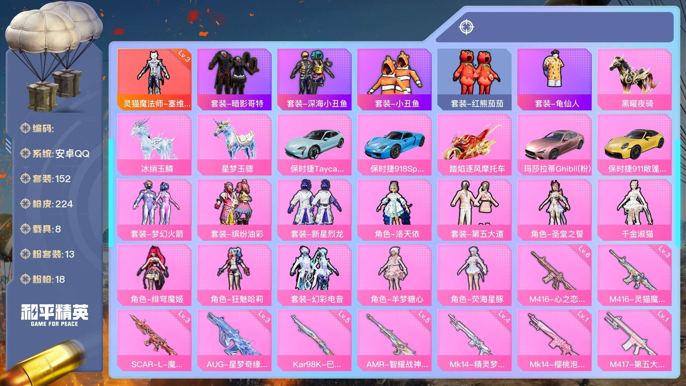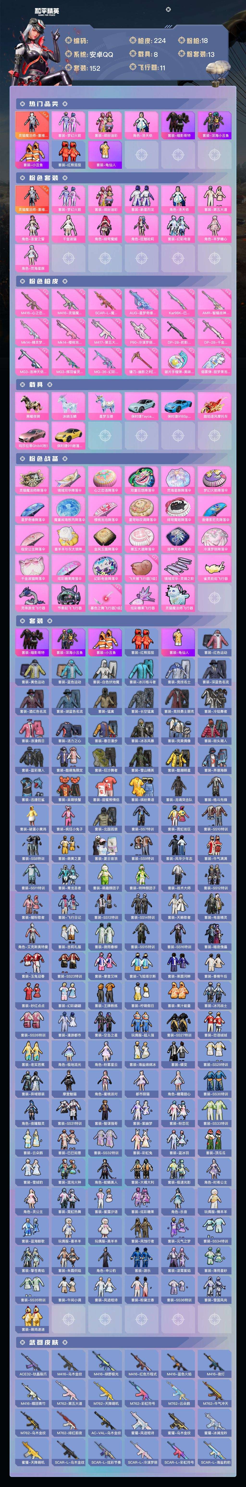 a4215/安卓QQ/热力值:84123,1神装,12粉装,18粉枪,8载具,29粉色战备,152套