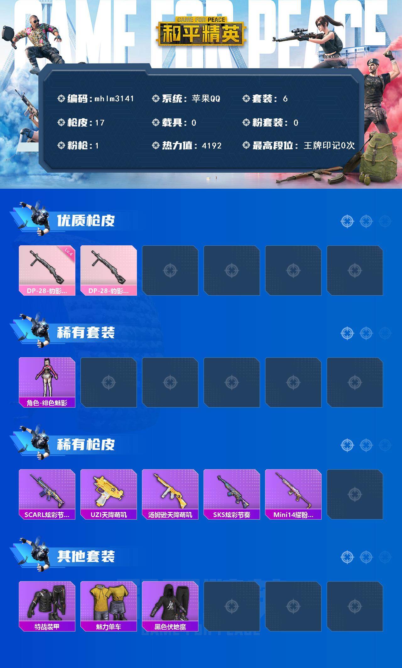 【mhlm3141】苹果 手Q-0粉装-1特效枪-0载具-1粉色飞行器-4192热力值-0王牌印记-6套装-17枪皮