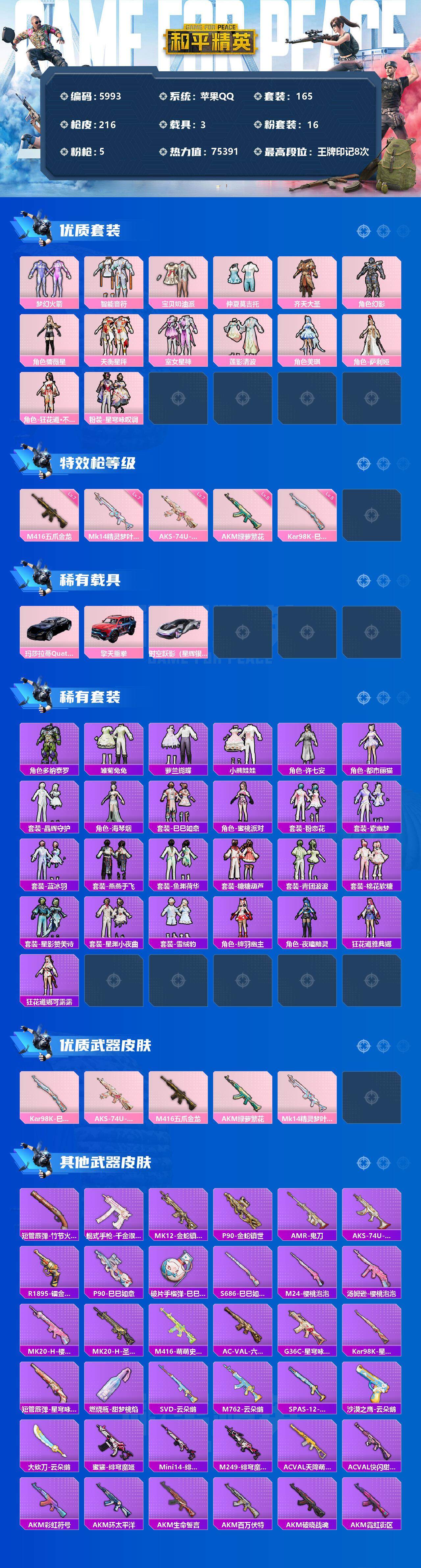 【5993】16粉装-5特效枪-3载具-75391热力值-8印记-165套装-