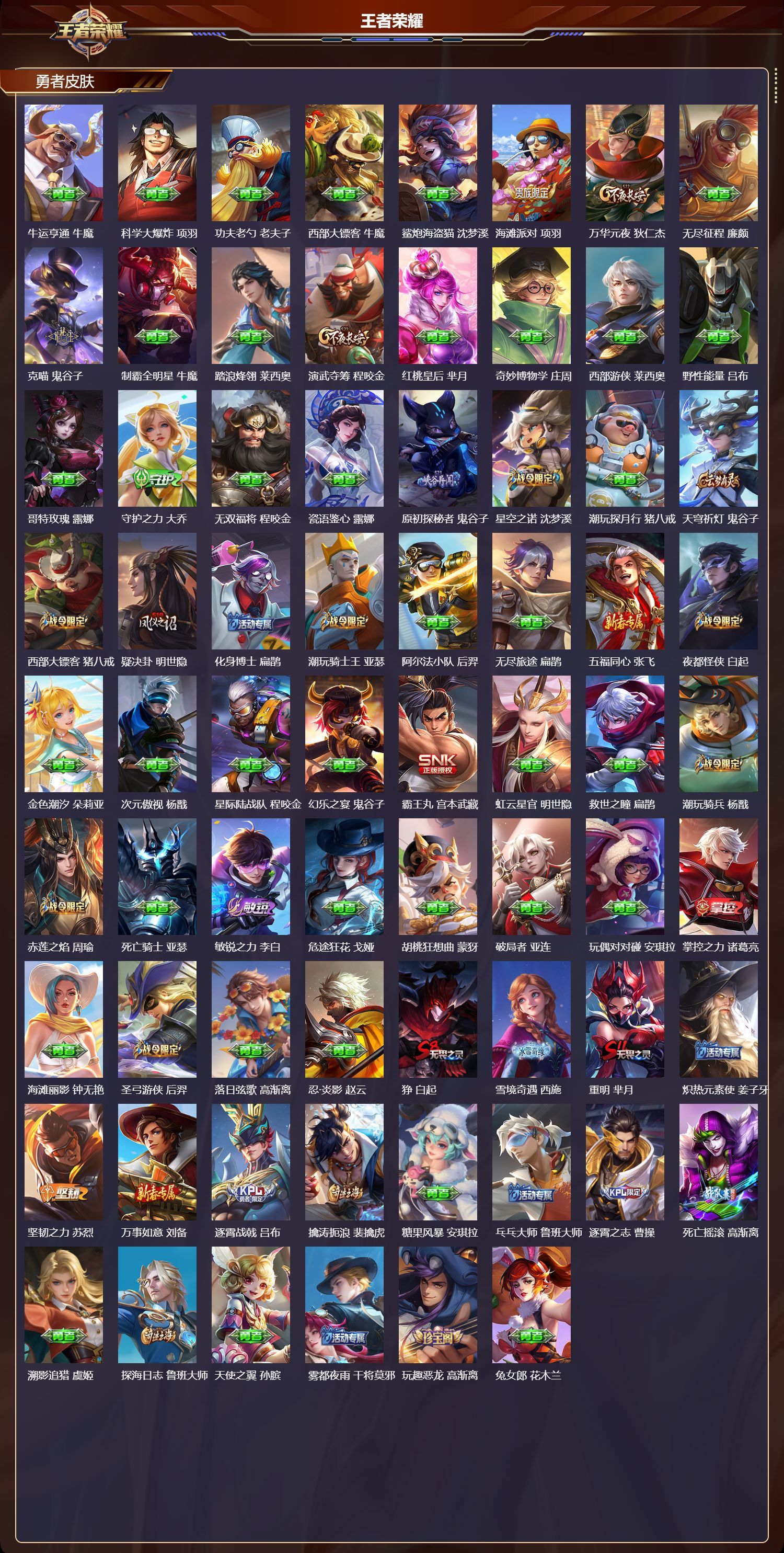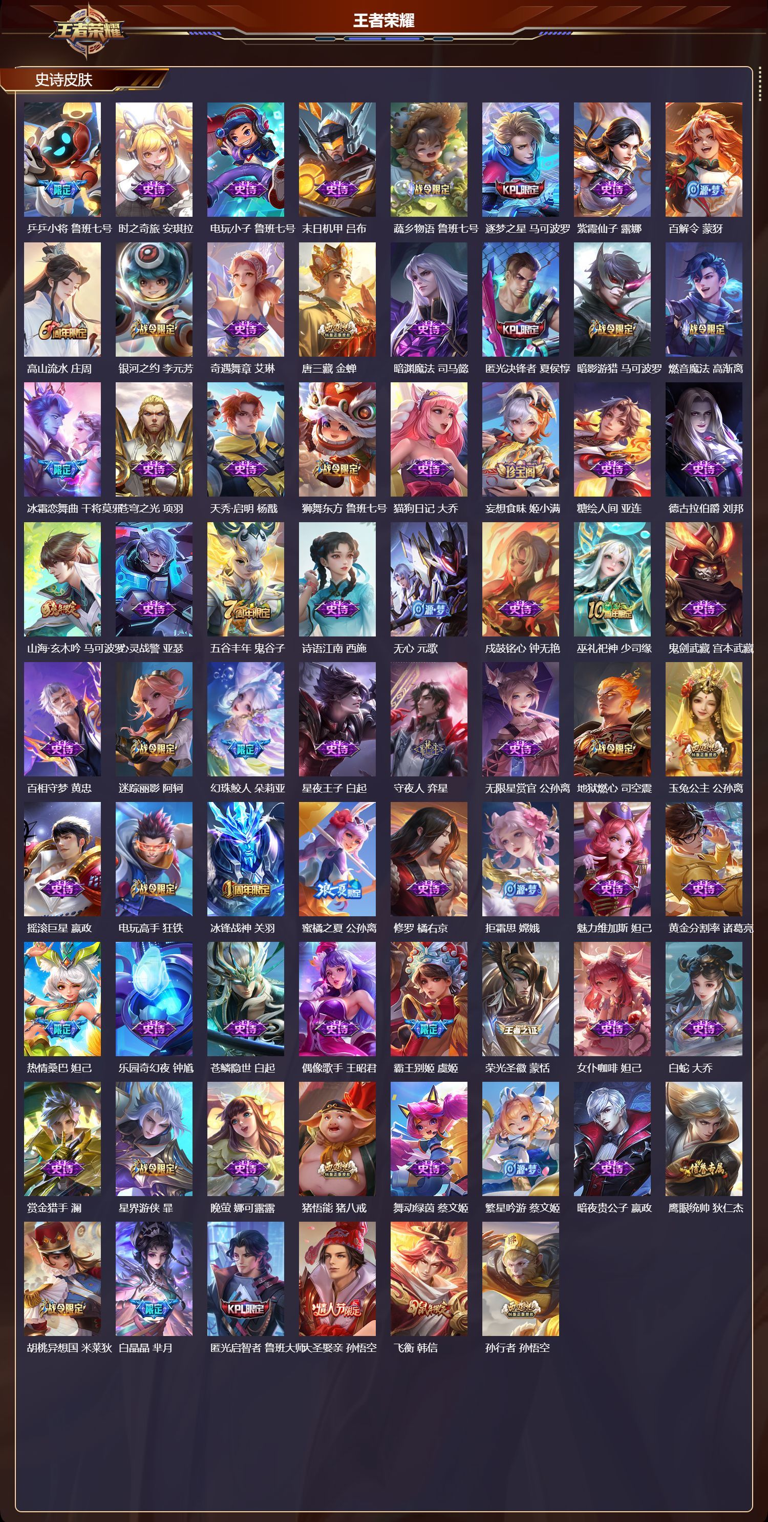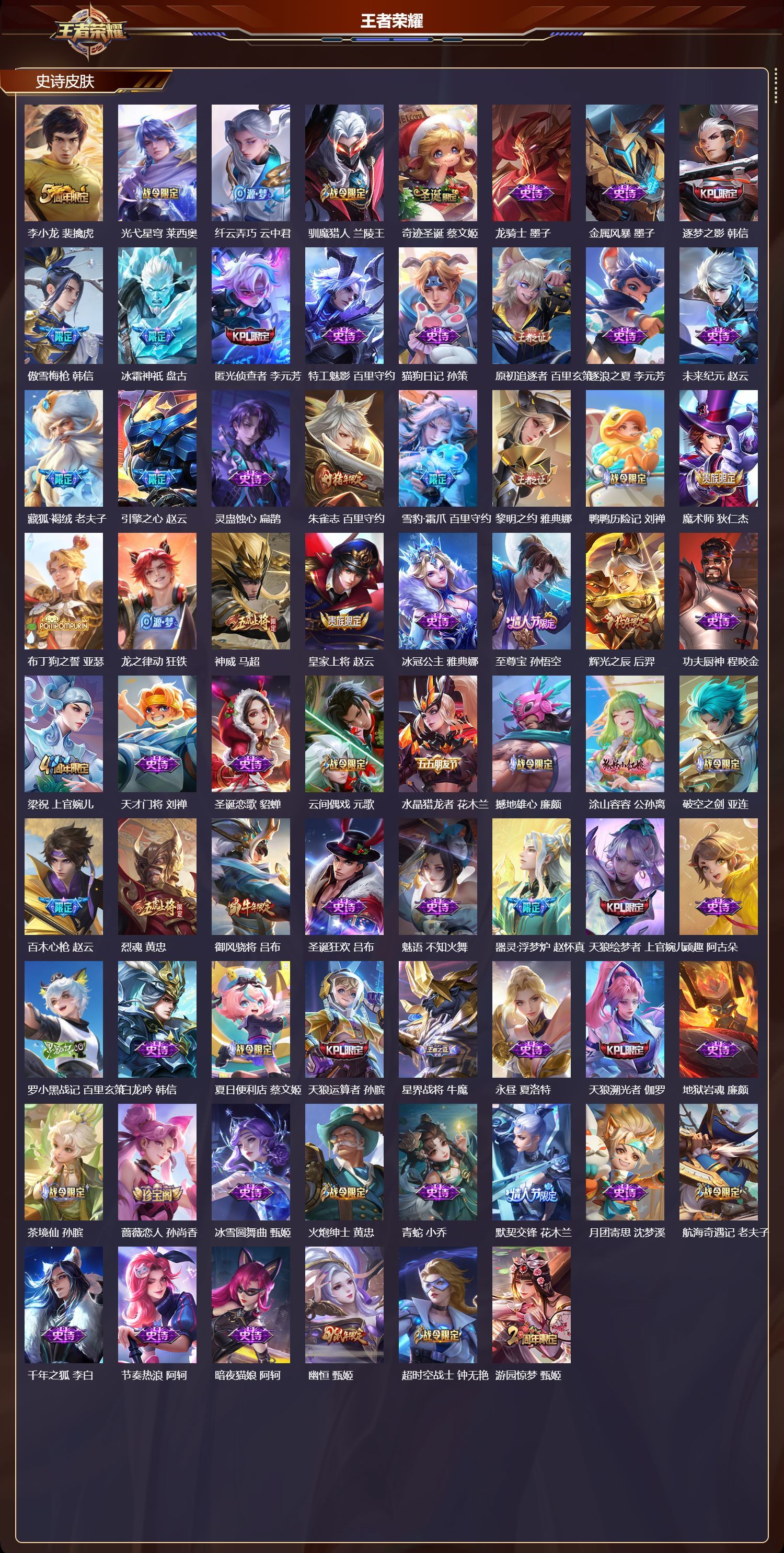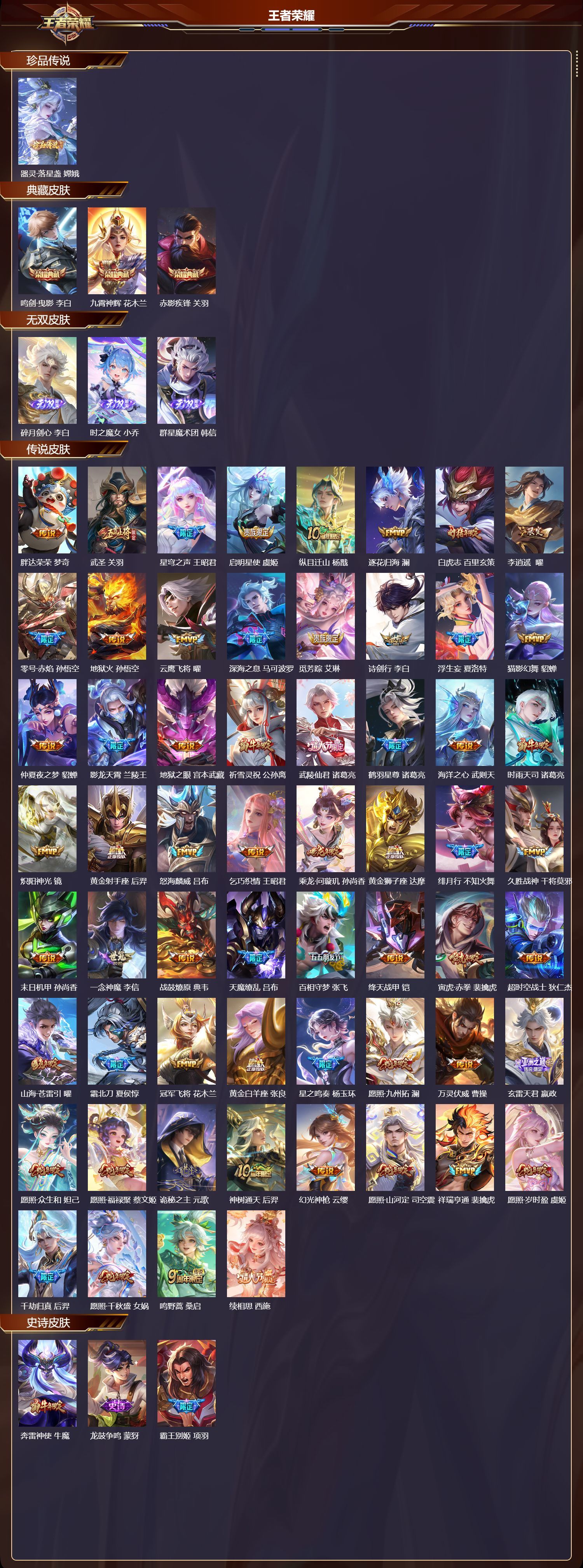 苹果QQ/荣耀王者/497皮肤/128英雄/3典藏/0珍品无双/3无双/1珍品传说/60传说/175