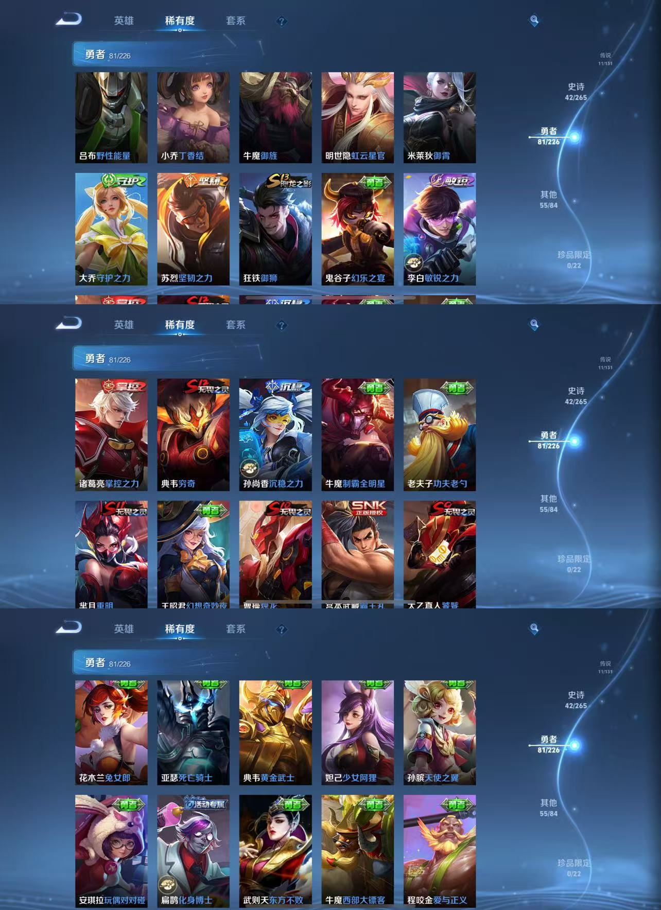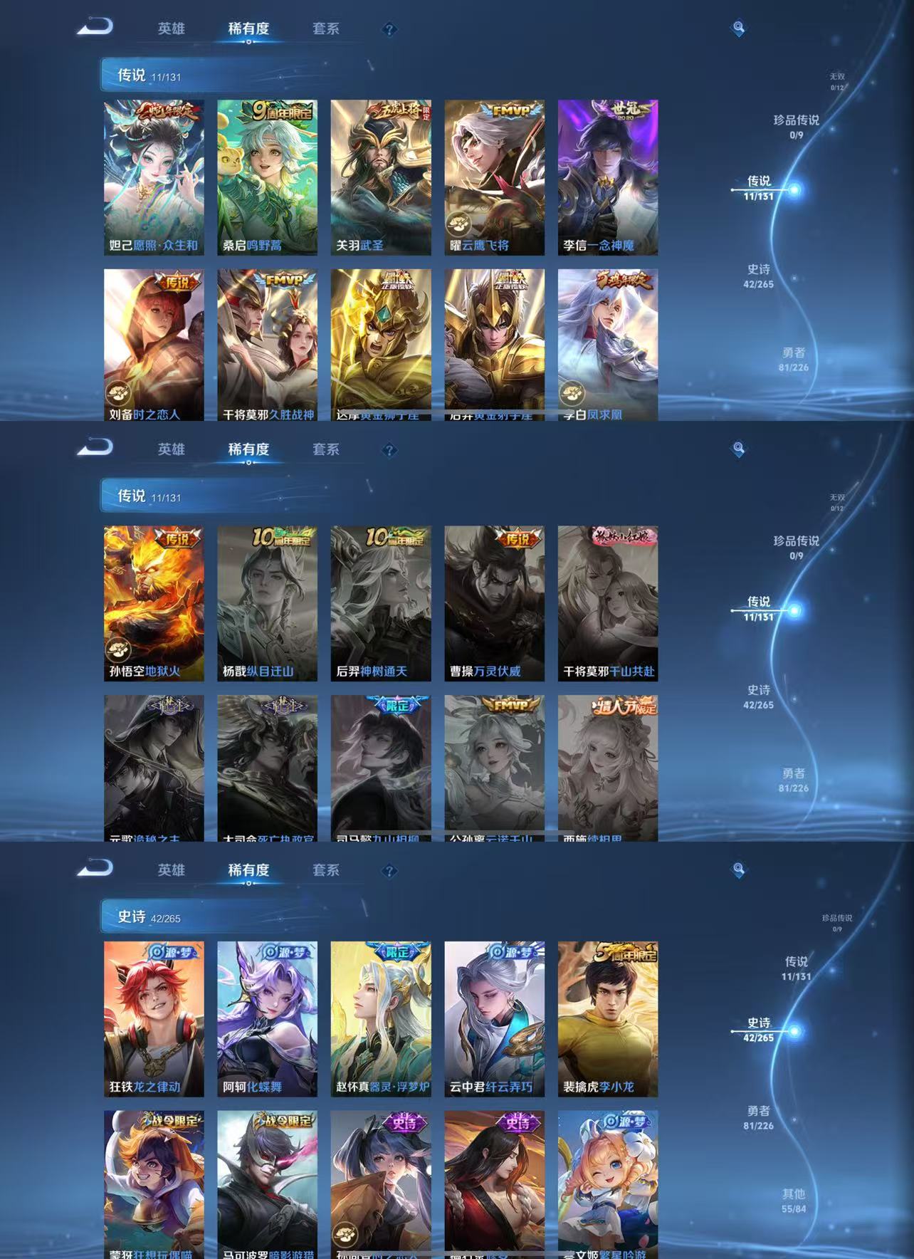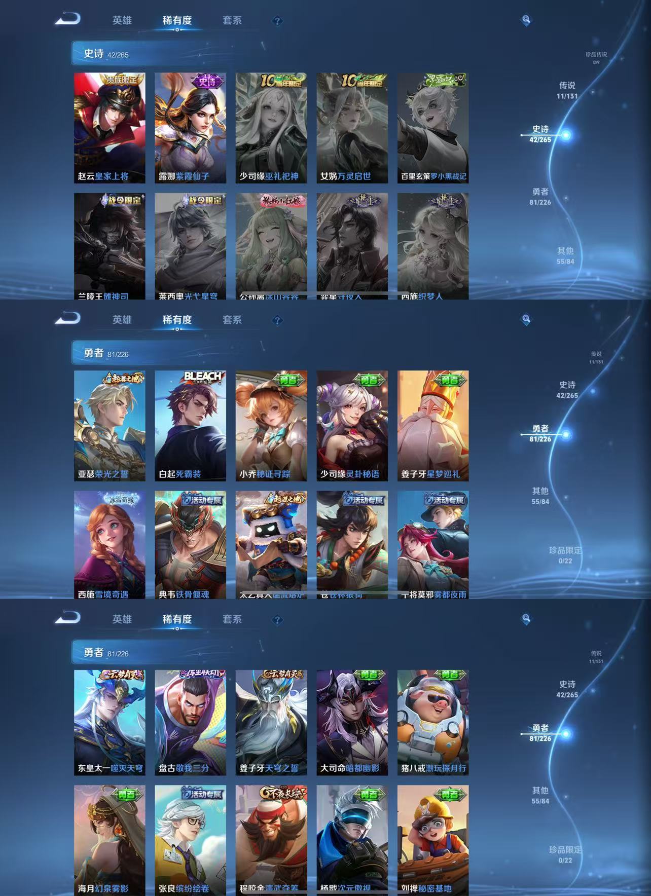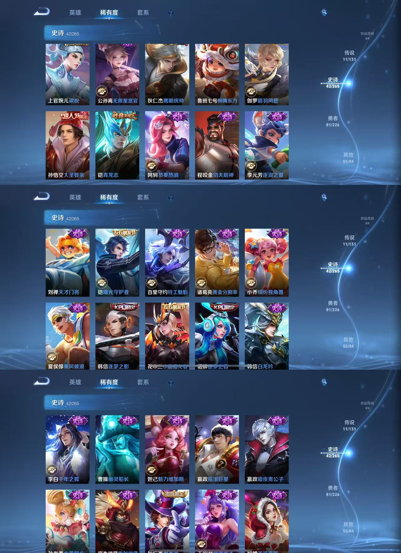 【史诗皮肤】 逐梦之音 逐梦之影 器灵·浮梦炉 青龙志 谧流熔炉 大圣娶亲 龙之律动 化蝶舞 幽灵船长 繁星吟游 功夫厨神 魅力维加斯 魔术师 鹰眼统帅 圣诞恋歌 箭羽风息 无限星赏官 鬼剑武藏 白龙吟 水晶猎龙者 修罗 曙光守护者 千年之狐 逐浪之夏 天才门将 紫霞仙子 狮舞东方 暗影游猎 狂