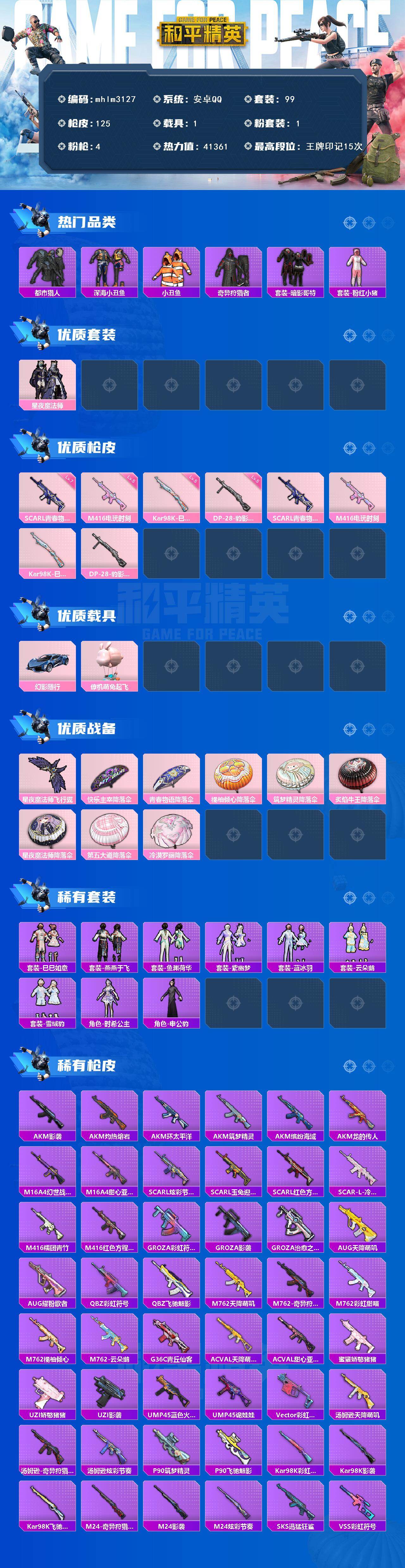 【mhlm3127】安卓 手Q-1粉装-4特效枪-1载具-2粉色飞行器-41361热力值-15王牌印记-99套装-125枪皮