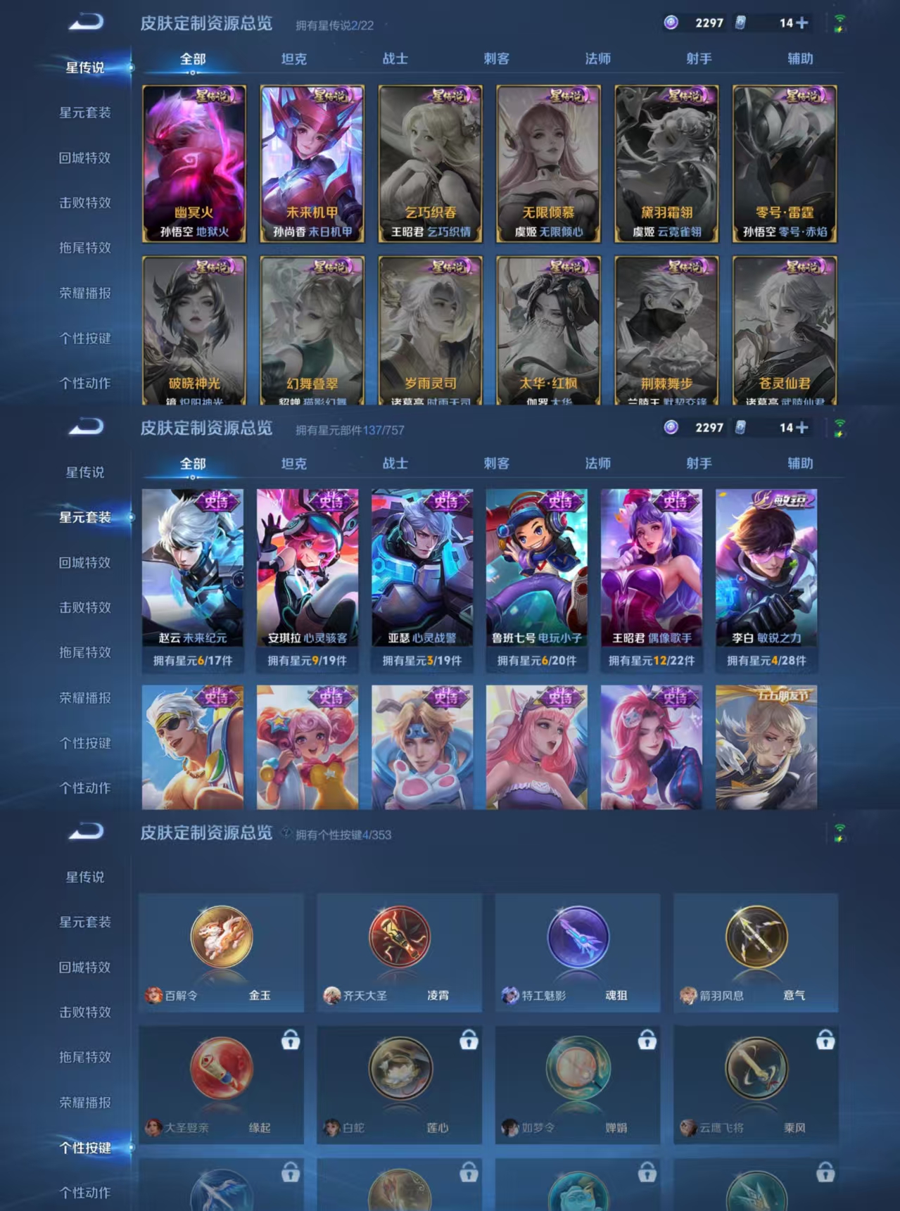【史诗皮肤】 辉光之辰 涂山容容 电玩小子 至尊宝 孙行者 青焰无极 虚灵犬护 谧流熔炉 威尼斯狂欢 罗小黑战记 苍威无极 王牌新星 聚星闪耀 命运加冕 完美运算 百解令 顽岩魄 超时空战士 逆浪荇歌 顽趣 魅力维加斯 猫狗日记 魔术师 鹰眼统帅 箭羽风息 鬼剑武藏 水晶猎龙者 火炮绅士 航海奇遇记 千年之狐 银河之约 胡桃异