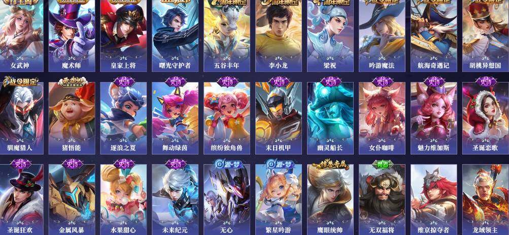 【限定皮肤】:狄仁杰阴阳师,赵云皇家上将,墨子神迹守卫,白起夜都怪侠,周瑜赤莲之焰,元歌无心,夏侯惇朔风刀,典韦穷奇,狄仁杰魔术师,狄仁杰万华元夜,达摩星际陆战队,达摩沙漠行僧,项羽海滩派对,老夫子醍醐杖,老夫子航海奇遇记,程咬金演武夺筹,兰陵王驯魔猎人,兰陵王金庭之子,牛魔御旌,李元芳云中旅人,