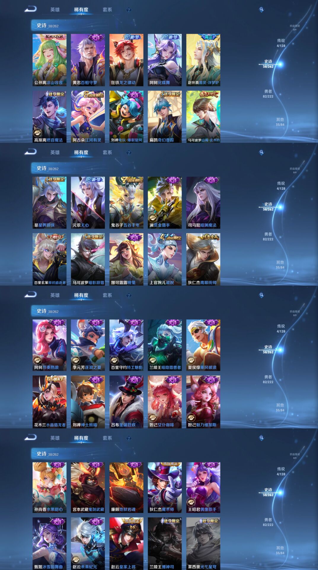 【史诗皮肤】 器灵·浮梦炉 布丁狗之约 谧流熔炉 涂山容容 龙之律动 山海·玄木吟 踏浪烽翎 聚星闪耀 江河有灵 百相守梦 化蝶舞 奇幻香踪 星界游侠 女仆咖啡 魅力维加斯 魔术师 鹰眼统帅 鬼剑武藏 水晶猎龙者 暗隐猎兽者 逐浪之夏 地狱岩魂 绅士熊喵 圣诞狂欢 暗影游猎 晚萤 梁祝 暗渊魔法 水果甜心 偶像歌手 乘风破浪 皇家上将