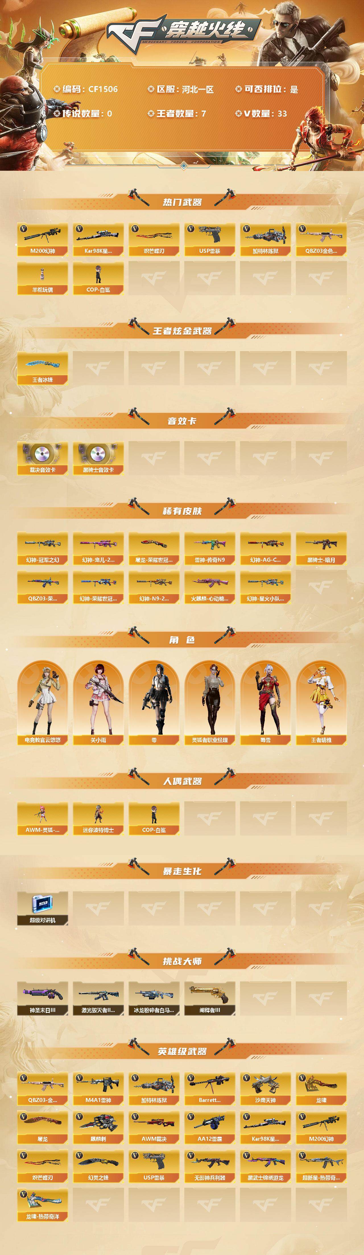 【CF1506】【商品标题】:河北一区-33V-7王者-0炫金【幻神7皮】【【M200-幻神】【幻神-AG-CFPLS24冠军 皮肤】【幻神-星火小队签名臻藏版 皮肤】【幻神-宠儿-2021MVP】【幻神-冠军之幻】【M200-幻神-N9-2022MVP】【M200-幻神-荣耀世冠白鲨】【幻神-AG-CFPLS17冠军】【Kar98K-星神】【AWM-裁决】【AWM-裁决音效卡】【QBZ03-金色蔷薇】【QBZ03-荣耀世冠白鲨】【USP-雷暴】【柯尔特-无冕之王】【炽芒蝶刃】【加特林-炼狱】【