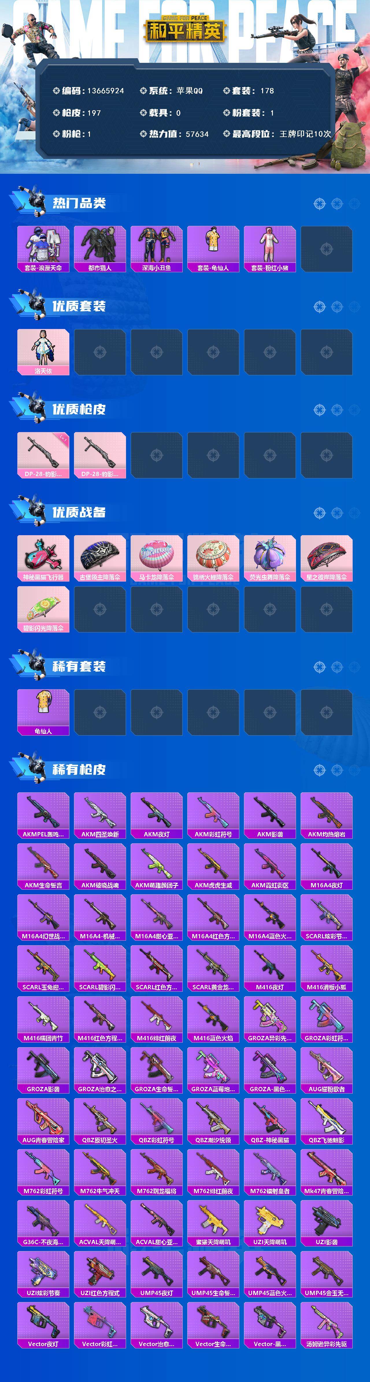 178套装/枪械1/装备211/战备179/王牌印记10/热力值57634/一级DP-28-豹影疾电/套装-浪漫天命/都市猎人/深海小丑鱼/套装-龟仙人/套装-粉红小猪/洛天依/DP-28-豹影疾电/神秘黑猫飞行器/古堡领主降落伞/马卡龙降落伞/锦绣火鲤降落伞/荧光虫舞降落伞/星之彼岸降落伞/碧影闪光降落伞/龟仙人/AKM-PEL轰鸣竞梦者/AKM-四圣焕新/AKM-夜灯/AKM-彩虹符号/AK