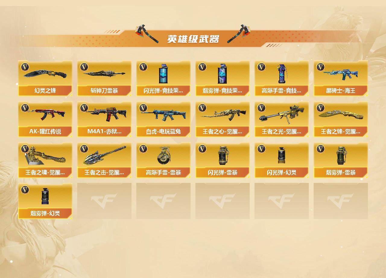 【皮肤】:火麒麟-雷神,毁灭-黑大圣皮肤,天启-暗月,战神-粉色甜心皮肤,战神-紫绶金章皮肤,AK47-B-常胜将军-曹操,AK47-B-常胜将军-刘备*2,AK47-B-常胜将军-孙权*2,擎天-
